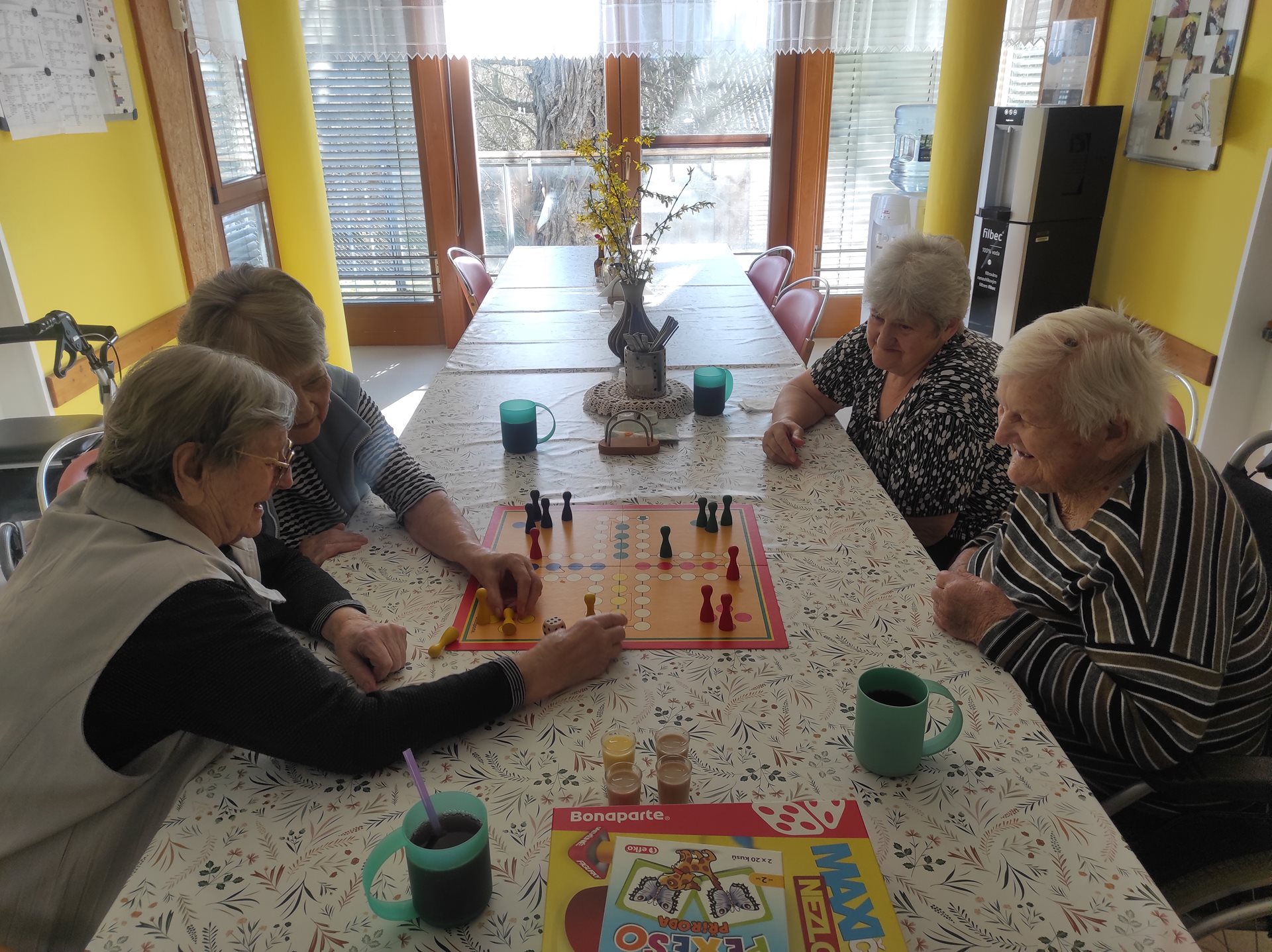 Na čtvrteční kavárničce na uživatelky čekalo překvapení, a to nejen ve formě lahodné kávy a smetanového dezertu, ale čekala na ně i hra Člověče nezlob se. Tato hra ale není ledajaká, pro naše seniorky ji máme v XXL provedení - nejenže jdou velká políčka dobře vidět, ale i figurky a kostka jsou o mnoho větší, než je obvyklé, a tak se s tímto vybavením hraje mnohem lépe, než s klasickou (menší) verzí. Motivací k výhře bylo "štamprle" vaječného koňaku a jako bolestné pro ostatní hráče Baileys. Hráčky, tedy uživatelky, se u hry nesmírně pobavili a dodaly, že se nasmály na dalších 3 roky dopředu :)