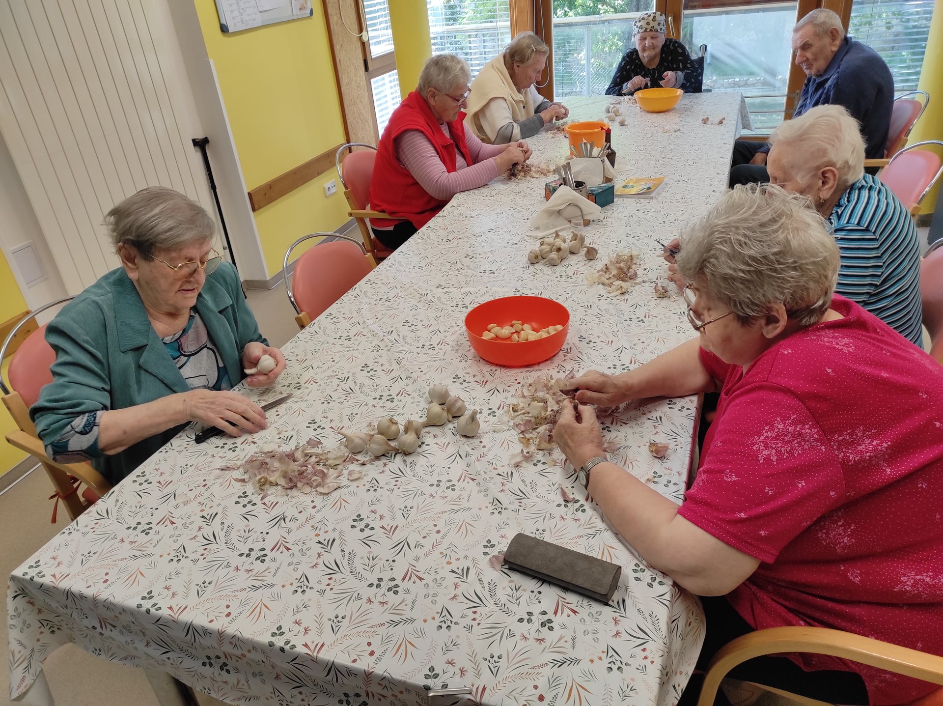 Podzim se k nám pomalými krůčky blíží a tak jsme s uživateli začali v rámci pracovní terapie zpracovávat/ loupat česnek. Chviličku poté, co jsme začali se česnek rozvoněl celým oddělením a každému se sbíhaly sliny na všechny pokrmy, které máme spjaté s česnekem - langoše, topinky, tatarák či bramboráky. Silice z česneku byly tak silné, že nám ve studeném dopoledni krásně pročistily a uvolnily nosní dutiny.