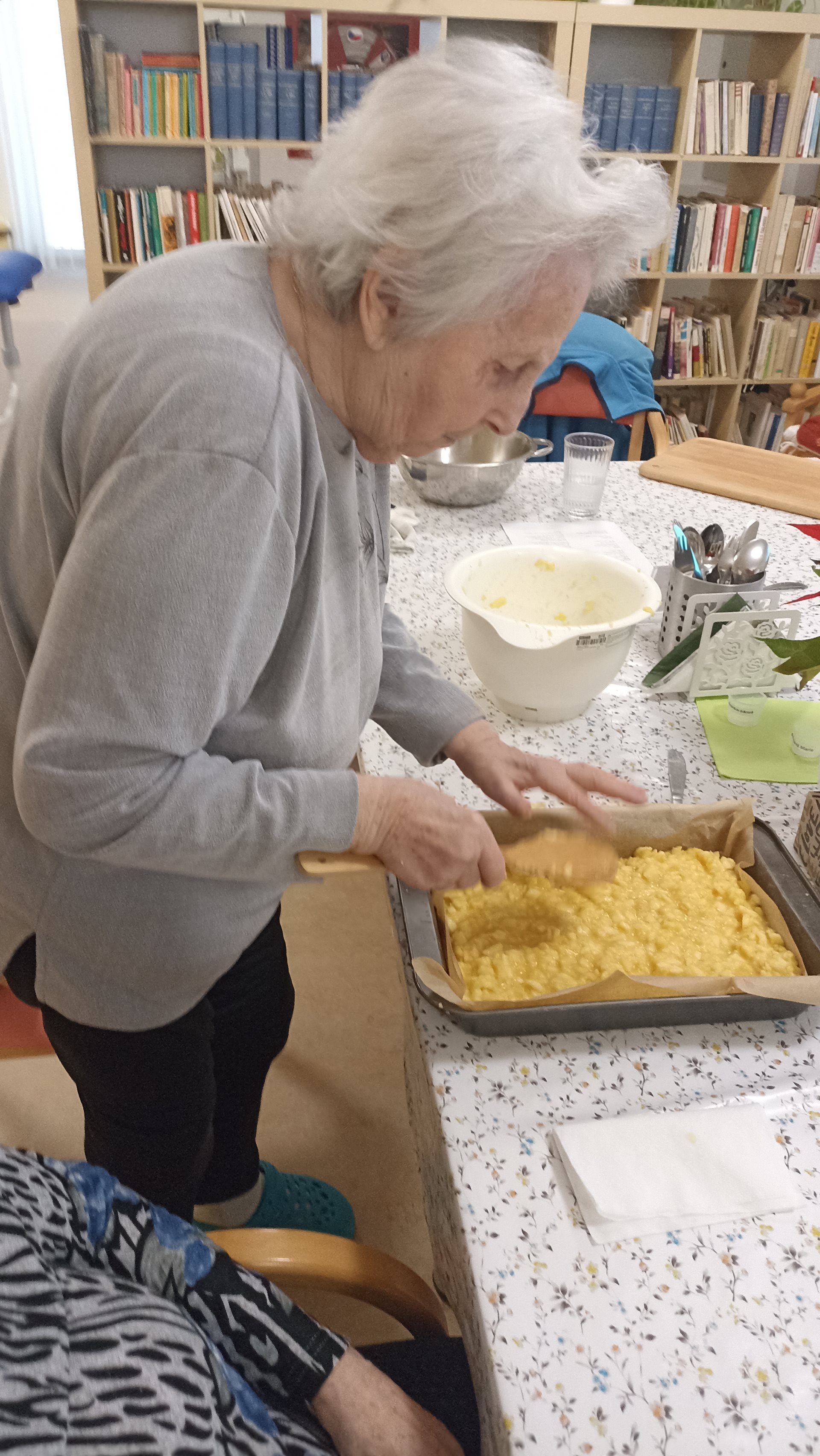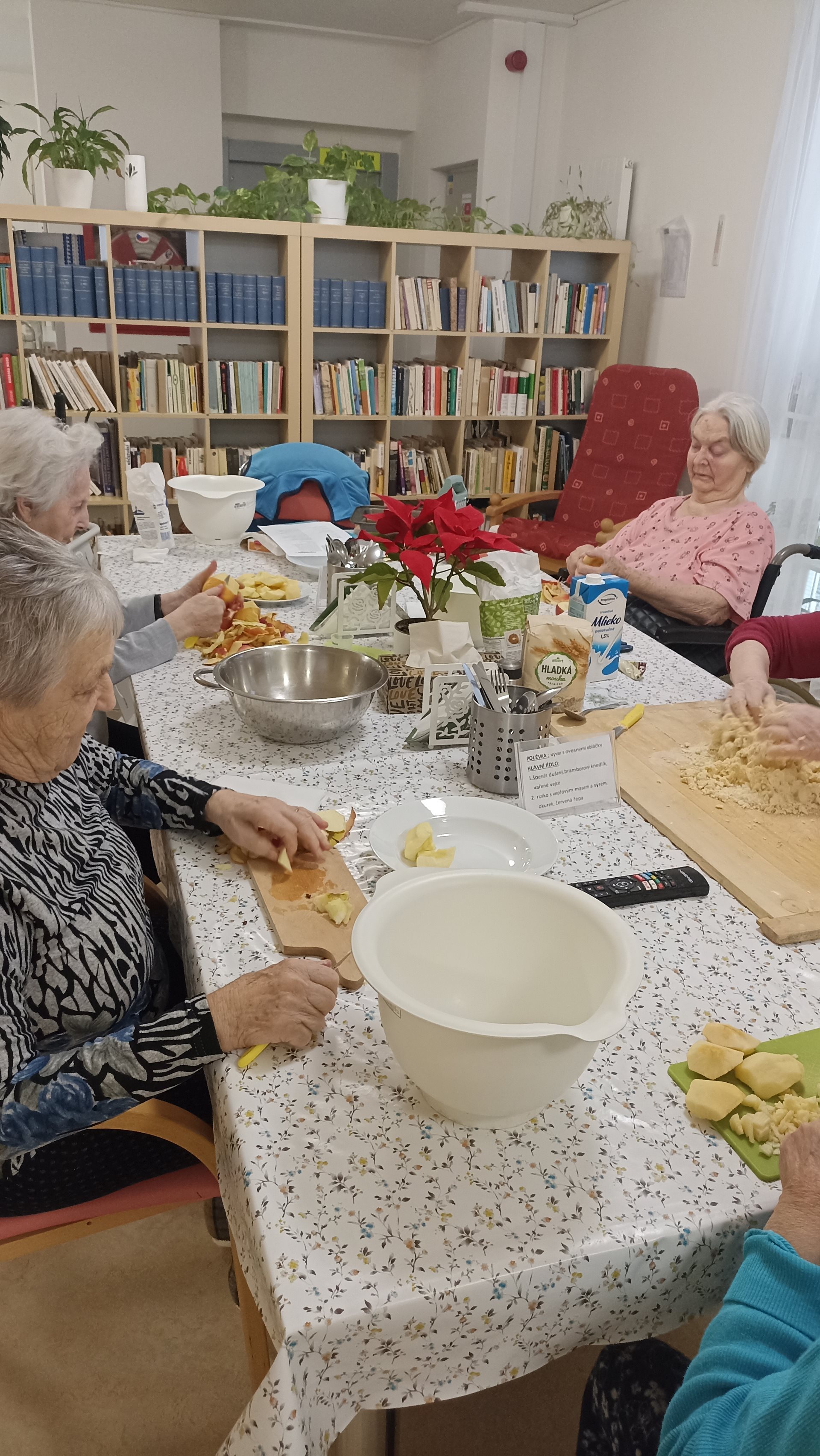 Čtvrteční dopoledne jsme s uživatelkami strávily v pavilonu B a pekly Křehký koláč s jablíčky. Uživatelky mají tuto aktivitu velmi rády, procvičí si jemnou motoriku a zavzpomínají si jak pekly doma. Někdy bývá i velice živá debata ohledně ingrediencí, protože každá doma pekla dle sebe. Nakonec je výsledek sladký a uživatelky si pochutnají na moučníku při odpolední kávě, kde se pobaví o tom, co se bude péct příště.