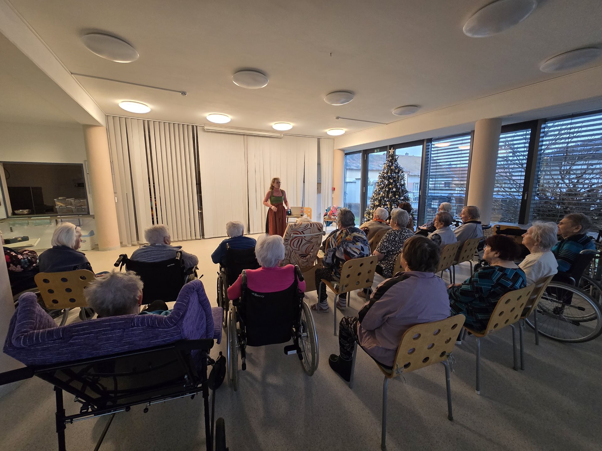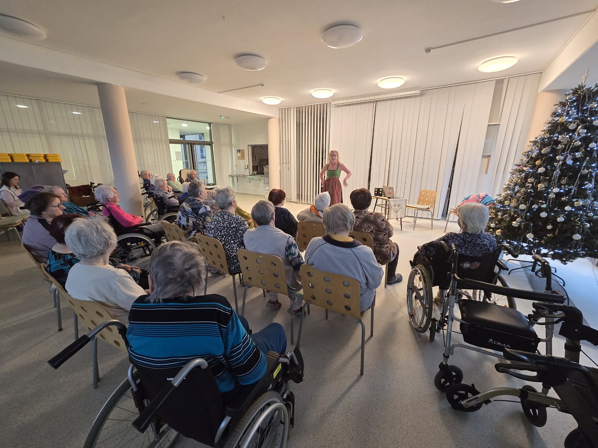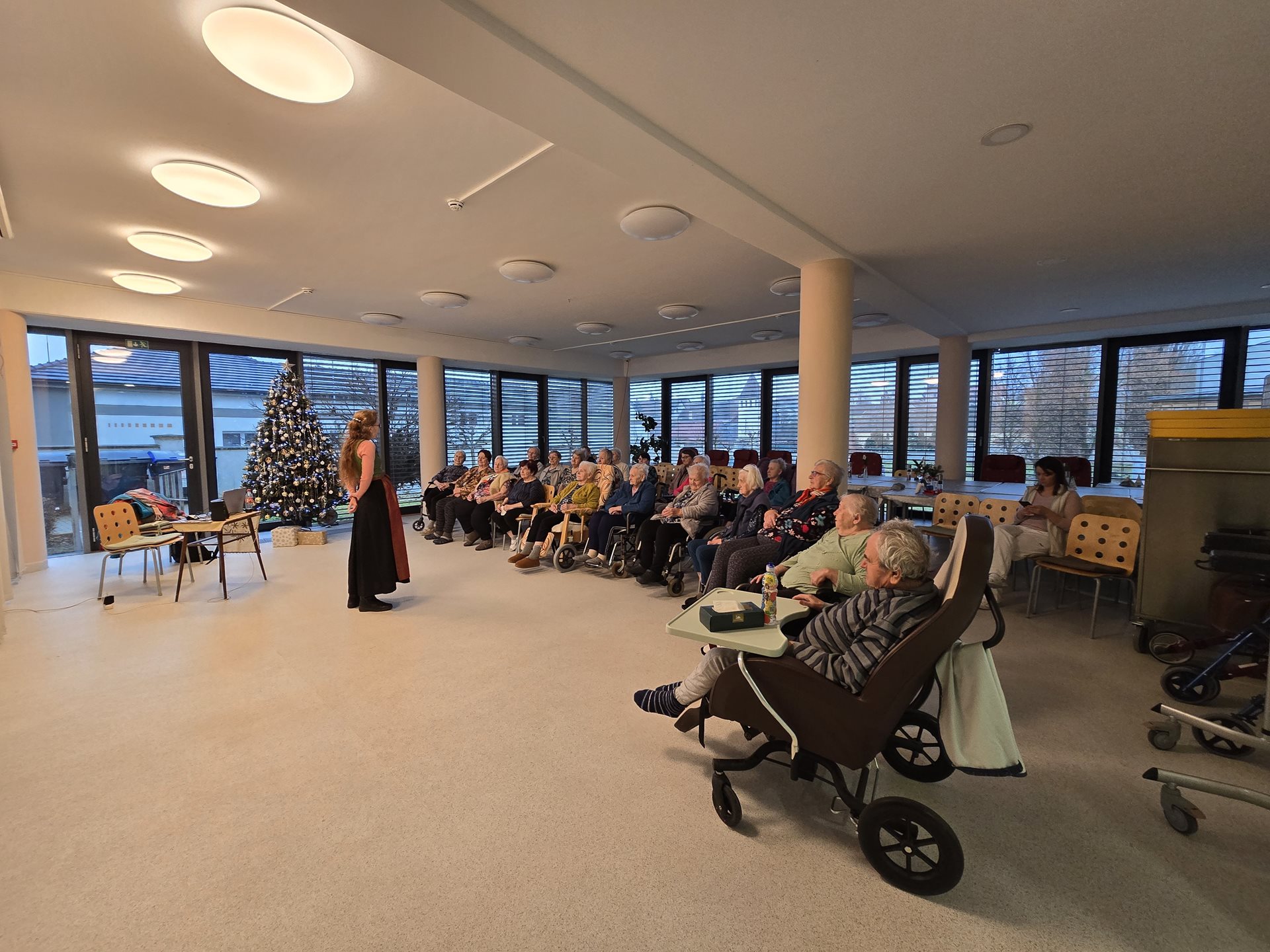 Rádi bychom se s vámi podělili o příjemnou událost, která se uskutečnila v našem domově pro seniory nyní před Vánoci. Ve společné jídelně proběhla tematická přednáška věnovaná vánočním koledám – jejich vzniku, historickému vývoji i podobě, v jaké je známe dnes. Program byl doplněn o poslech známých i méně známých koled, které navodily klidnou a sváteční atmosféru. Přednáška se setkala s velmi pozitivním ohlasem a těšila se velké účasti našich uživatelek. Setkání probíhalo v přátelském duchu a přineslo nejen nové informace, ale především radost ze společně stráveného času. Děkujeme paní Šimkové za skvělou besedu i všem účastníkům za milou atmosféru. Věříme, že podobná setkání budeme moci v budoucnu opět zopakovat.