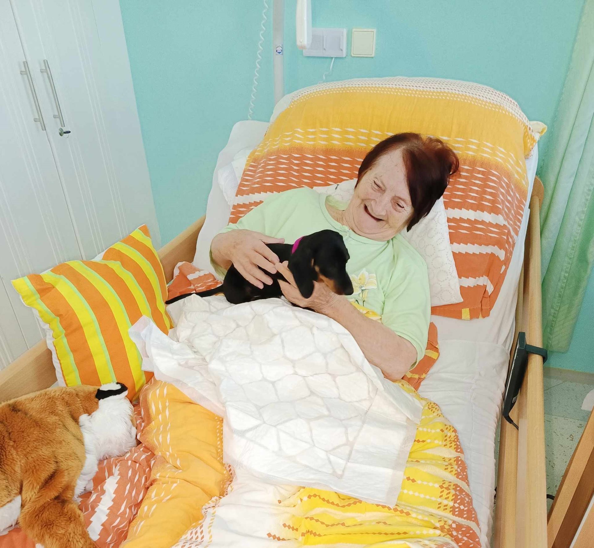 Úterní odpoledne nás svojí návštěvou poctila naše zaměstnankyně spolu se svým pejskem - fenkou Ladynkou. Všem uživatelkám se takto strávené odpoledne moc líbilo, jelikož všechny naše uživatelky mají moc rády zvířata, hlavně tedy pejsky. Ladynka, která je ještě štěnátko, byla taktéž velmi spokojená s návštěvou, jelikož to vypadlo, že se jí u našich uživatelek moc líbí - hlavně tedy na lůžku - v teple.