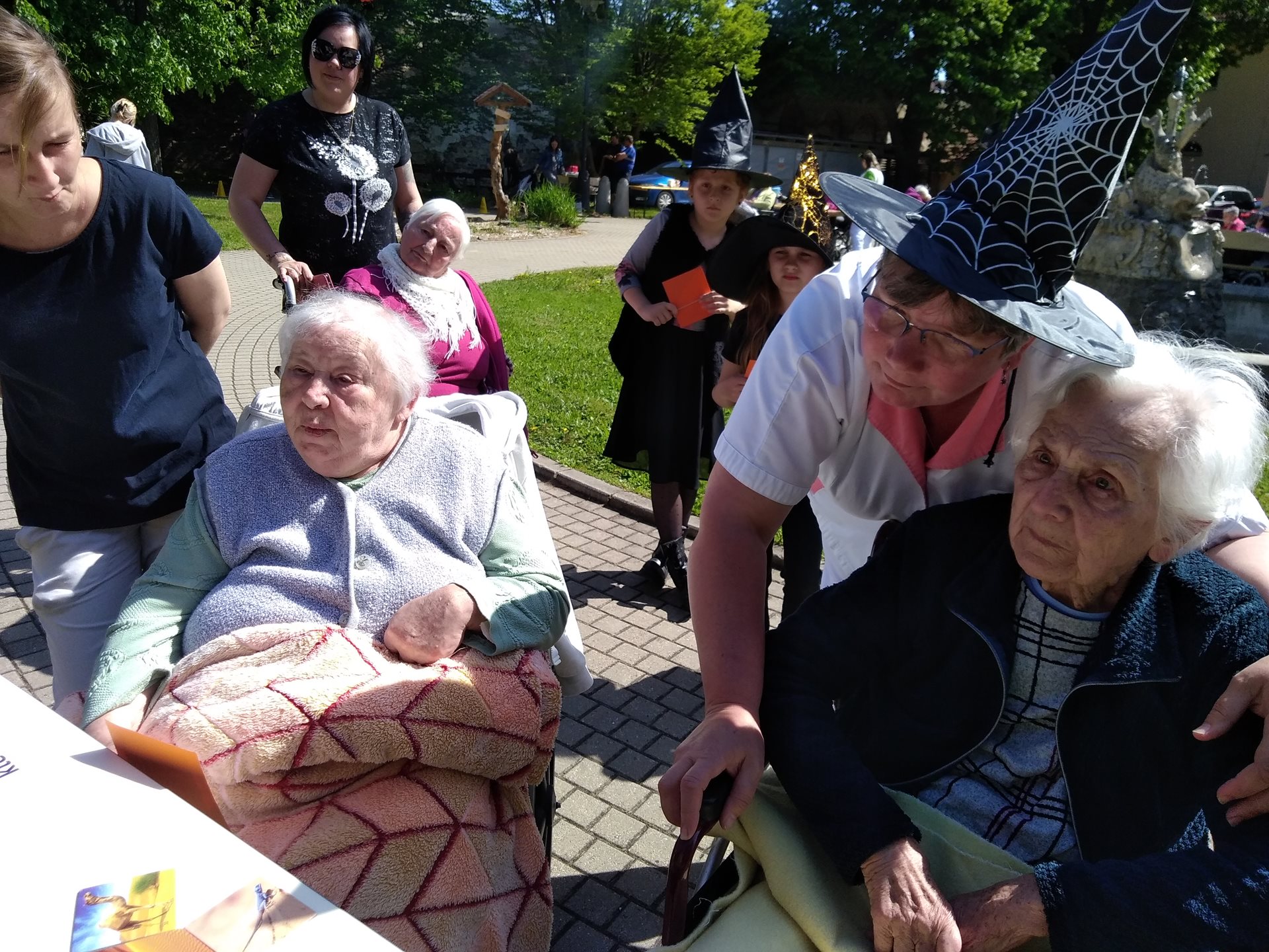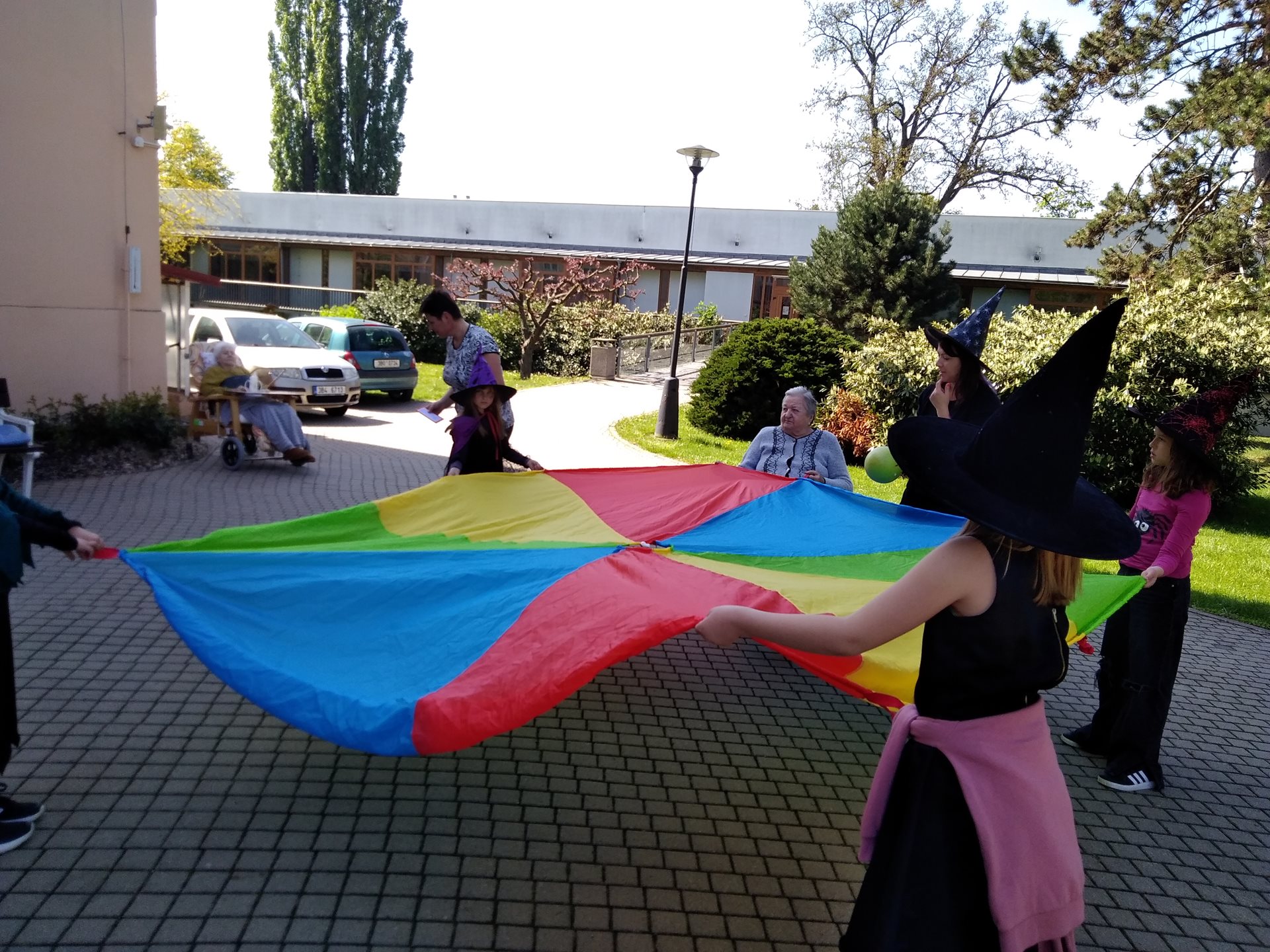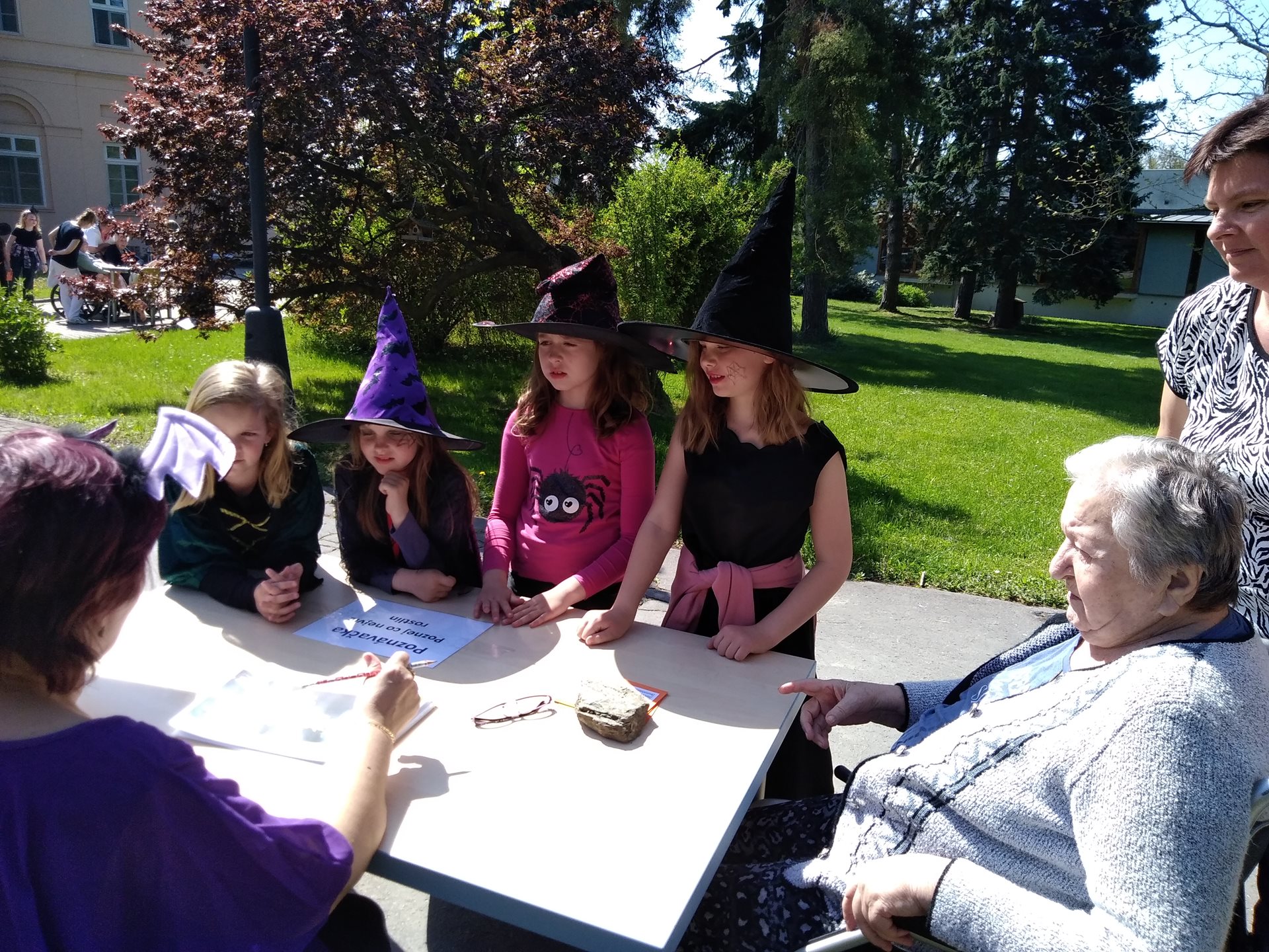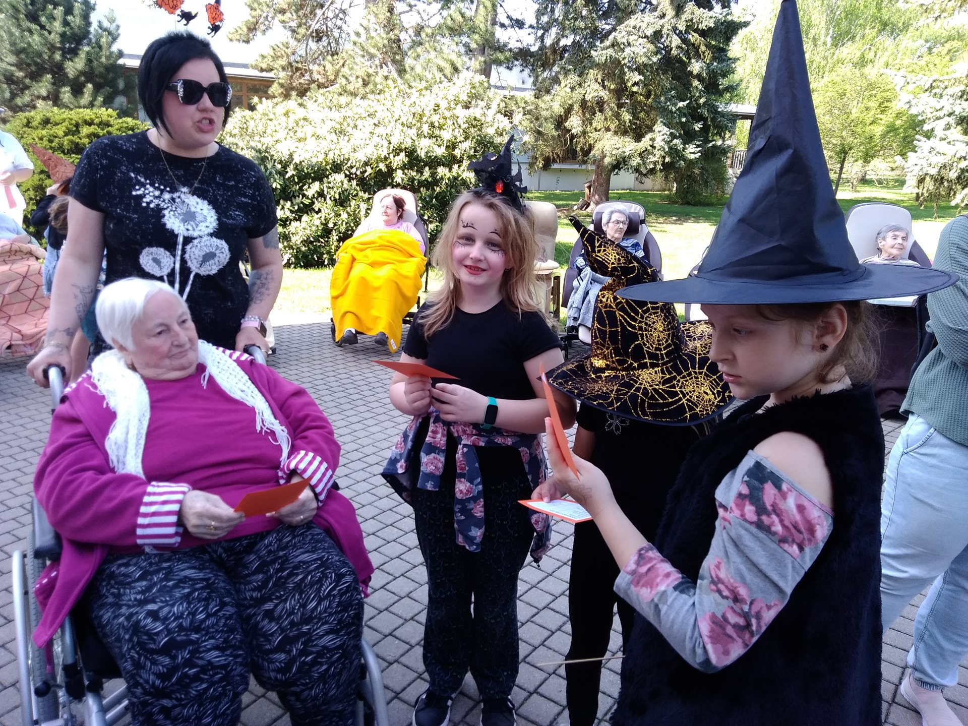Konec dubna se blíží a květen nám klepe na dveře. A to bychom nebyli my, kdyby se u nás v zařízení nekonal Čarodějnický rej s dětmi z místní základní školy. Počasí nám letos vskutku královsky přálo, a tak jsme se za svitu sluníčka setkali u kašny před domovem, kde jsme se rozřadili do 5-ti členných družstev, z nichž 4 byly děti a 1 seniorka. Každý tým se společně musel prosoutěžit 8 disciplínami, které potrápili nejen ruce a nohy, ale také paměť, soustředění a koordinaci oko - ruka. Během plnění disciplín hrála veselá hudba, špekáčky voněly z grilu a sem tam se ozývaly veselé výkřiky dětí či uznalé tleskání uživatelek a personálu. Každý z týmu si pochutnal na špekáčku a za splněné úkoly dostal sladkou odměnu. Bylo to příjemně strávené dopoledne plné smíchu a radosti.