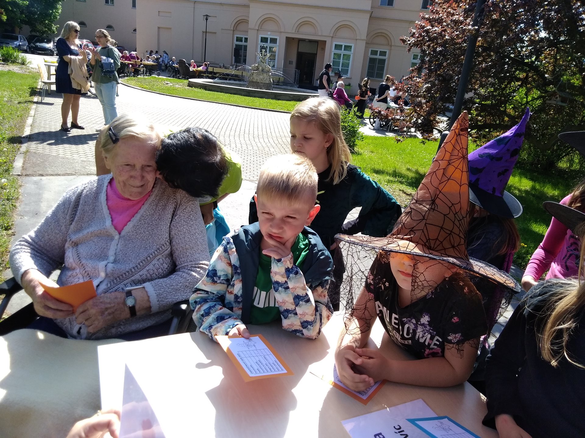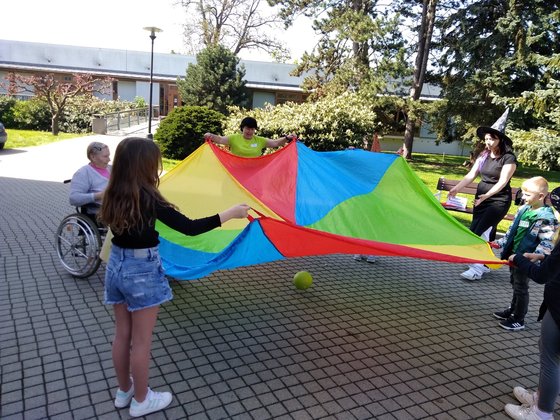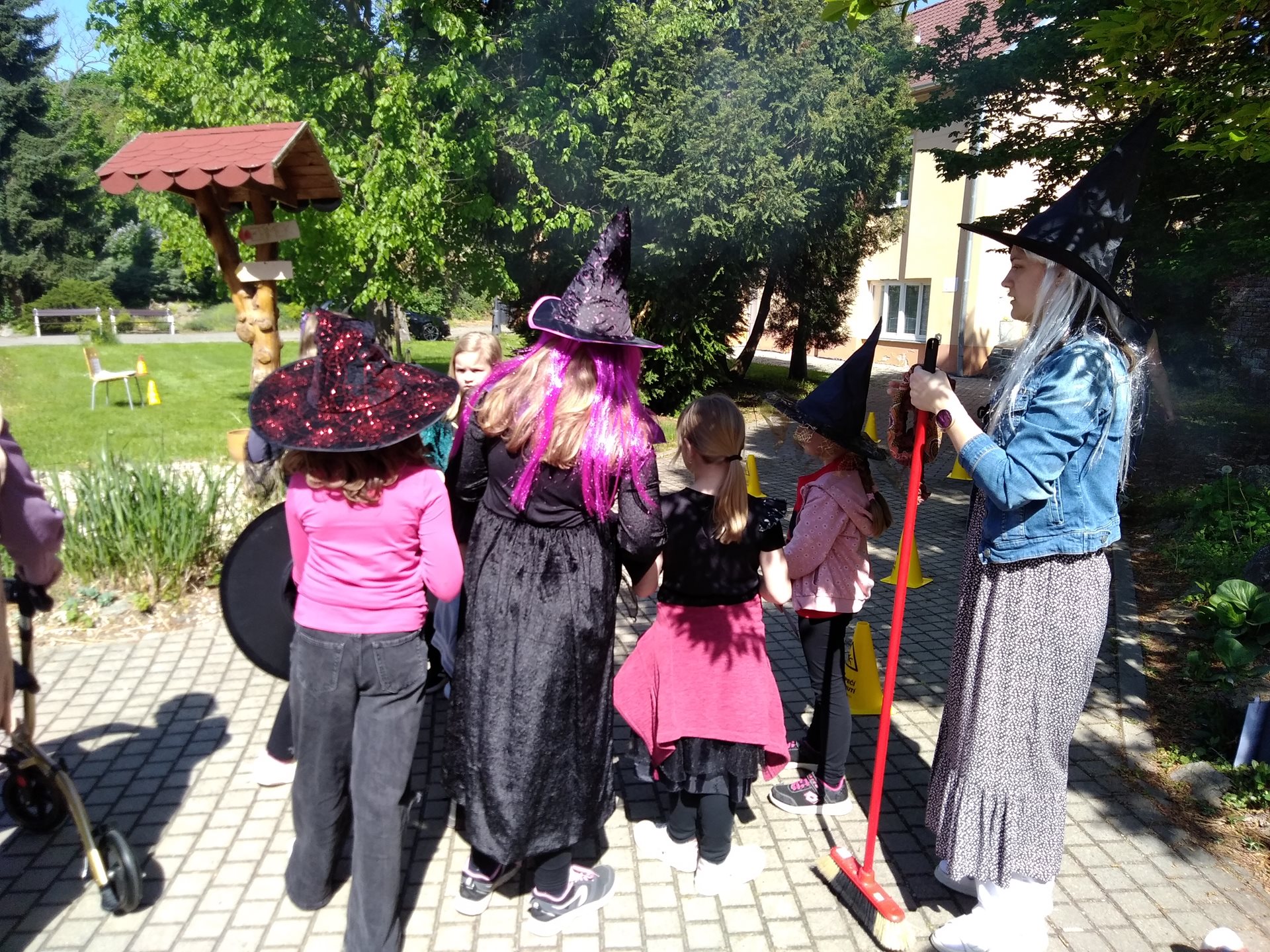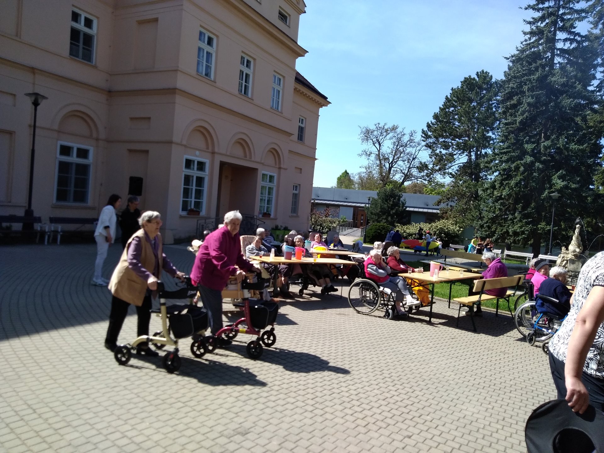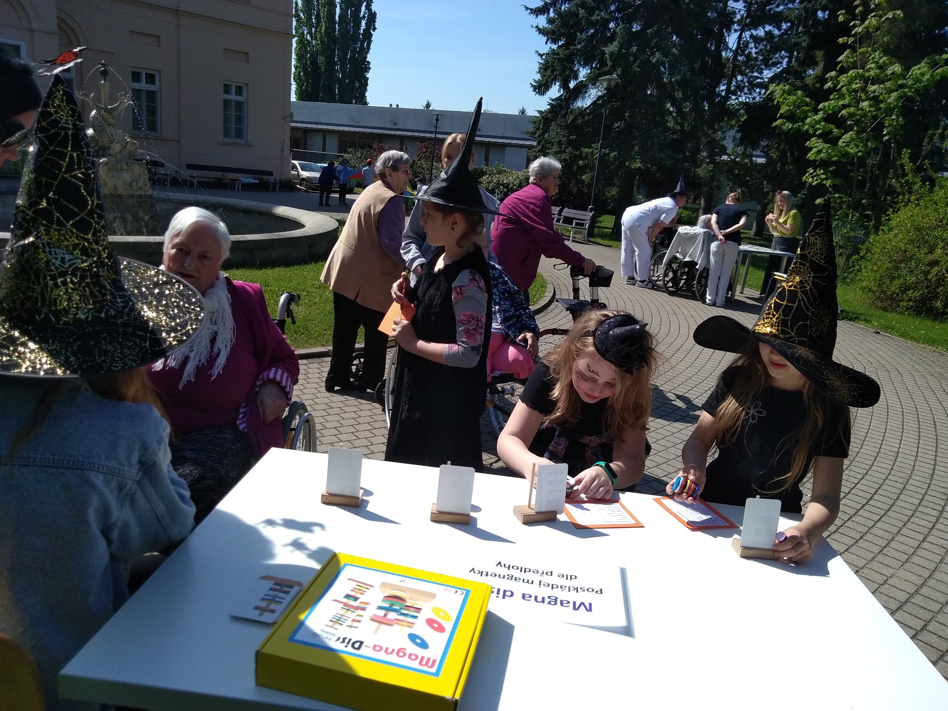 Konec dubna se blíží a květen nám klepe na dveře. A to bychom nebyli my, kdyby se u nás v zařízení nekonal Čarodějnický rej s dětmi z místní základní školy. Počasí nám letos vskutku královsky přálo, a tak jsme se za svitu sluníčka setkali u kašny před domovem, kde jsme se rozřadili do 5-ti členných družstev, z nichž 4 byly děti a 1 seniorka. Každý tým se společně musel prosoutěžit 8 disciplínami, které potrápili nejen ruce a nohy, ale také paměť, soustředění a koordinaci oko - ruka. Během plnění disciplín hrála veselá hudba, špekáčky voněly z grilu a sem tam se ozývaly veselé výkřiky dětí či uznalé tleskání uživatelek a personálu. Každý z týmu si pochutnal na špekáčku a za splněné úkoly dostal sladkou odměnu. Bylo to příjemně strávené dopoledne plné smíchu a radosti.