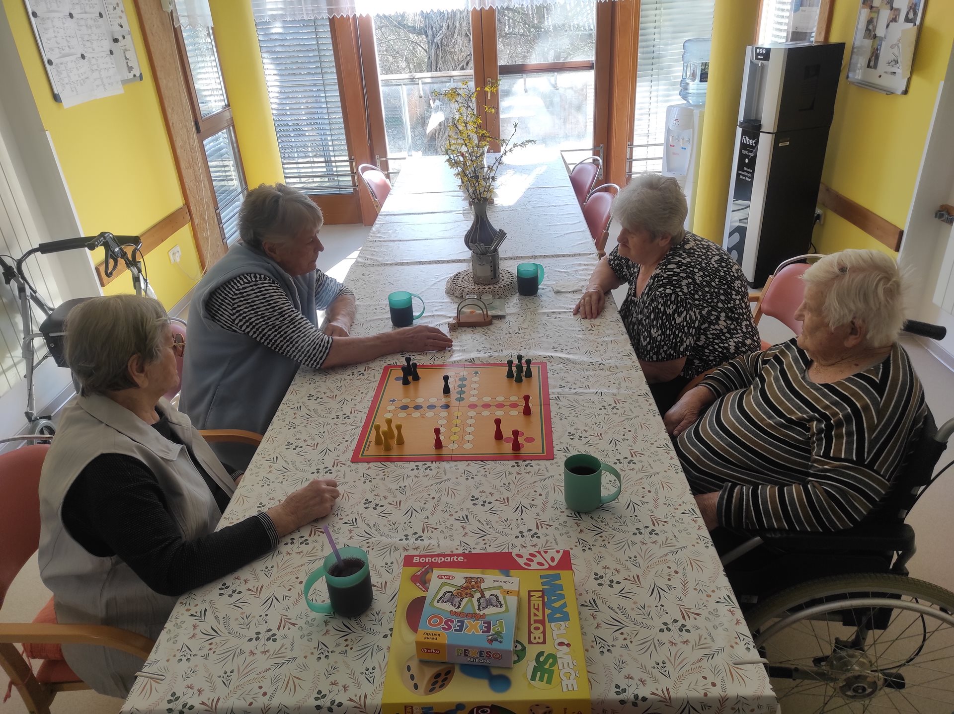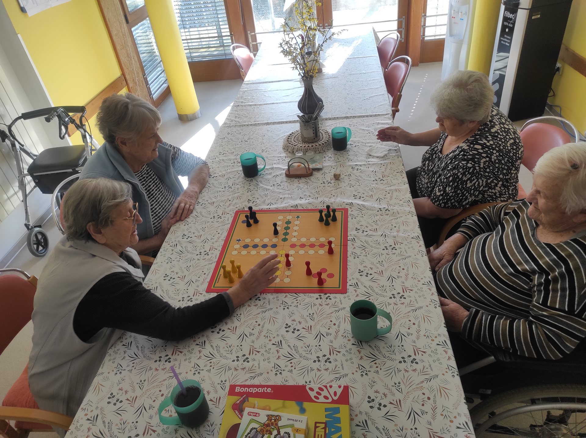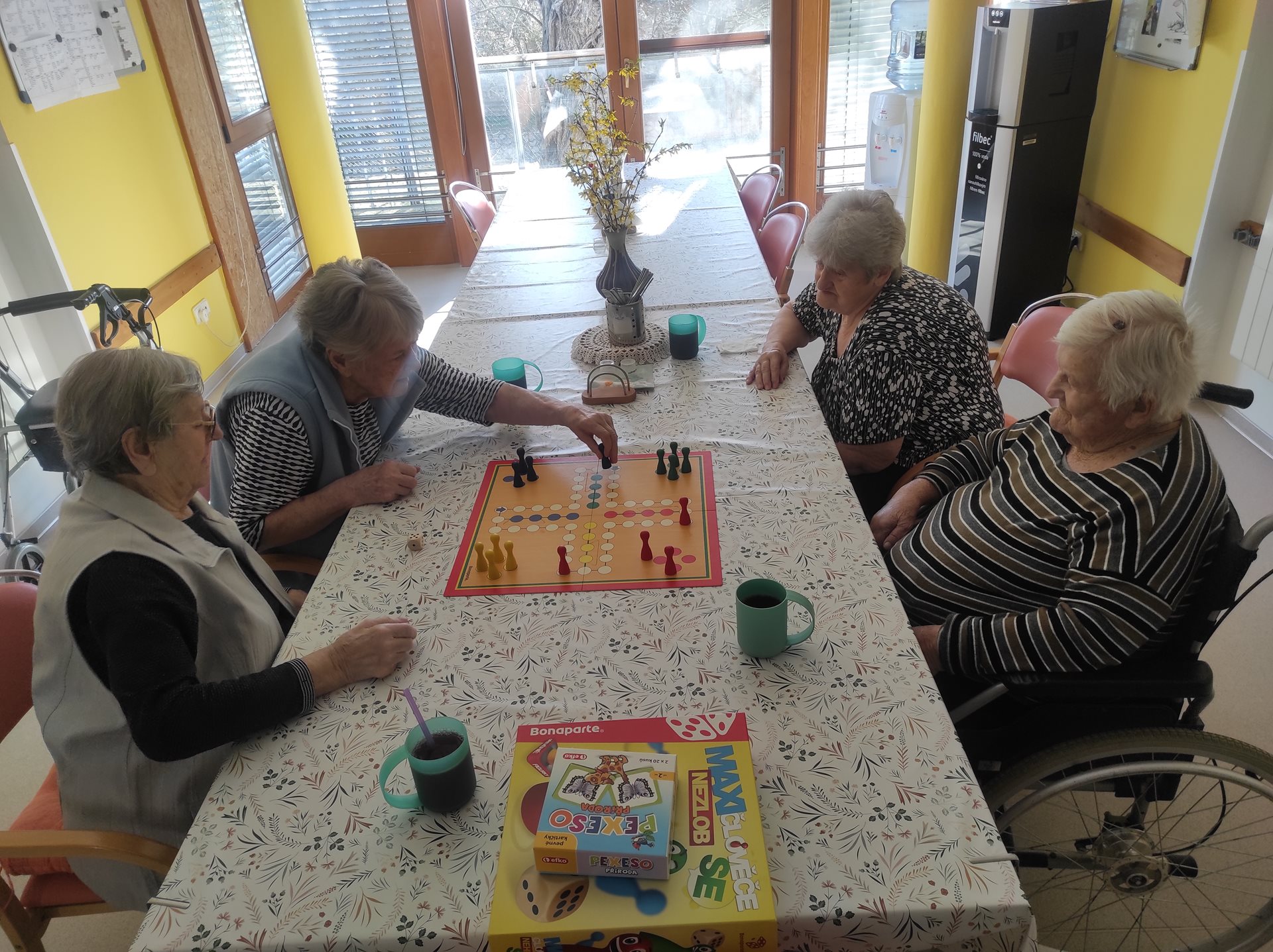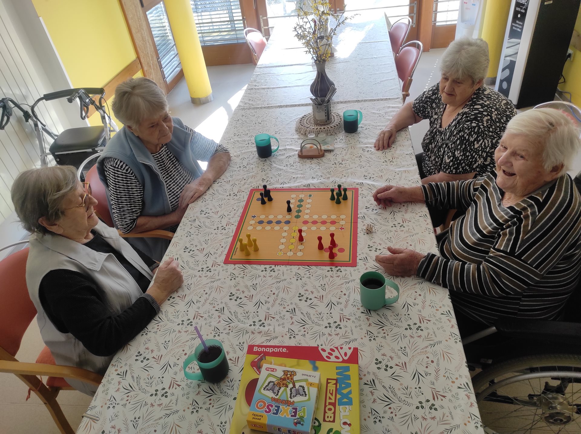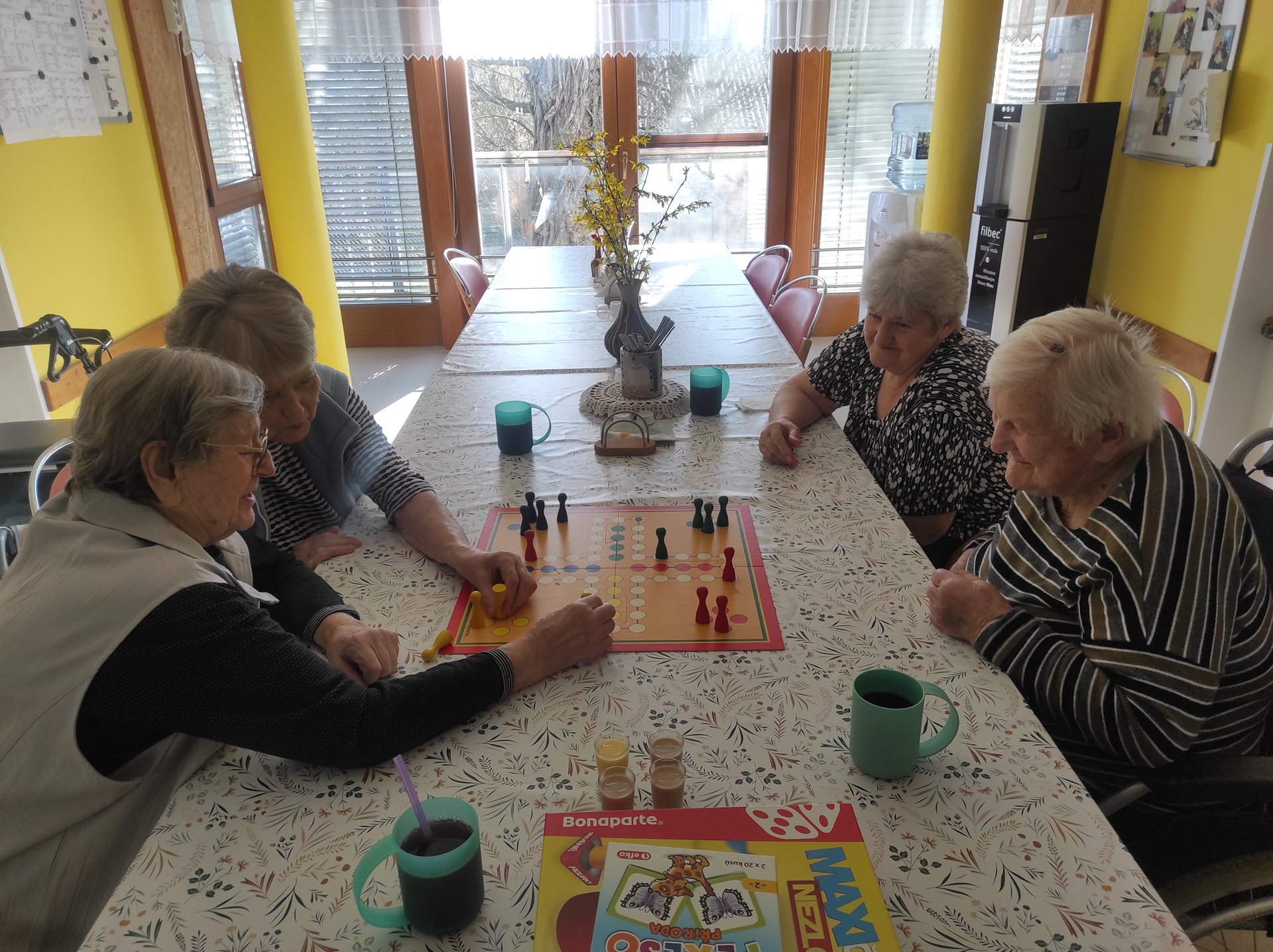 Na čtvrteční kavárničce na uživatelky čekalo překvapení, a to nejen ve formě lahodné kávy a smetanového dezertu, ale čekala na ně i hra Člověče nezlob se. Tato hra ale není ledajaká, pro naše seniorky ji máme v XXL provedení - nejenže jdou velká políčka dobře vidět, ale i figurky a kostka jsou o mnoho větší, než je obvyklé, a tak se s tímto vybavením hraje mnohem lépe, než s klasickou (menší) verzí. Motivací k výhře bylo "štamprle" vaječného koňaku a jako bolestné pro ostatní hráče Baileys. Hráčky, tedy uživatelky, se u hry nesmírně pobavili a dodaly, že se nasmály na dalších 3 roky dopředu :)