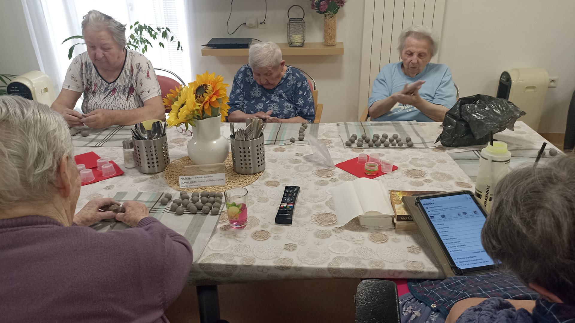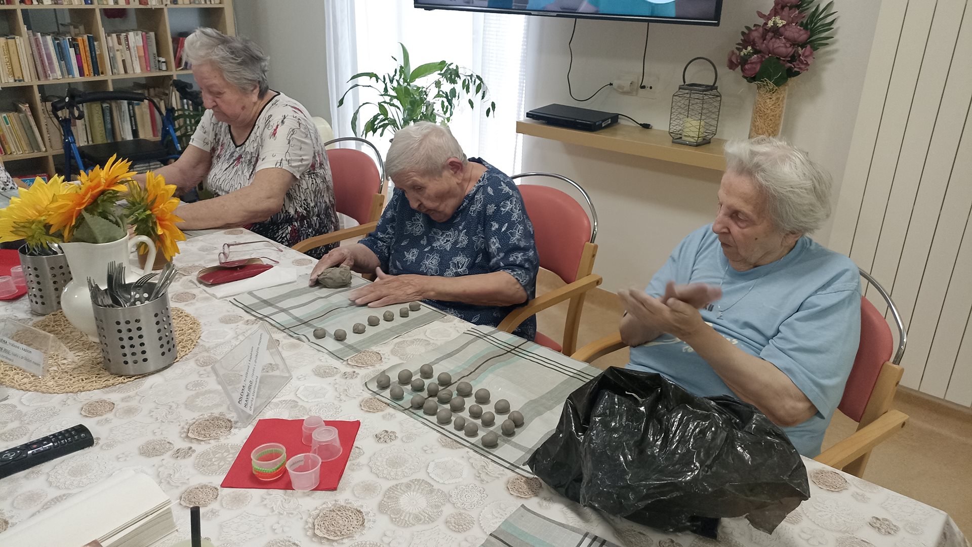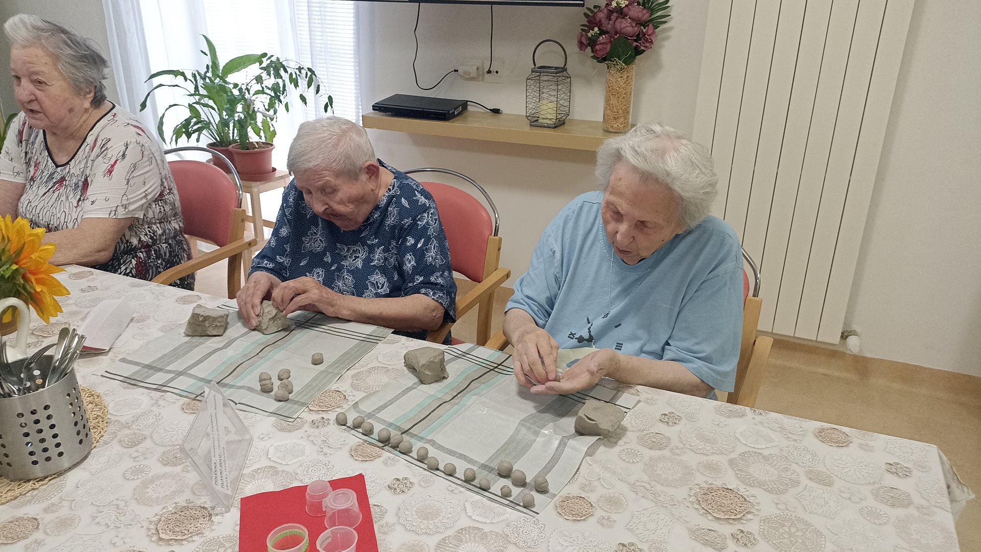 Na našem oddělení jsme si opět užili tvůrčí dopoledne v rámci keramické dílny. Práce s hlínou přináší našim uživatelům nejen radost, ale i možnost procvičit jemnou i hrubou motoriku. Tentokrát jsme se věnovali výrobě malých kuliček, které budou později využity při další keramické tvorbě. Manipulace s hlínou má blahodárný účinek – podporuje cit v prstech, uvolňuje napětí a rozvíjí kreativitu. Současně se při práci často rozproudí vzpomínky na dětství či mládí, kdy byla hlína běžnou součástí her nebo práce na zahradě. Tyto chvíle přirozeně navazují na reminiscenční terapii, která pomáhá posilovat paměť a dobrou náladu. Keramická dílna tak spojuje příjemné s užitečným – naši uživatelé odcházejí s pocitem spokojenosti, že vlastníma rukama vytvořili něco, co bude mít další využití a potěší i ostatní.