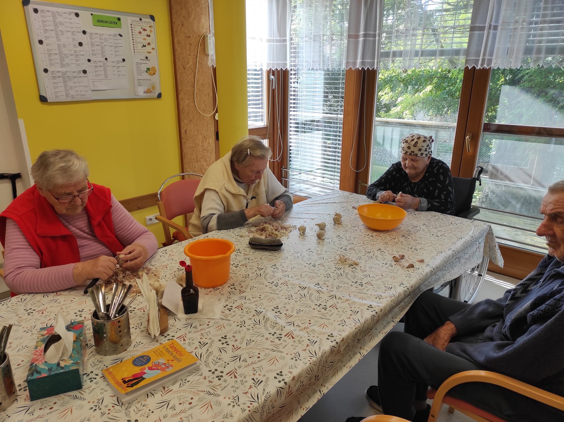 Podzim se k nám pomalými krůčky blíží a tak jsme s uživateli začali v rámci pracovní terapie zpracovávat/ loupat česnek. Chviličku poté, co jsme začali se česnek rozvoněl celým oddělením a každému se sbíhaly sliny na všechny pokrmy, které máme spjaté s česnekem - langoše, topinky, tatarák či bramboráky. Silice z česneku byly tak silné, že nám ve studeném dopoledni krásně pročistily a uvolnily nosní dutiny.