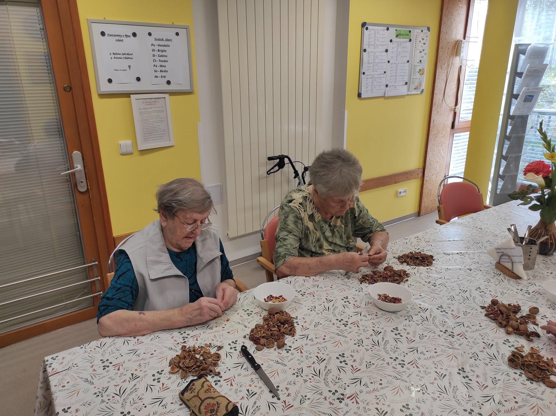 Tento týden jsme s uživatelkami v rámci skupinové aktivizace zpracovávaly velkou spoustu jablek, strouhaly a krájely jsme je na větší i menší kousky, aby se posléze mohly použít na štrúdl, nepečený jablečný dort či jen na jablečno-pudinkový dezert. Myslíme také na to, že cca za 2 měsíce budeme slavit Vánoce, a tak jsme se pustily do vyloupávání ořechů na vánoční cukroví. Při práci nám hrála lidová a dechová hudba z rádia a vzduchem se linula vůně zpracováváných potravin. S uživatelkami jsme si i potrénovaly paměť nad tím, do jakého cukroví či pokrmů se ořechy dávají. Bylo to hezky strávené voňavé dopoledne.