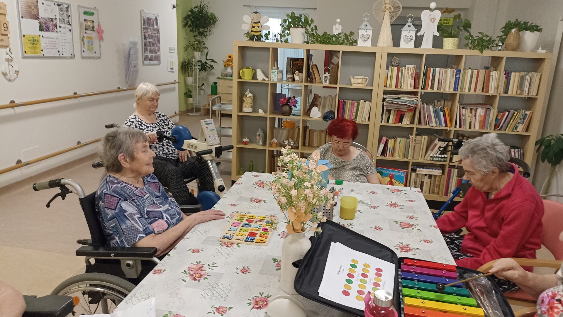 Při dopolední aktivizaci měli naši uživatelé možnost si vyzkoušet. Boomwhackers. Tento nástroj vypadá a trošku i zní jako xylofon, je vytvořen z barevně odlišných kovových válců. Jednotlivé části se můžou použít zvlášť nebo dohromady tak jako xylofon. Tato zvonkohra nadchla nejen uživatele, ale i některé zaměstnance. Jedná se o velmi jednoduchý hudební nástroj, který nevyžaduje žádné hudební znalosti a s trochou tréninku se na něj dá velmi rychle naučit hrát jednoduché známé písničky. V rytmu hudby si některé uživatelky i procvičily dolní končetiny šlapáním na motomedu a jiné zase jemnou motoriku.