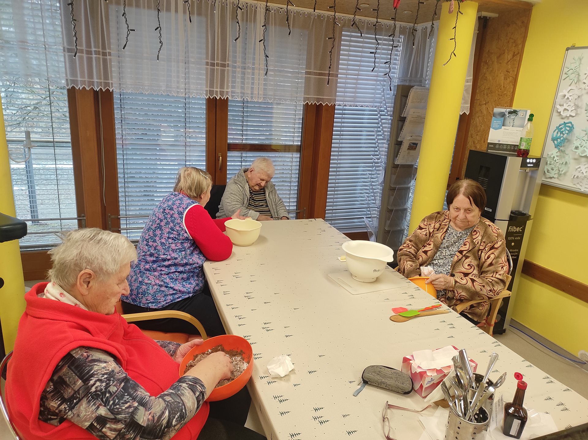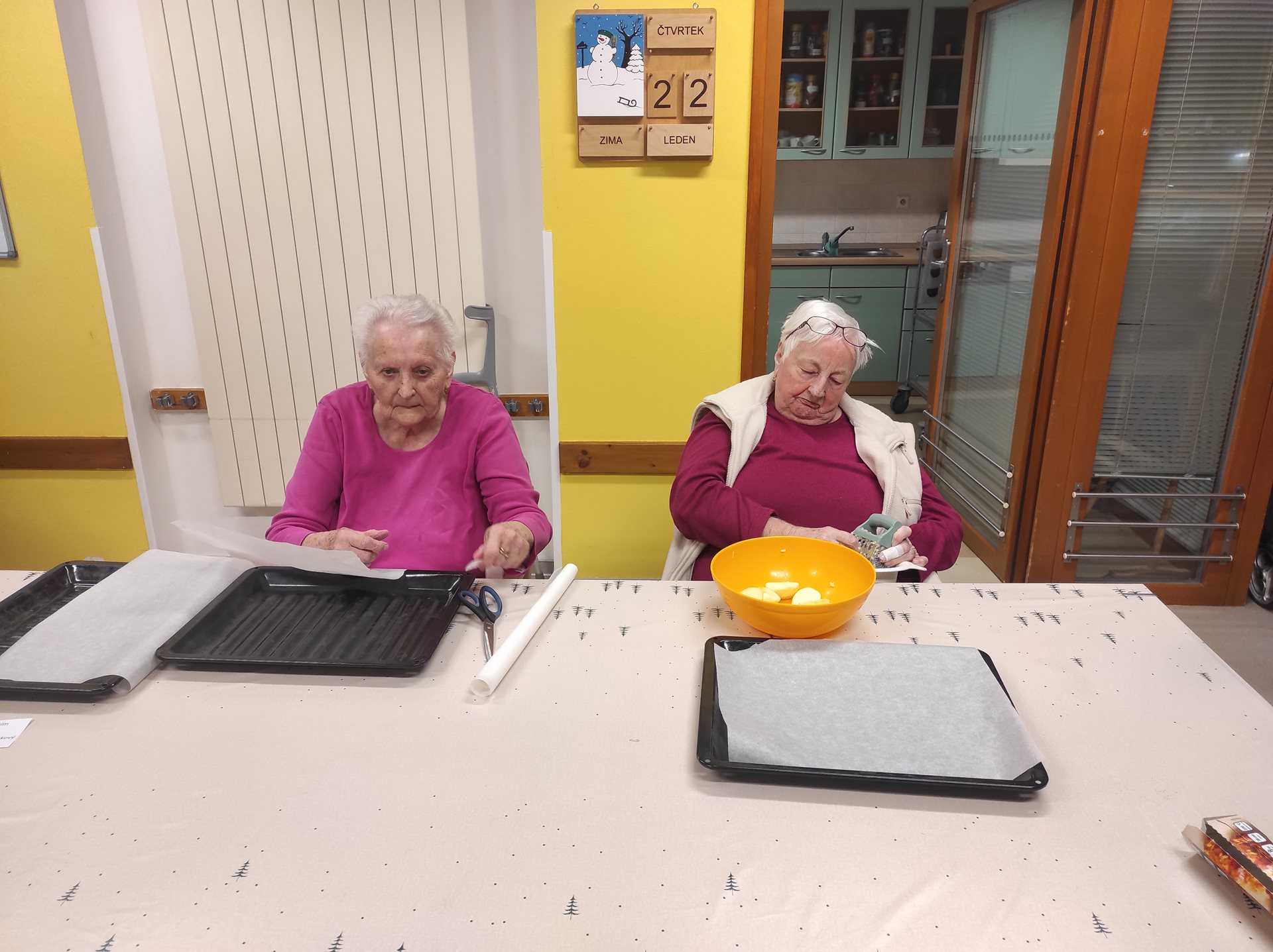 Čtvrteční ráno zavonělo jablky, skořicí a kakaem. V pavilonu A se pekla bábovka z postrouhaných jablek a koulely se sádlové důlky plněné rybízovou marmeládou. Každý, kdo mohl se do práce s chutí zapojil a za 2 hodiny bylo dílo hotové. Bábovku i důlky pak měli možnost ochutnat všichni uživatelé pavilonu s odpolední kávou.