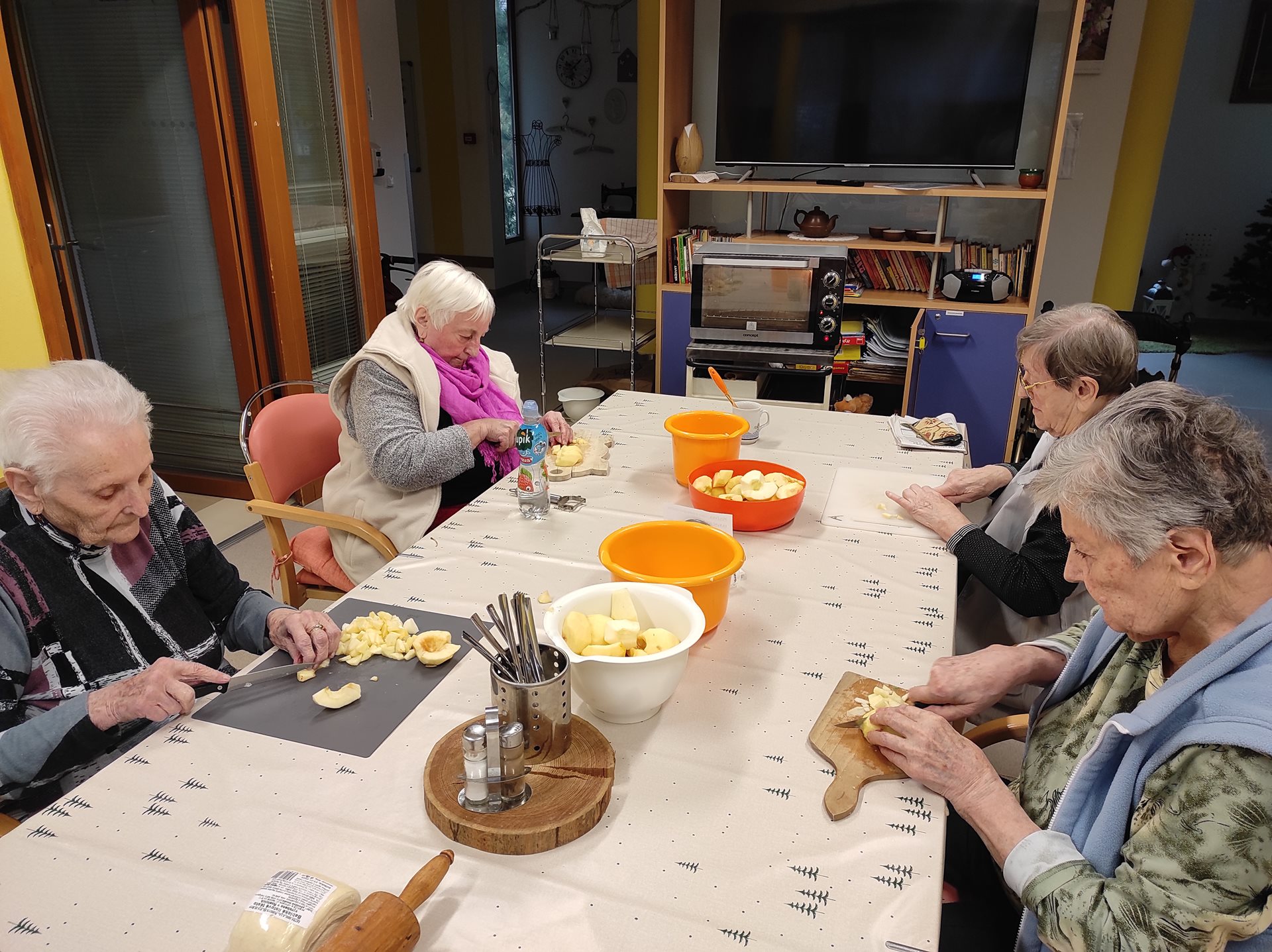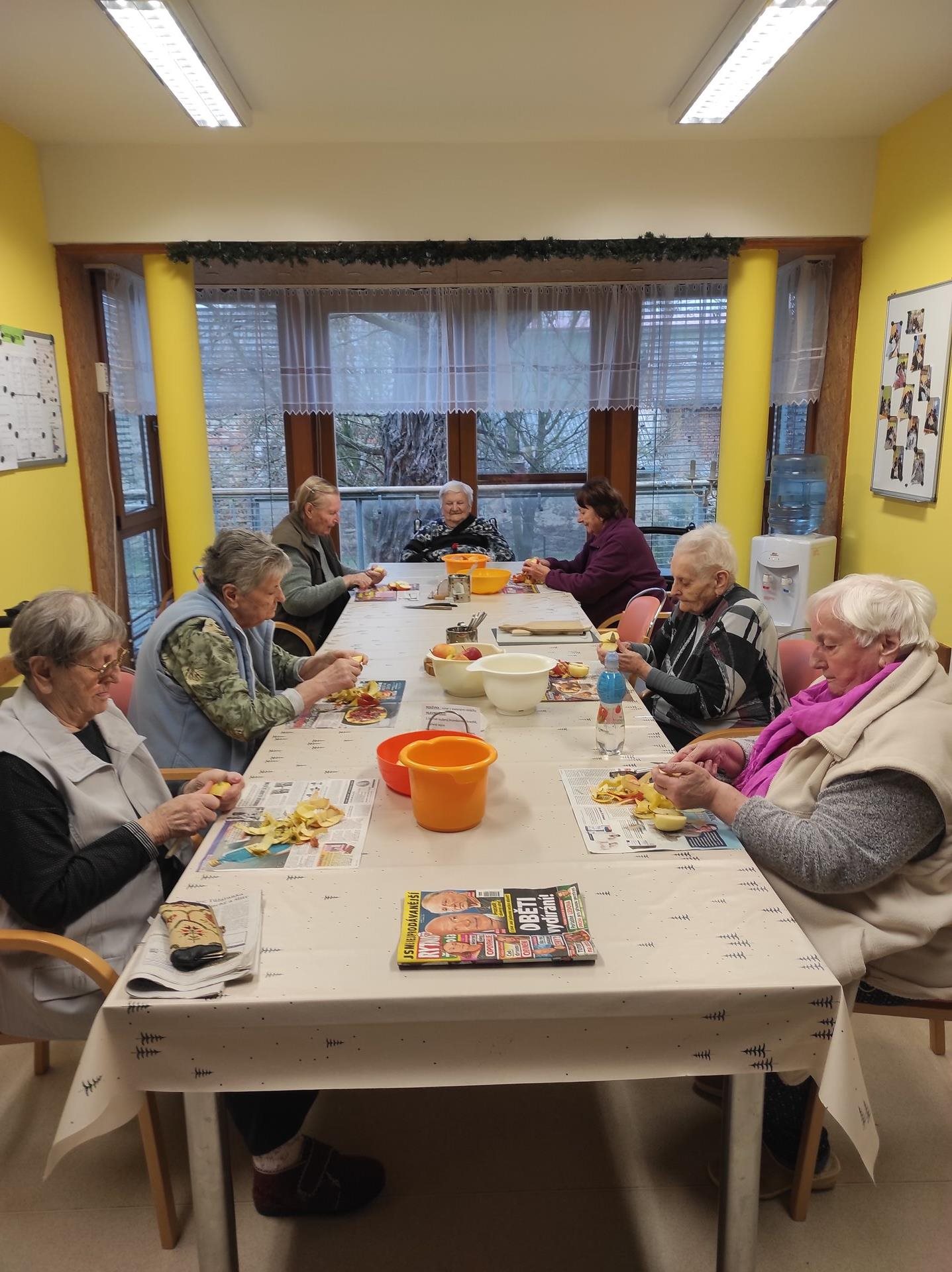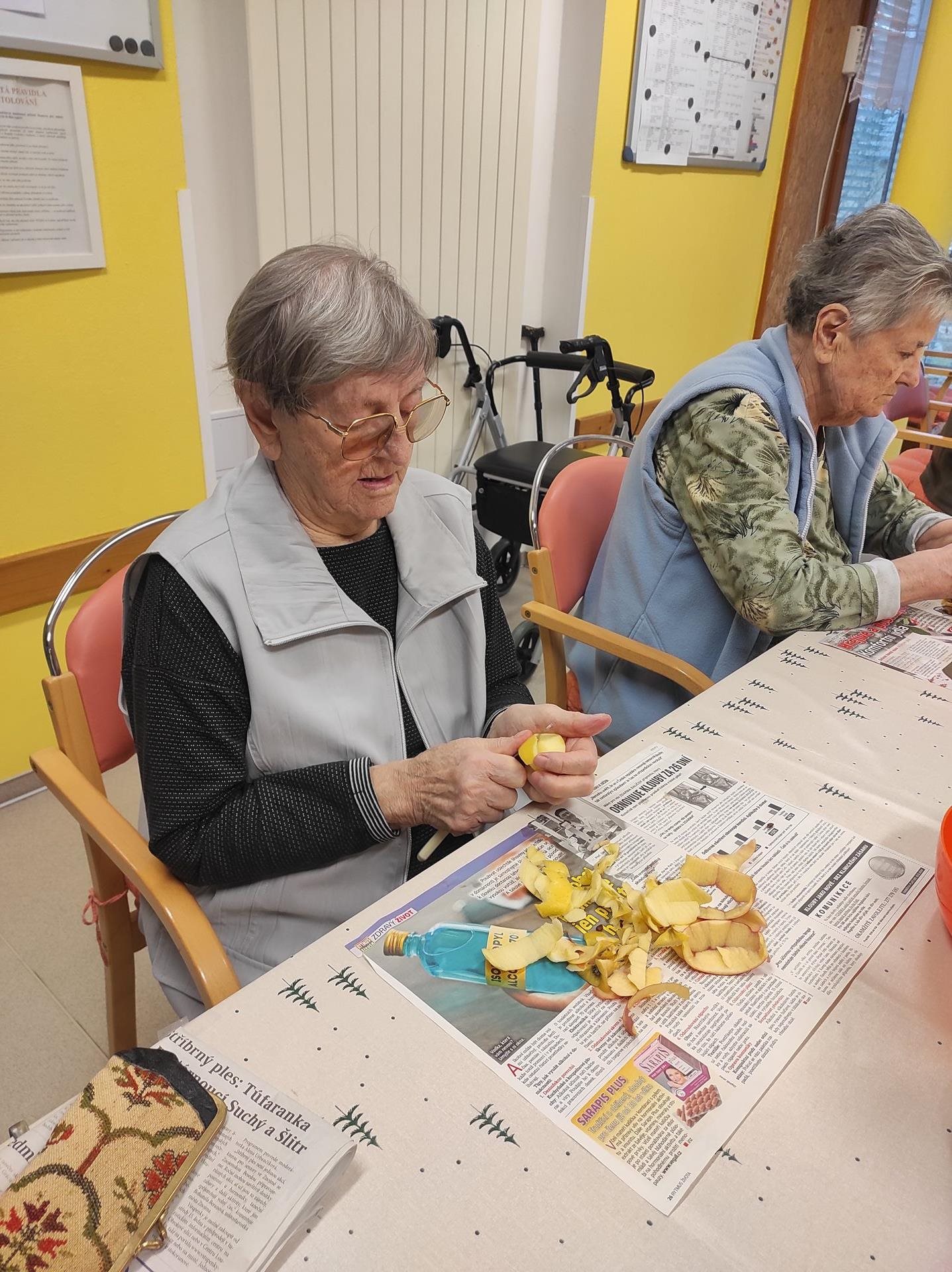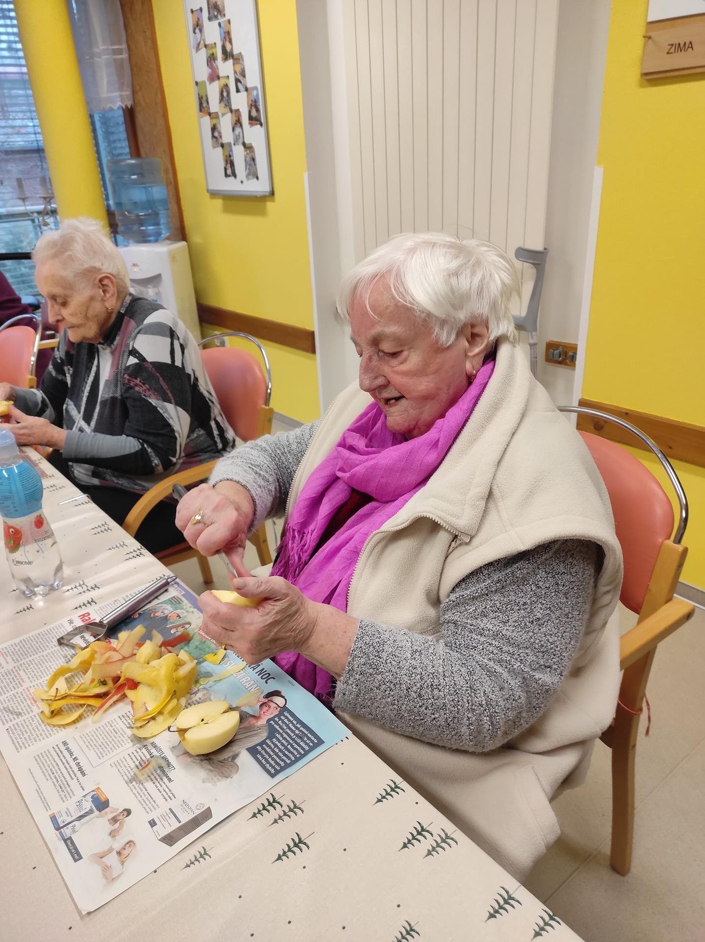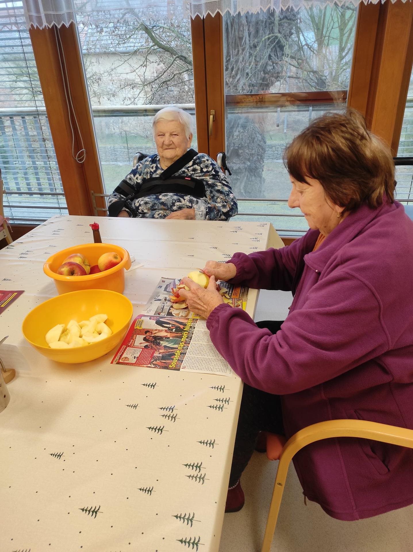 Pavilonem A se ve čtvrtek rozléhal zpěv lidovek a vůně jablek a skořice – tipujete dobře – peklo se! S uživatelkami jsme společně očistily jablka, které následně nakrájely na malé kostičky a rozprostřely na rozválené listové těsto. Vzduchem se mj. linula vůně rozinek a vanilkového cukru. Dezert v podobě zlatavého štrúdlu si pak společně uživatelky vychutnaly u odpolední kávy.