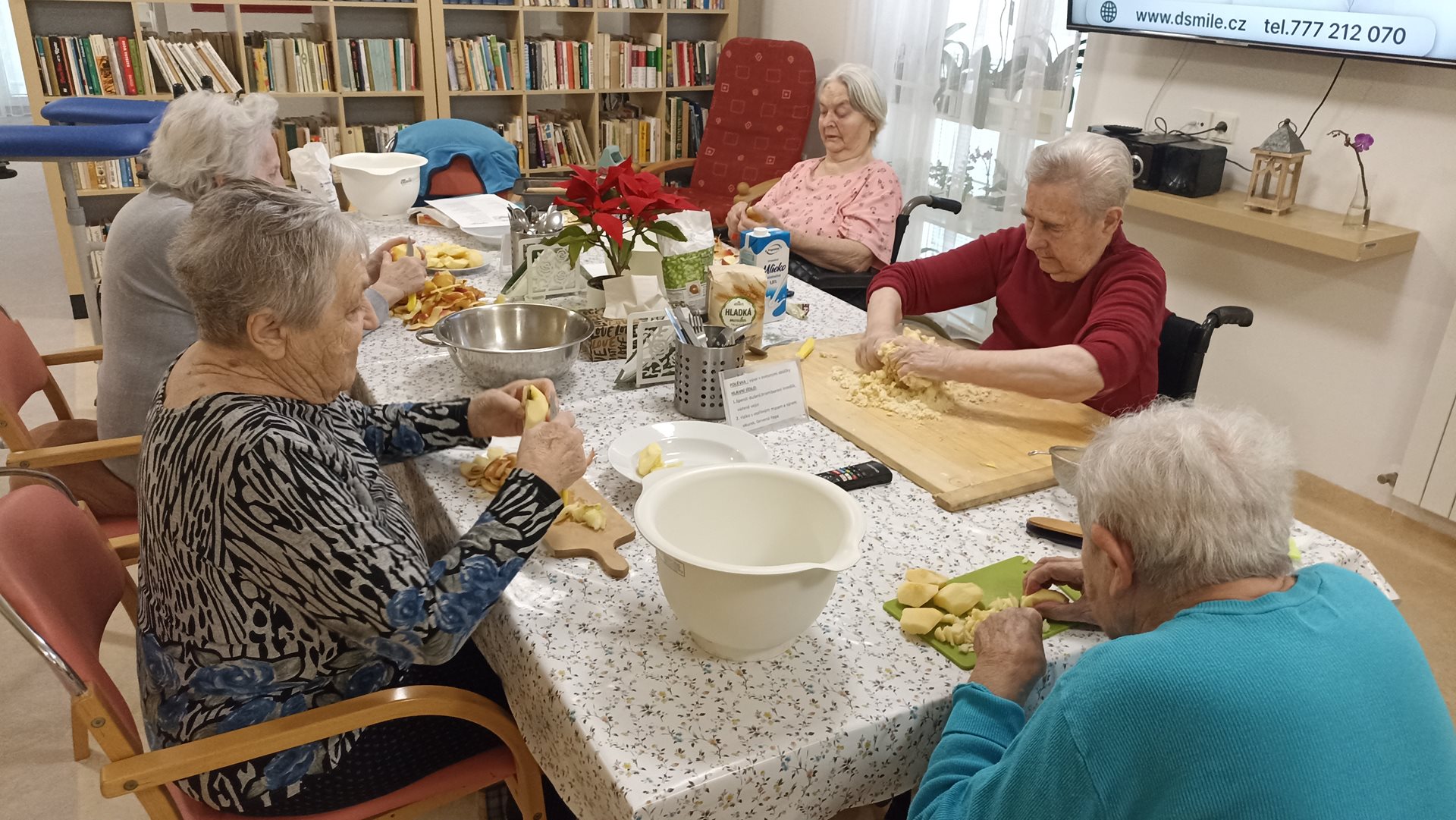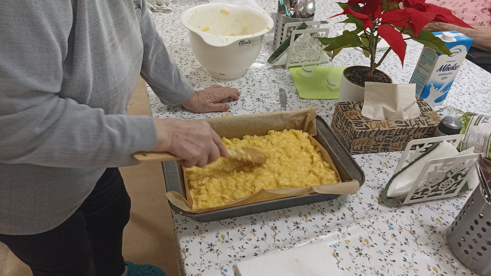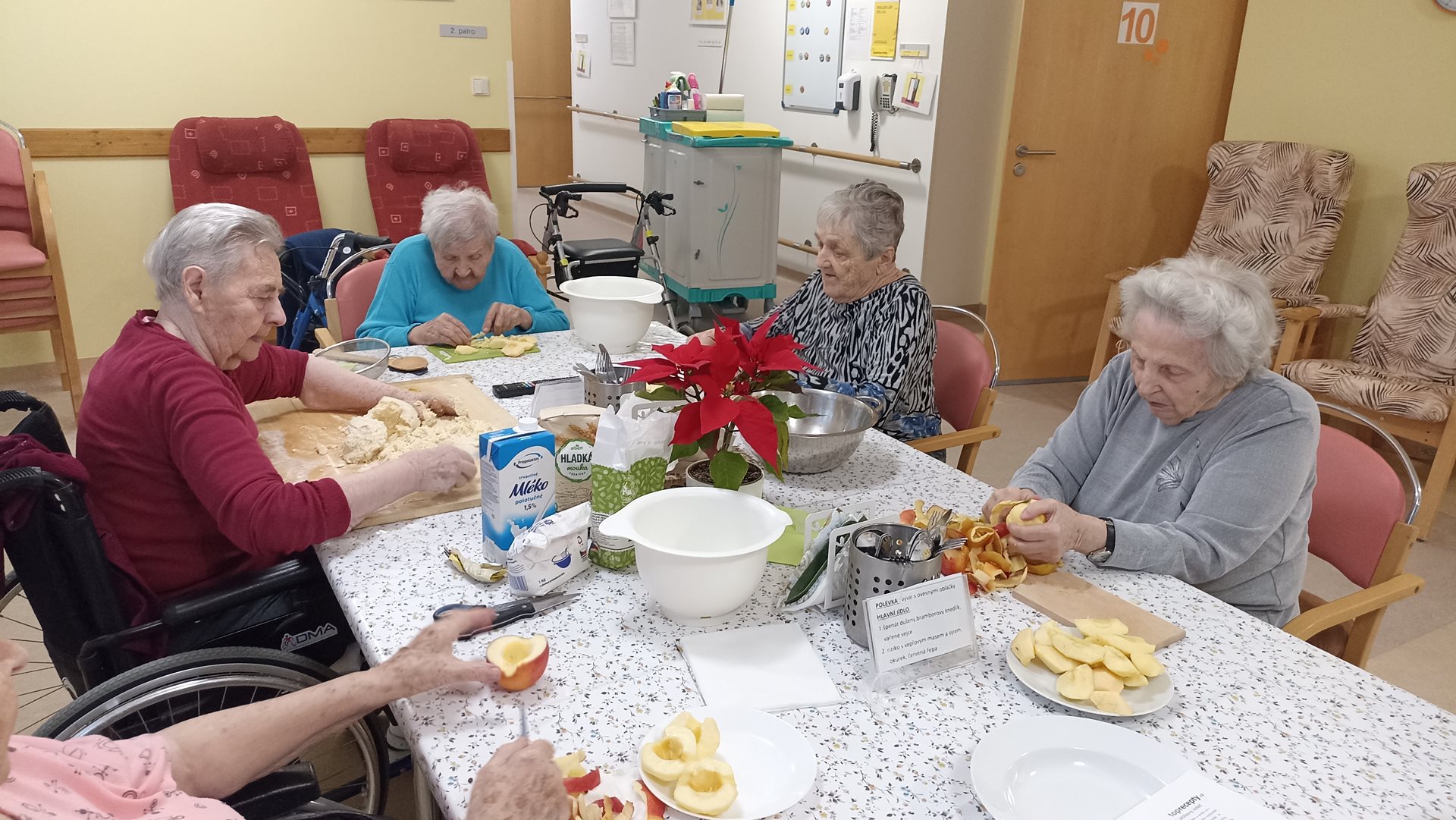 Čtvrteční dopoledne jsme s uživatelkami strávily v pavilonu B a pekly Křehký koláč s jablíčky. Uživatelky mají tuto aktivitu velmi rády, procvičí si jemnou motoriku a zavzpomínají si jak pekly doma. Někdy bývá i velice živá debata ohledně ingrediencí, protože každá doma pekla dle sebe. Nakonec je výsledek sladký a uživatelky si pochutnají na moučníku při odpolední kávě, kde se pobaví o tom, co se bude péct příště.