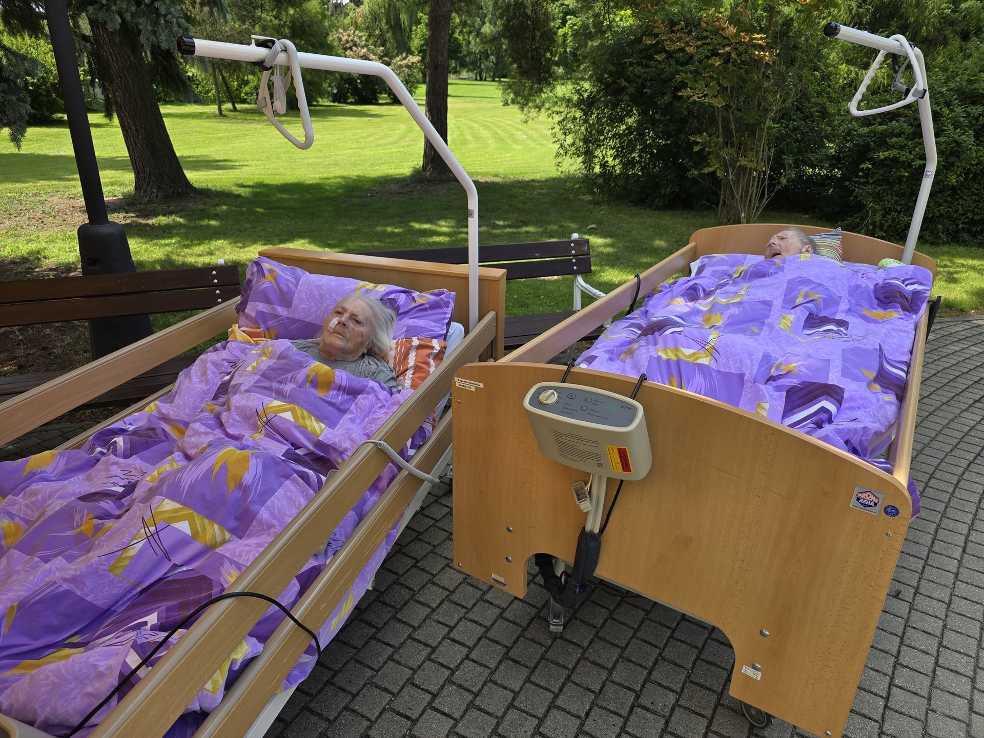 V našem zařízení se snažíme vytvářet podnětné a příjemné prostředí, které podporuje nejen fyzickou pohodu, ale i duševní rovnováhu našich uživatelů. Jedním z takových momentů byla i nedávná smyslová terapie, která probíhala přímo pod širým nebem u kašny. Na pohodlných lůžkách byly naše klientky převezeny na slunné místo, kde na ně čekal čas plný vůní, klidu a příjemné atmosféry. Hlavní část programu tvořilo přičichávání k čerstvým bylinkám, jako je máta, rozmarýn či meduňka. Vůně bylin pomáhá probouzet vzpomínky, podporuje uvolnění a přináší radost z drobných podnětů všedního dne. Součástí našeho setkání bylo také předčítání z knihy, které doplnilo celkovou atmosféru klidu a rozjímání. Sluneční paprsky, jemný šum vody z fontány a tiché verše přenesly naše uživatelky na chvíli do jiného světa – do světa vzpomínek, pohody a přírodních vjemů. Tato aktivita byla vřele přijata a těší nás, že můžeme našim uživatelům i nadále zprostředkovávat chvíle, které mají smysl.