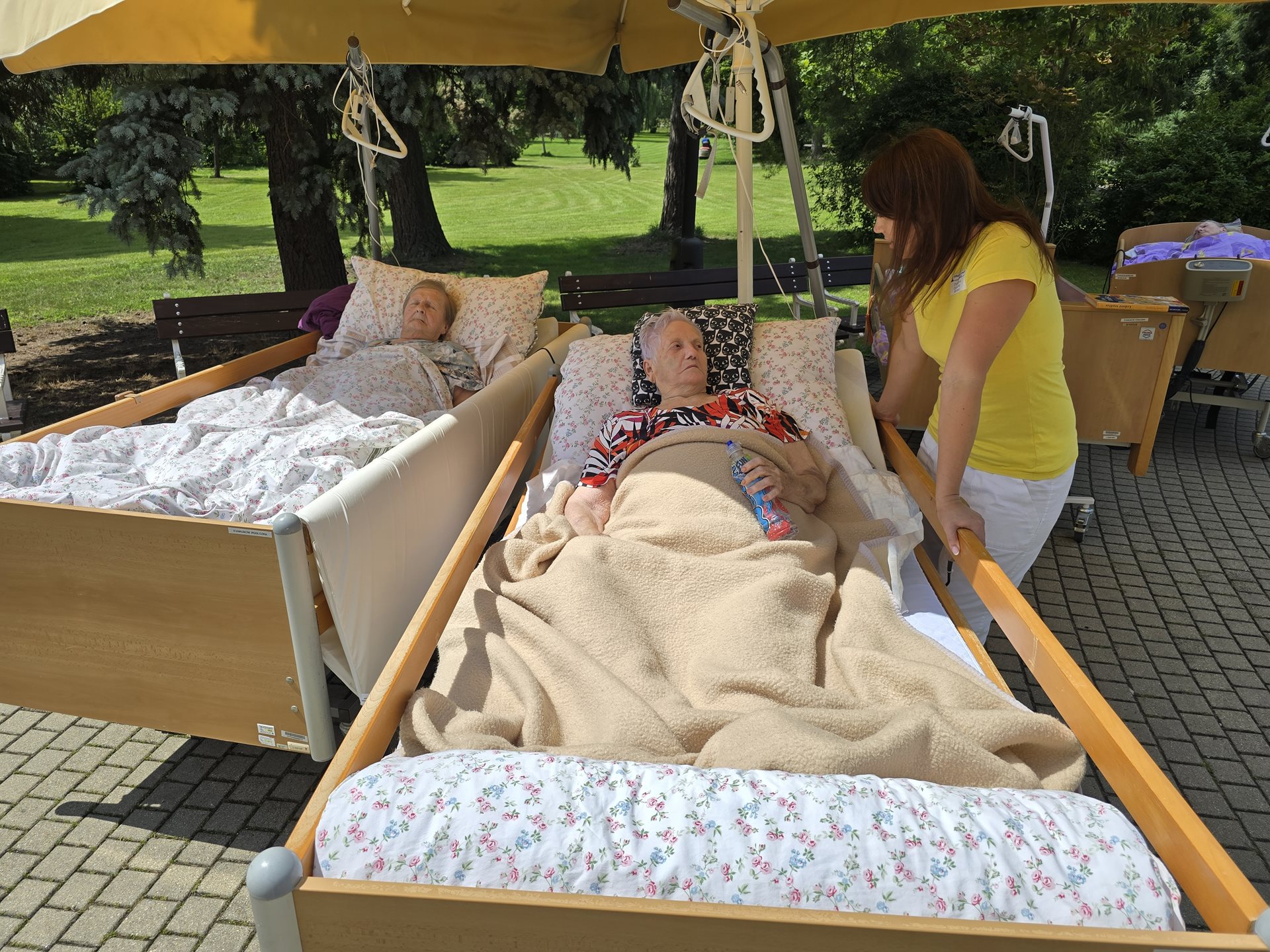 Za příjemného počasí s uživateli vyrážíme ještě pochytat zbytky letního sluníčka a užít si babího léta na vzduchu. A to i za cenu toho, že odpojíme postele z elektriky, zašpuntujeme aktivní antidekubitní matrace a vezmeme celou postel i s uživateli ven před hlavní budovu. Proč to děláme? Chceme aby si i ti uživatelé, kteří z jakýchkoli důvodů nemají možnost vyjet ven na procházku na invalidním vozíku či pojízdném křesle, užili čerstvého vzduchu, slunečních paprsků, vůně čerstvě posekané trávy či závanu větříku na tváři.