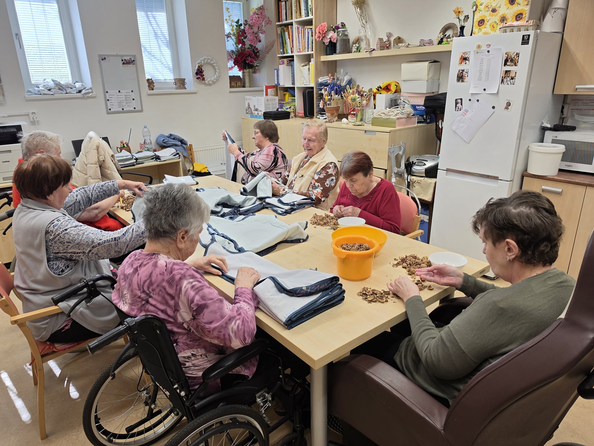 Ani po Velikonocích jsme s uživatelkami nezahálely a ve čtvrtek jsme se vesele vrhly na vyloupávání ořechů ze skořápek a skládání obrovské hromady prostírek, které se, čistě vyprané, nahromadily během velikonočních svátků v prádelně. Příjemné dopoledne doladil poslech populární hudby z dob mládí uživatelek, které si známé písně během práce popěvovaly.