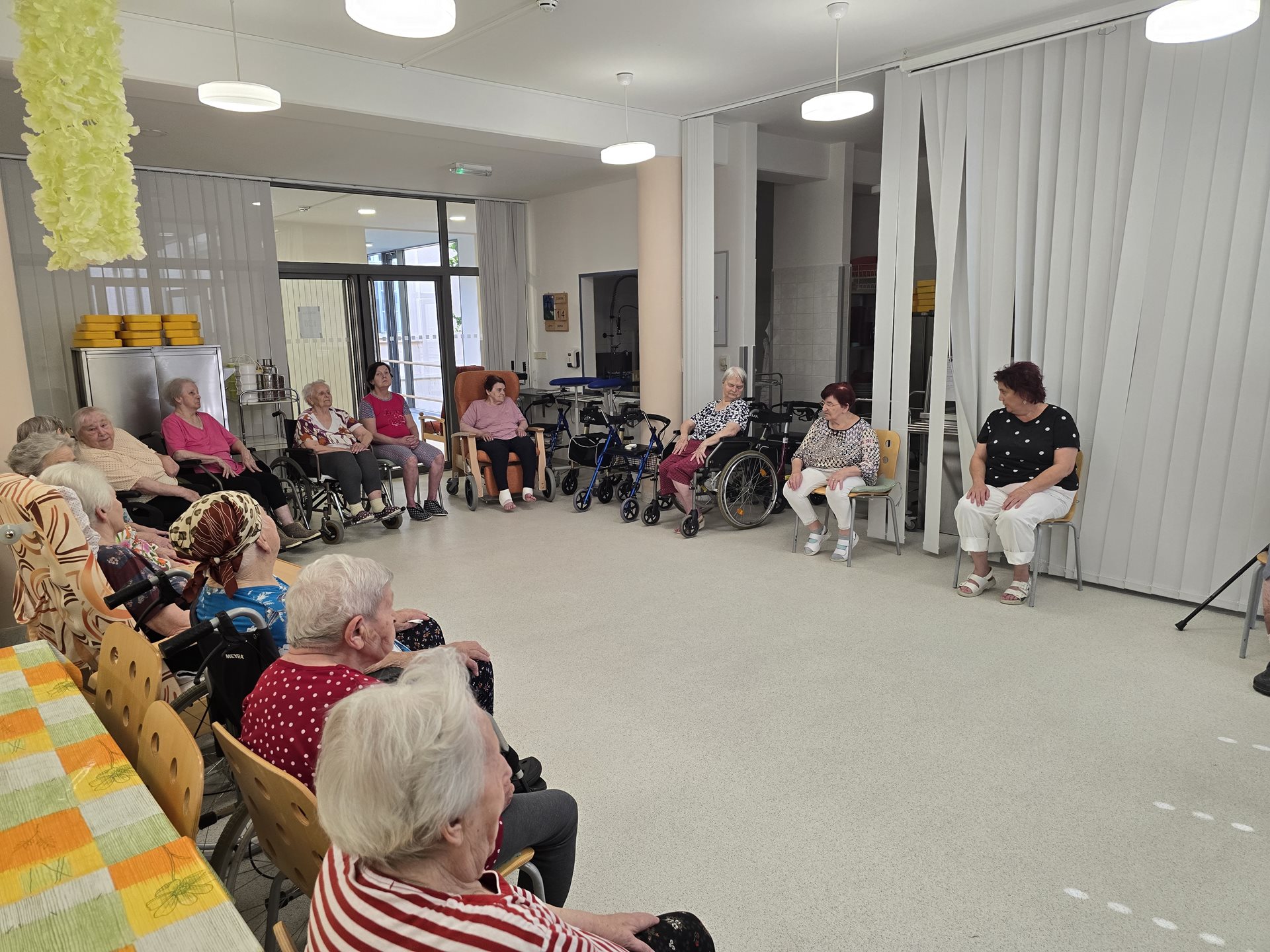 V našem domově pro seniory probíhá každý týden pravidelné skupinové cvičení, které je oblíbenou a nedílnou součástí volnočasových aktivit. Uživatelé se při něm setkávají v příjemném prostředí, kde společně procvičují různé partie těla a protahují. Cvičení je přizpůsobeno individuálním možnostem každého účastníka a probíhá formou jednoduchých a nenáročných pohybů, často s využitím cvičebních pomůcek, jako jsou míčky, gumy či kroužky. Tyto pomůcky podporují nejen pohybovou aktivitu, ale také jemnou motoriku a koordinaci. Pravidelný pohyb má pozitivní vliv na fyzickou kondici, zlepšuje náladu a posiluje celkovou vitalitu. Naše setkávání jsou navíc příležitostí k přátelskému povídání a sdílení radosti z aktivního času stráveného společně.