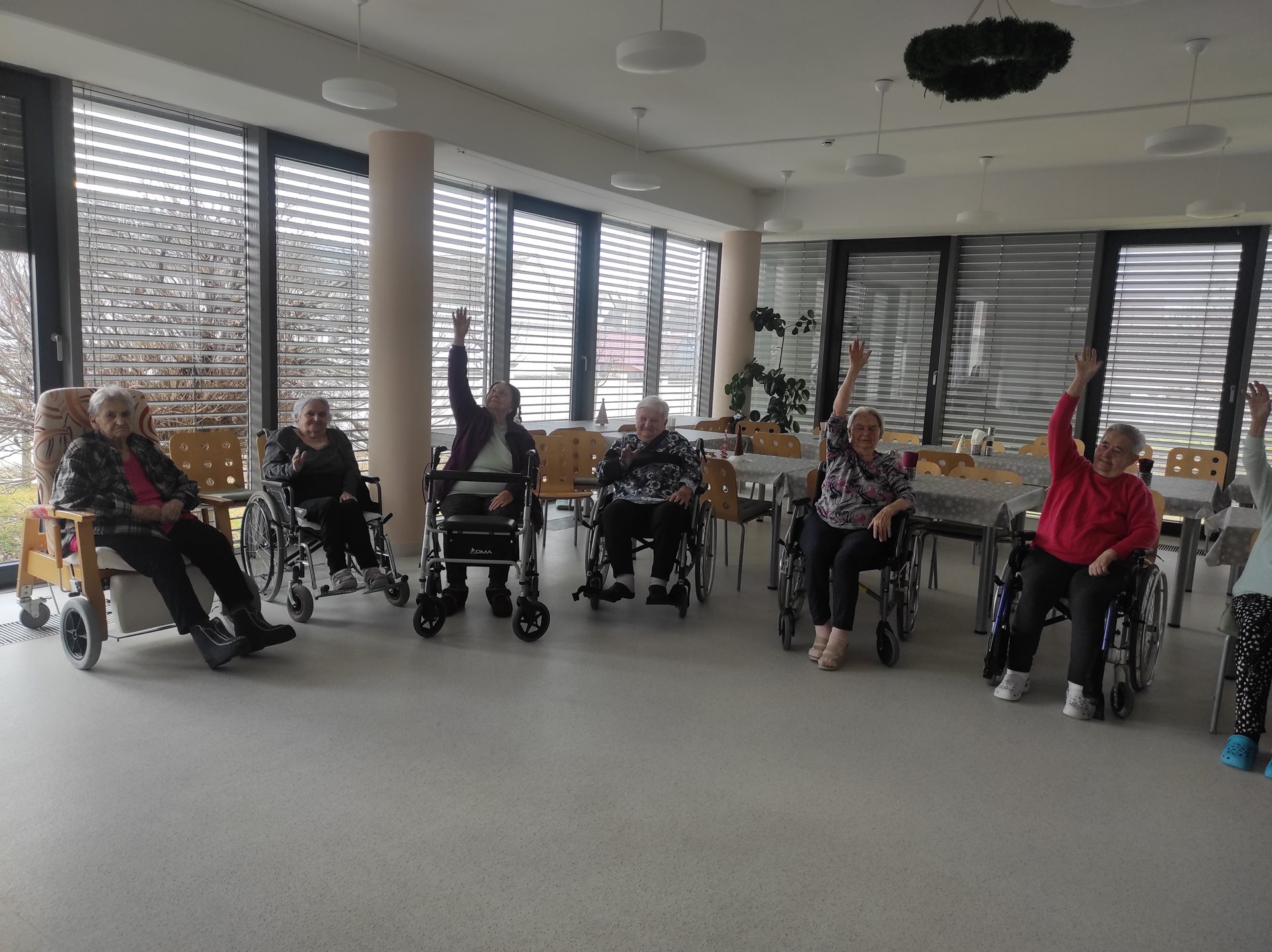 Jako každý pátek, tak i dnes naše uživatelky čekalo oblíbené skupinové cvičení, na které se vždy celý týden těší. Při tomto cvičení mají uživatelky možnost procvičit si a protáhnout celé své tělo - od hlavy až k patě. Tak, jako vždy při skupinovém cvičení jsou uživatelkám rozdány i cvičící pomůcky a dnes byly uživatelkám rozdány gumové kroužky. S gumovými kroužky je možné provádět spoustu různých cviků - ať už na procvičení rukou nebo třeba i nohou, uživatelky si tak cvičení užily ještě více. Uživatelky ze skupinového cvičení odcházely s úsměvem na rtech.