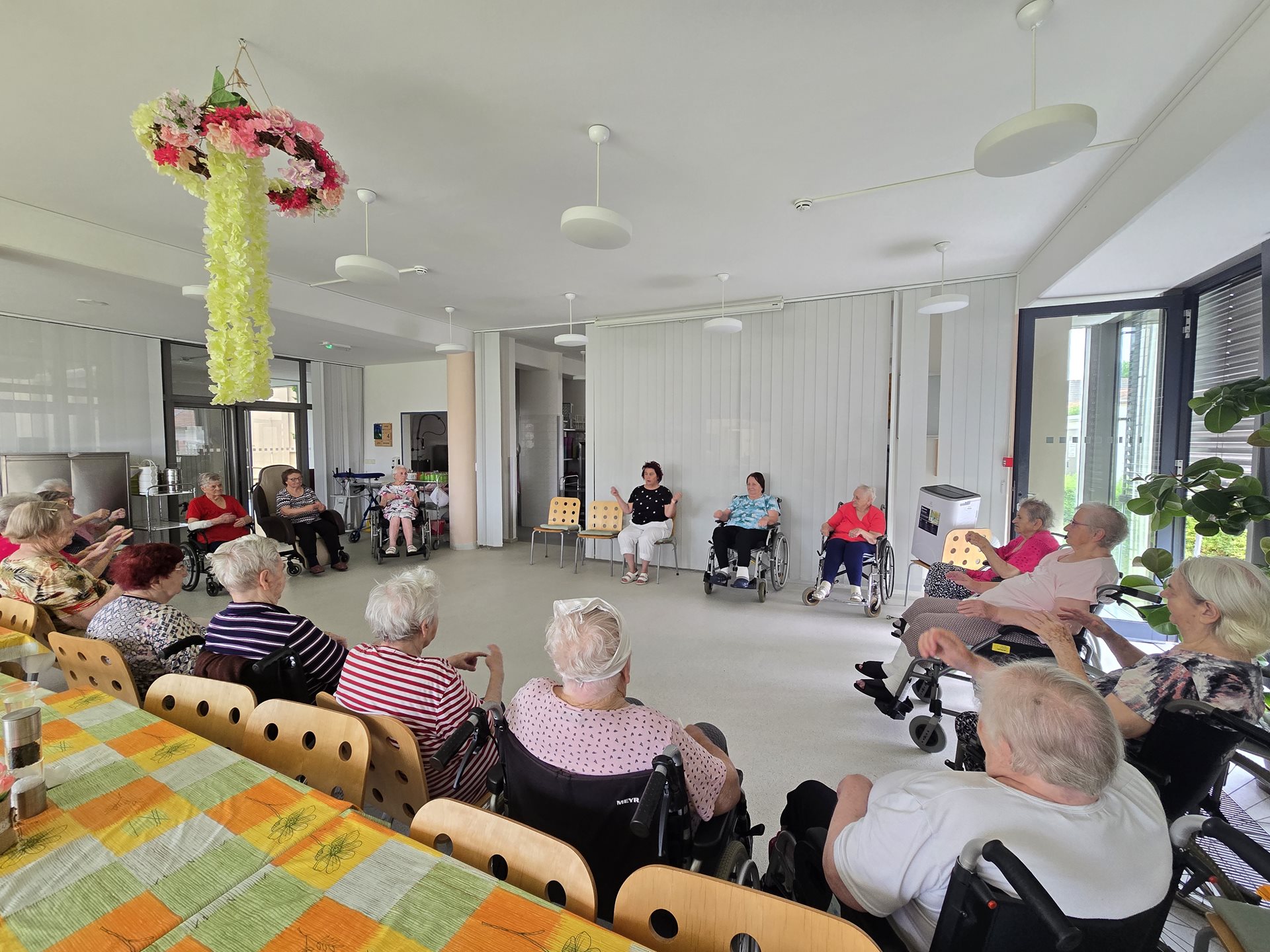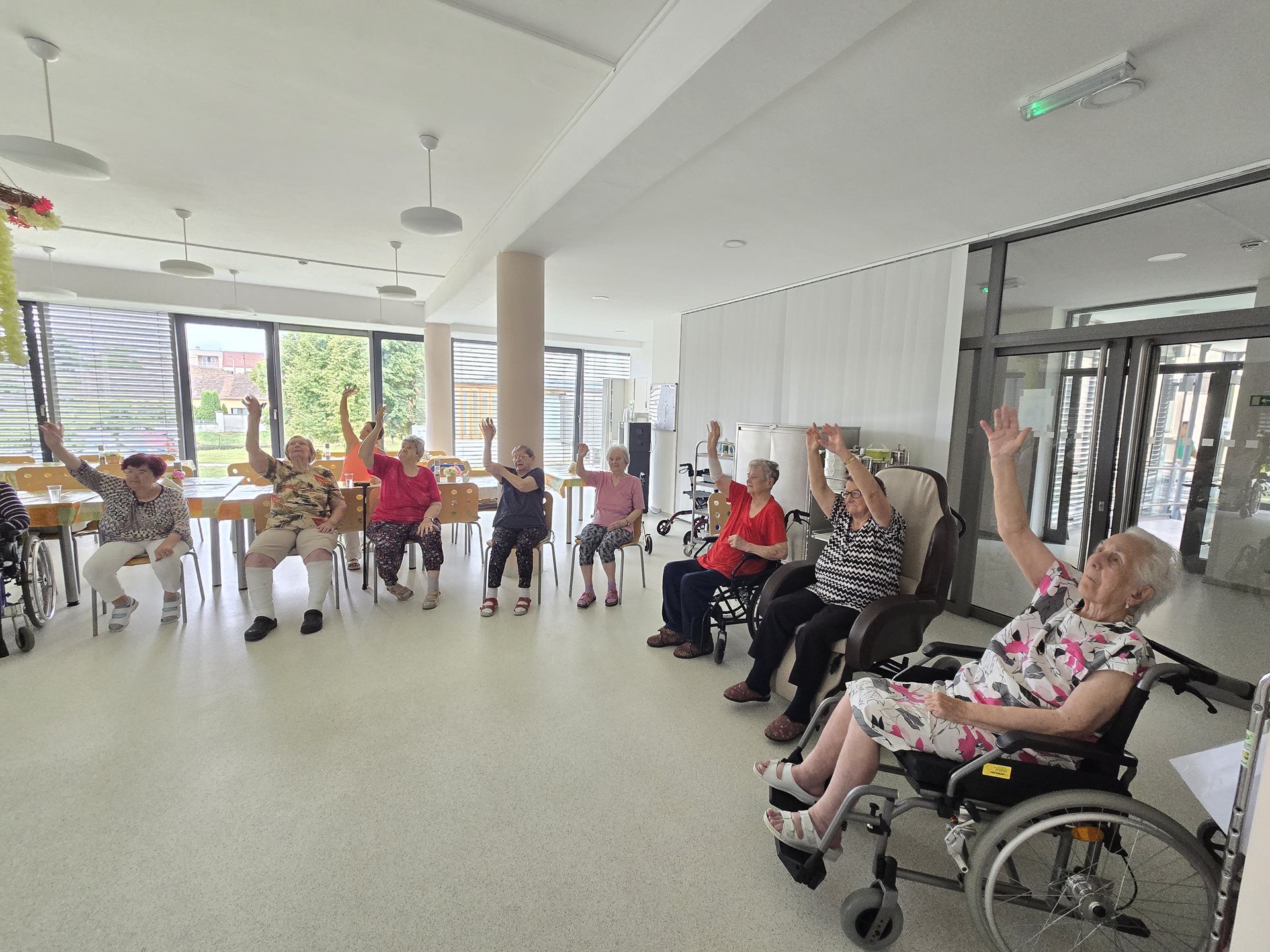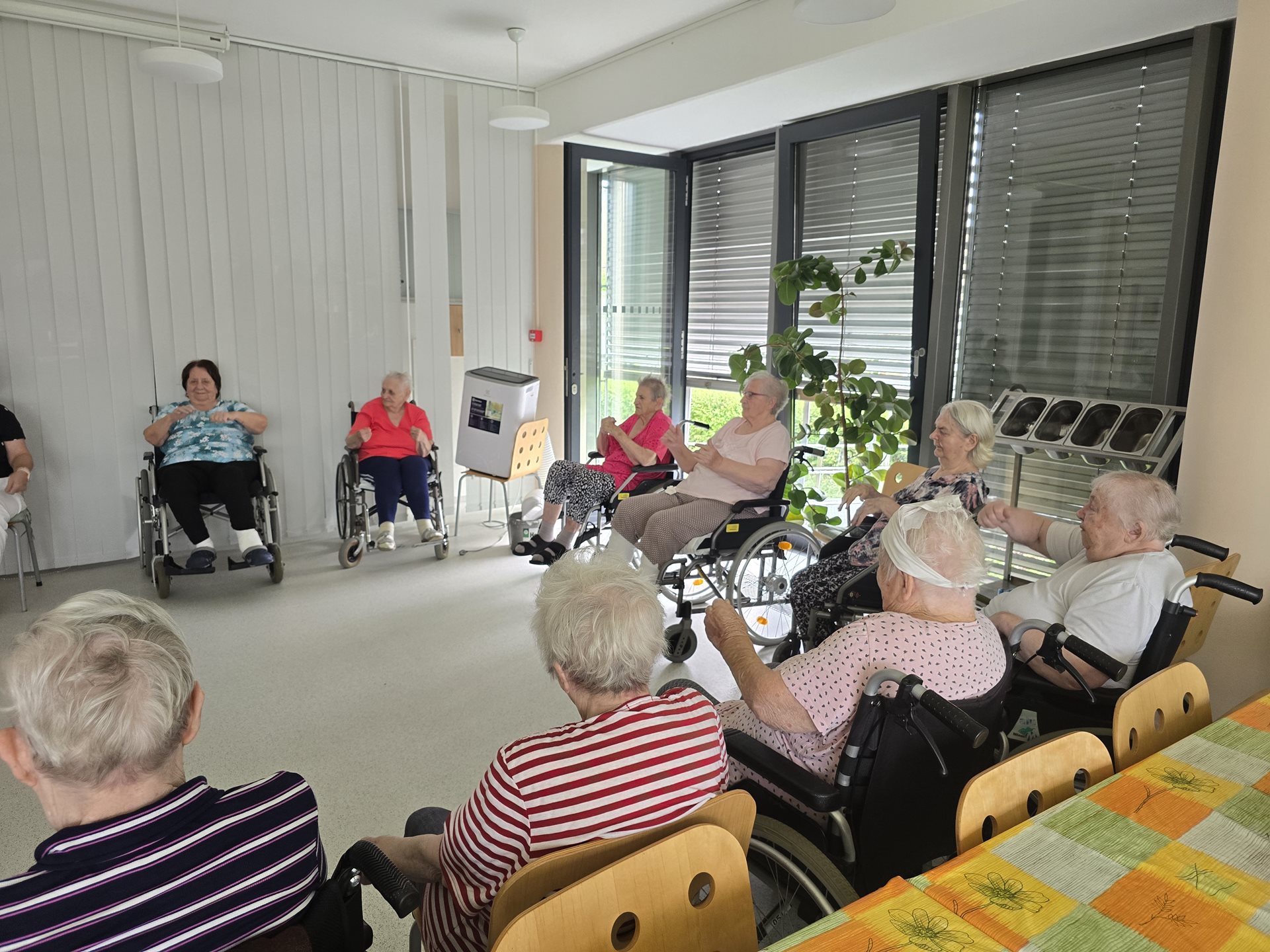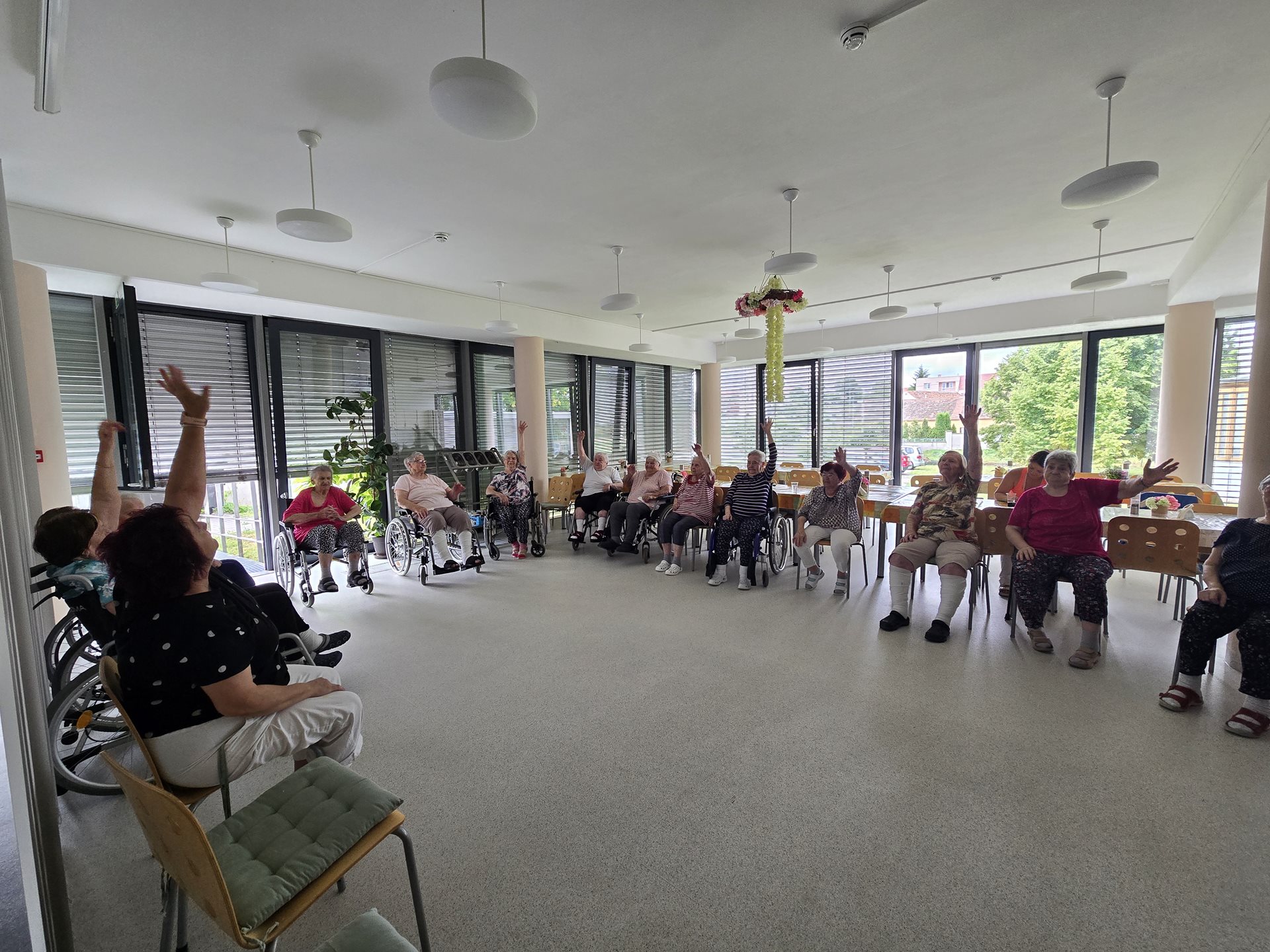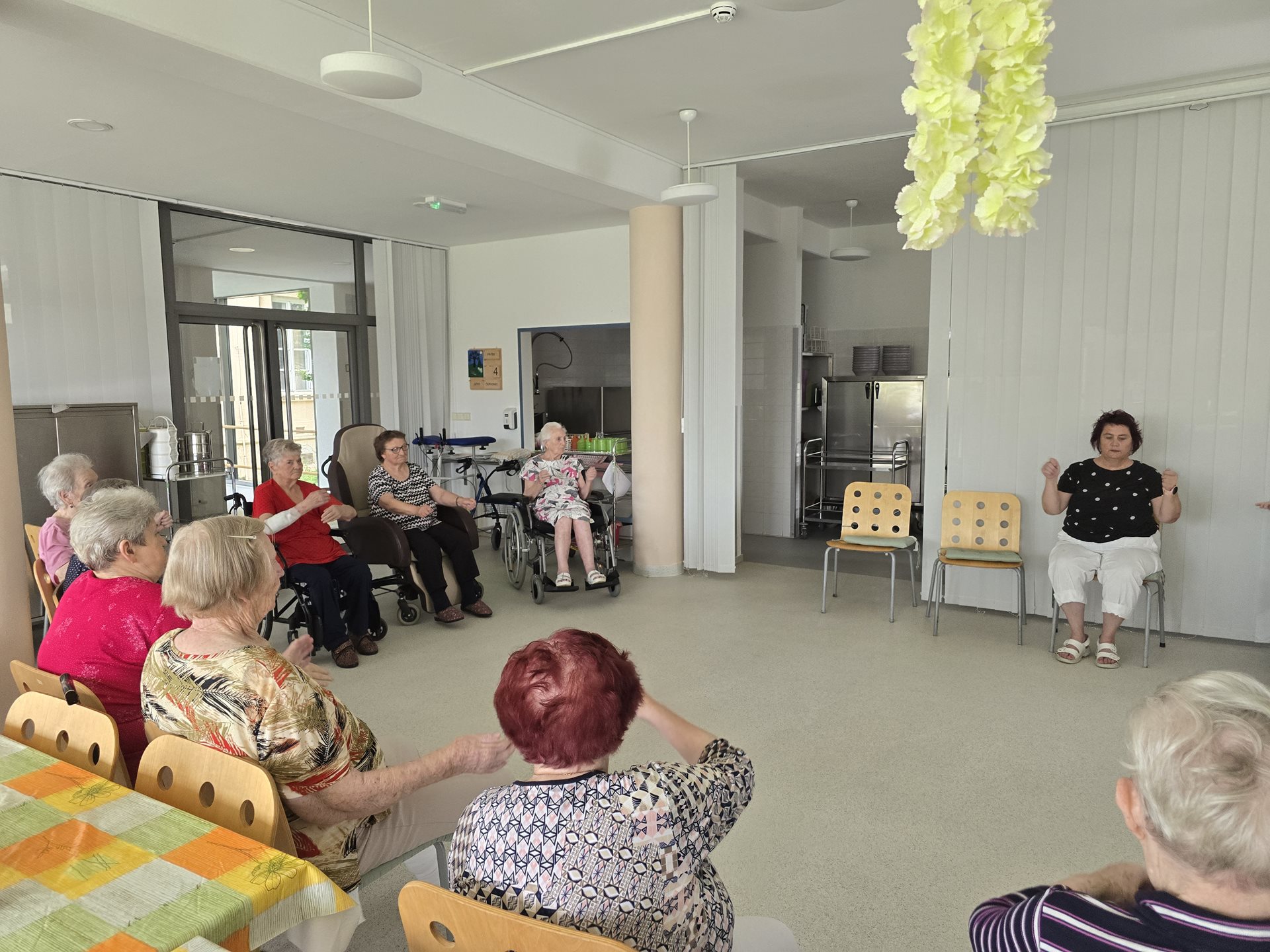 U nás v domově se pravidelně věnujeme pohybovým aktivitám, které podporují zdraví, vitalitu a dobrou náladu našich klientů. Jednou z oblíbených forem je skupinové cvičení na židlích, které je uzpůsobeno potřebám seniorů a umožňuje bezpečné a zároveň účinné procvičení celého těla. Tentokrát jsme do cvičení zařadili barevné míčky, které přinesly nejen nové podněty pro pohyb, ale také radost a zábavu. Uživatelé procvičovali koordinaci, jemnou i hrubou motoriku, zapojili horní i dolní končetiny a nechyběly ani dechové techniky. Celé dopoledne se neslo v příjemné a přátelské atmosféře. Úsměvy a aktivní zapojení všech účastníků byly pro nás důkazem, že pohyb může být nejen přínosný pro zdraví, ale i potěšující pro duši. Cvičení jsme zakončili společným zpěvem. Děkujeme všem zúčastněným a těšíme se na další společné cvičení.