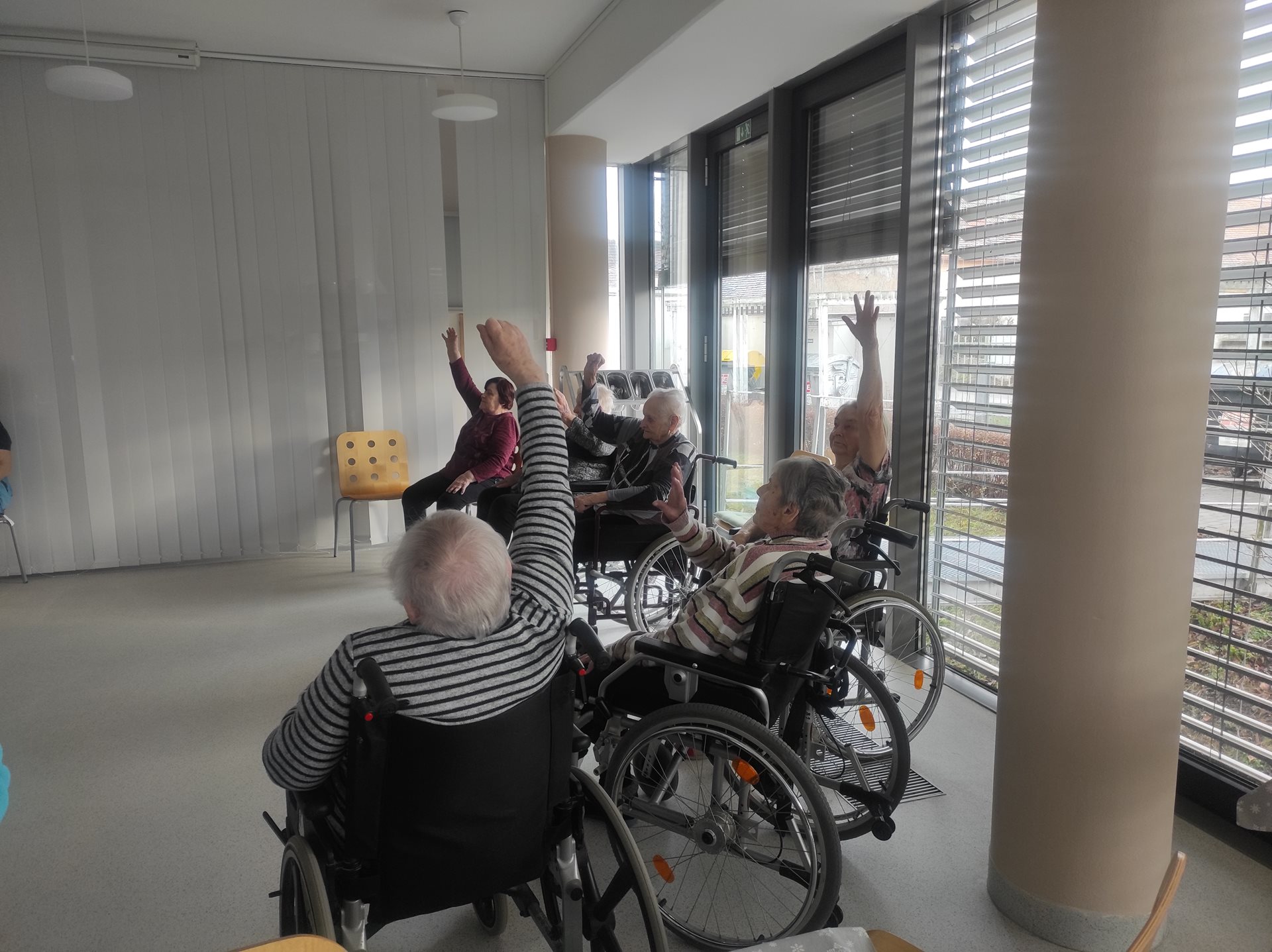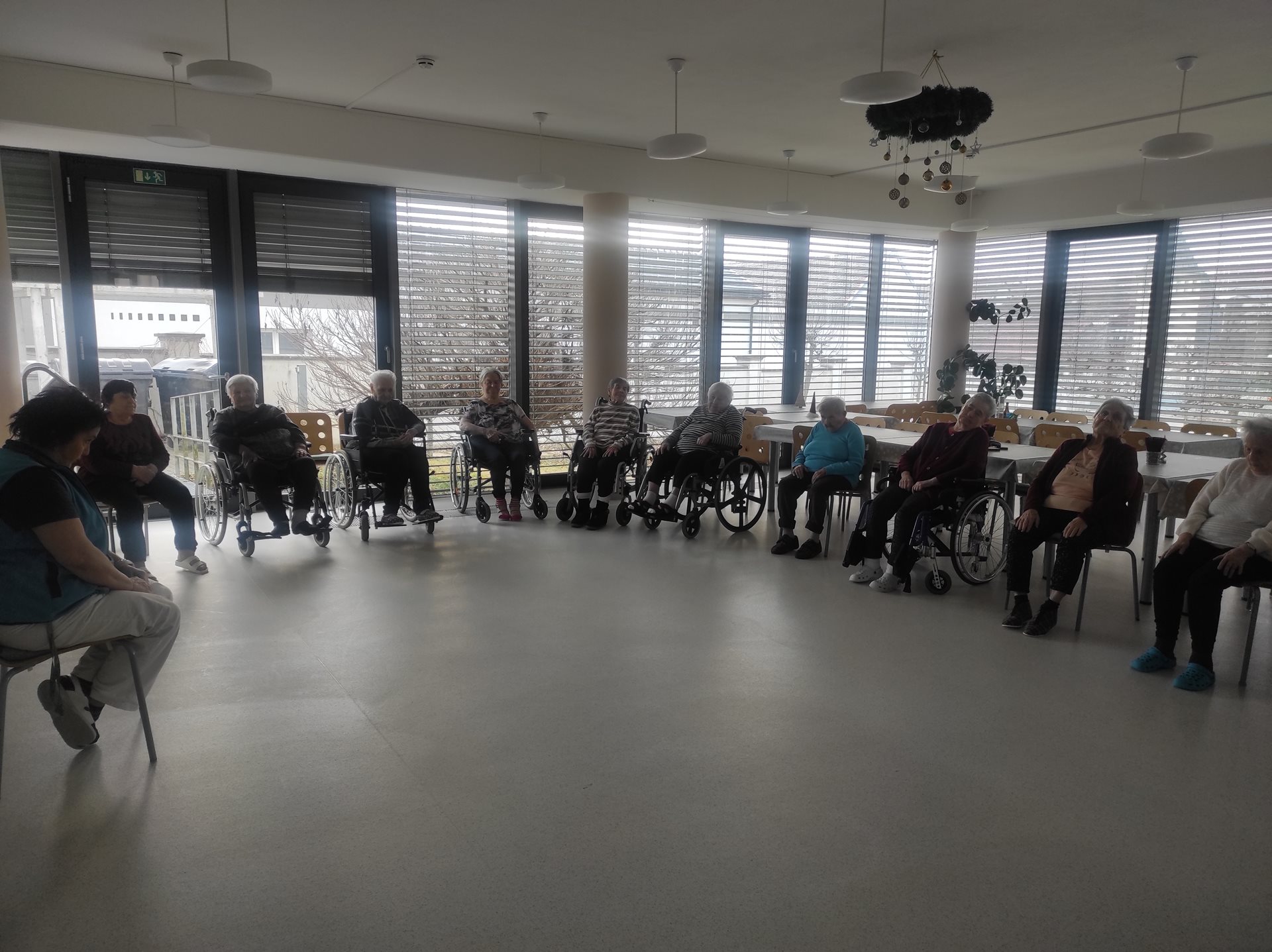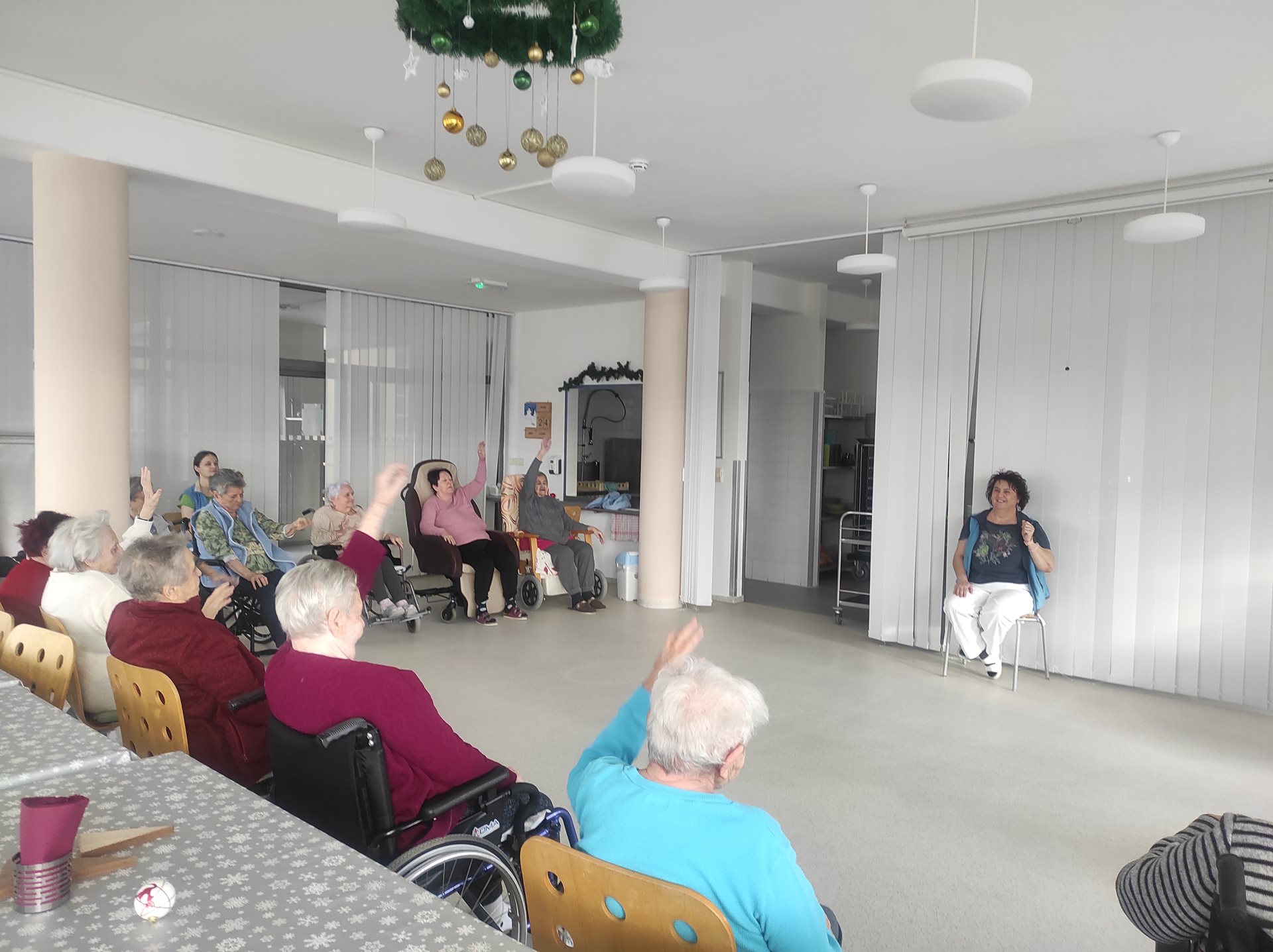 V pátek, už celkem tradičně, u nás v domově probíhá společné skupinové cvičení. Uživatelé se vždy moc těší, že si protáhnou dolní i horní končetiny, krční páteř a mimické svaly, zařazujeme i dechové cvičení. Cvičení ve skupině má i preventivní charakter a je pro všechny věkové kategorie a hlavně i pro dobrou náladu.