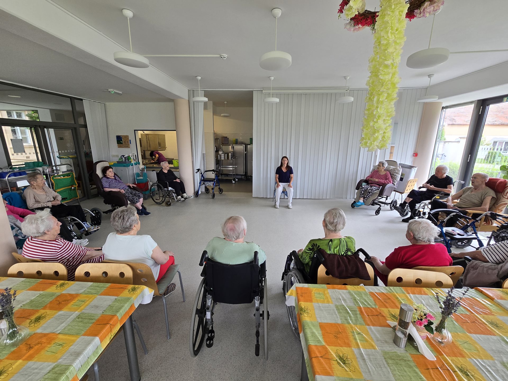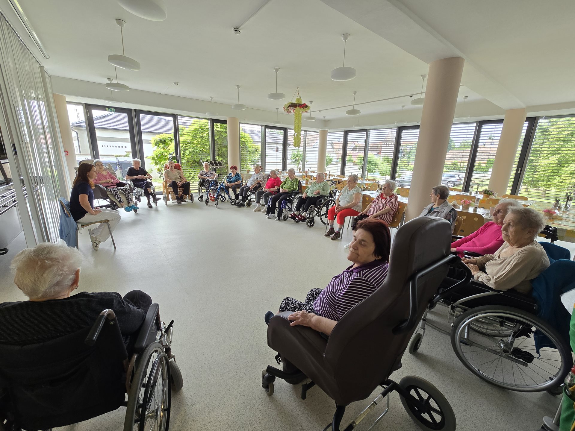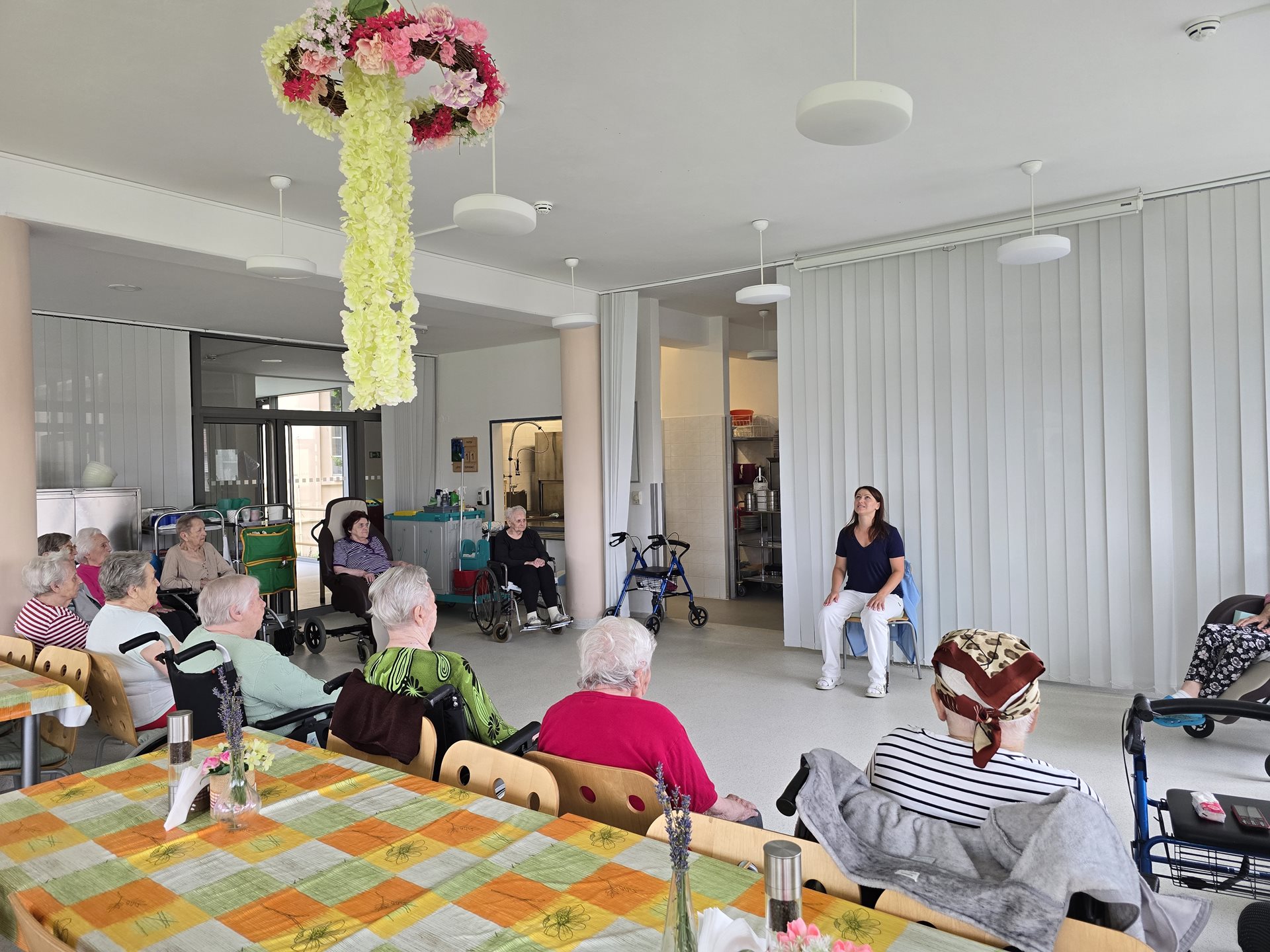 Páteční dopoledne jsme si procvičili těla obvyklým způsobem – aktivním protažením svalů a cviky s kroužky. Dále jsme protáhli obličejové svaly a jazyk a v neposlední řadě jsme zahrnuli i procvičení svalů, které pomáhají s dýcháním – nádechem, výdechem. Po tréninku fyzična jsme přešli k tréninku kognice – konkrétně dlouhodobé paměti. Uživatelům bylo řečeno přídavné jméno z ustálených či známých slovních spojení a uživatelé měli verbálně doplnit podstatné jméno, které k přídavnému jménu patří. Takže jak to je? – vídeňský...? ruská…? houpací…?
