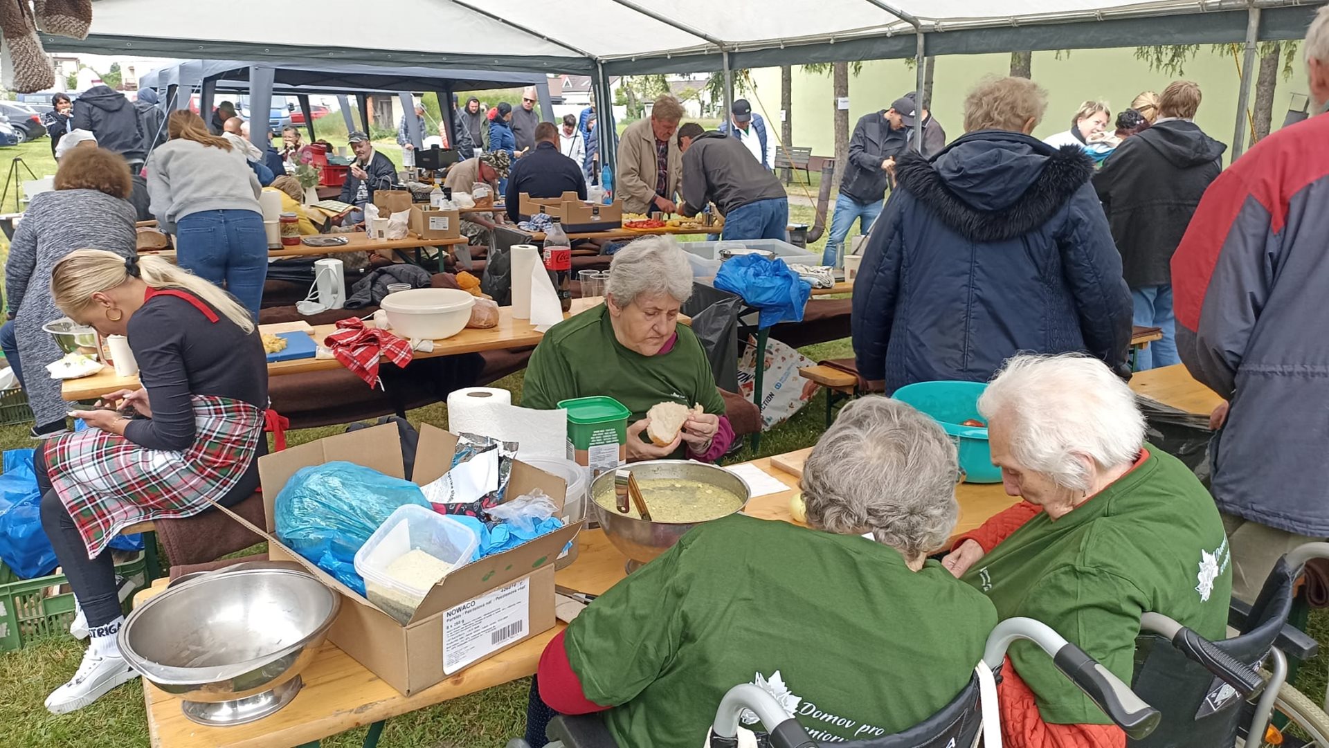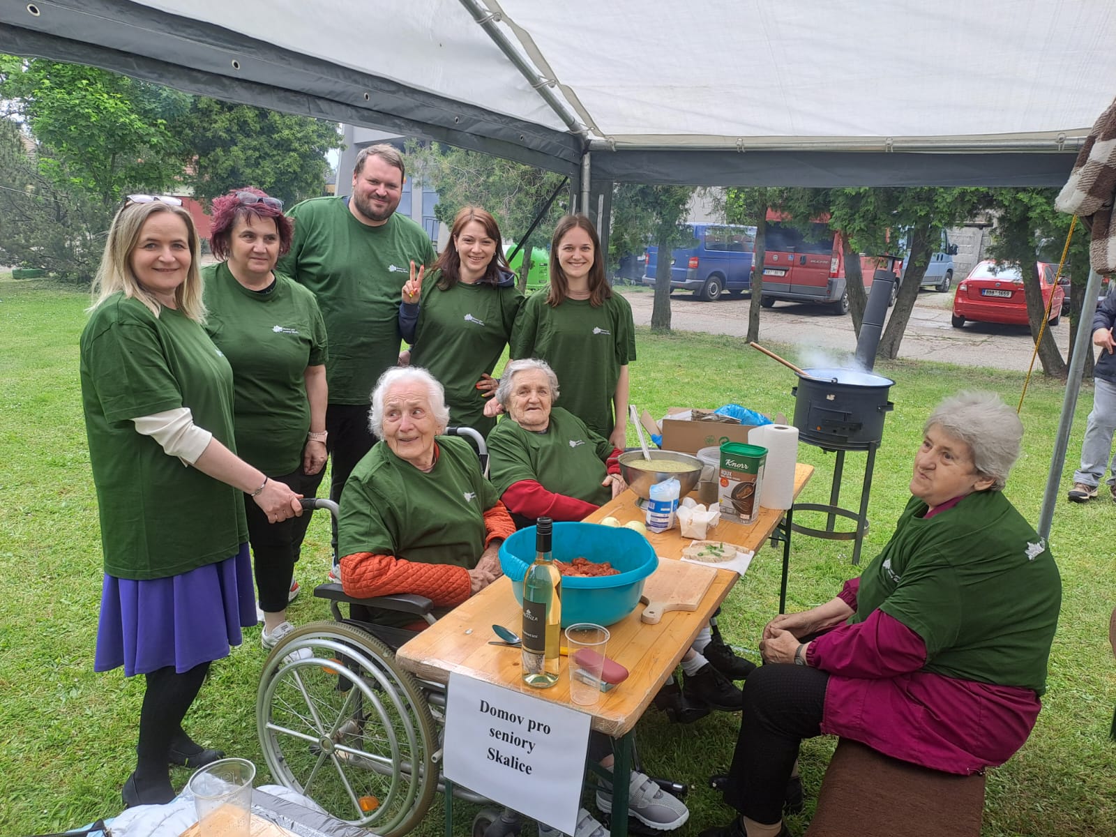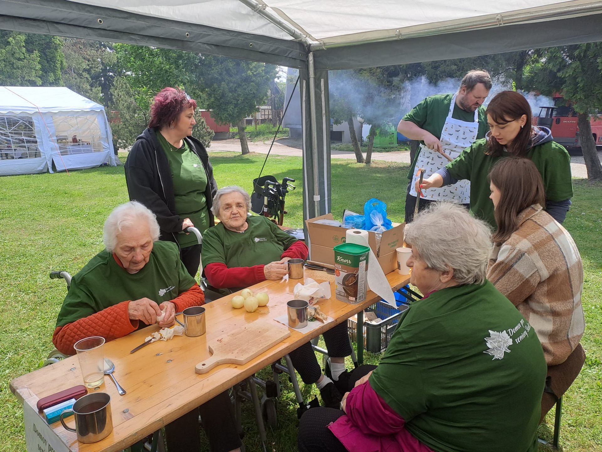 Letošní rok jsme měli možnost se zúčastnit tradiční soutěže ve vaření gulášů, který se každoročně koná ve spřáteleném zařízení ve slovenské Seredi. Na cestu jsme se s našimi seniorkami vydali v brzkých ranního hodinách, a i navzdory tomu byly naše uživatelky velmi čilé a plny očekávání. Slunečné dopoledne odstartovalo slavnostním zahájením, na kterém nechyběla všudypřítomná hudba, a tak bylo na tanečním parketu před domovem stále plno. Soutěžní týmy, složené z několika uživatelů a zaměstnanců každého z pozvaných domovů, se sešli kolem kotlíků s vlastními „osvědčenými“ recepty – někteří vsadili na tradiční maďarský styl, jiní přidali moderní nádech nebo tajné ingredience, které se dědí z generace na generaci. Přestože šlo o soutěž, hlavním cílem bylo propojit obyvatele a zaměstnance domovů. Každý měl možnost se zapojit – někdo krájel cibuli, jiný brambory, další míchal smažící se cibulku a ostatní loupali česnek. V čase čekání na to „až maso změkne“ jsme měli možnost ochutnat báječné škvarkové pagáče a chléb se sádlem a pažitkou. Kolem poledne se celým dvorem domova linula vůně čerstvého guláše. Porota ochutnávala poctivě jeden vzorek po druhém, a nakonec vydala verdikt, že nejlepší guláše uvařili zaměstnanci a uživatelé 3 slovenských domovů. Tyto týmy za své úsilí dostali tašku s dobrotami, dřevěnou vařečku s logem sereďského domova a hlavně – obrovský potlesk. Vítězný tým měl tak obrovskou a neskrývanou radost, že jsme jim jejich vítězství ze srdce přáli, neboť nejde jen o to, kdo má nejlepší recept – jde o to být spolu, dělat něco smysluplného a sdílet radost. Soutěž ve vaření gulášů v domově pro seniory není jen kulinářským zážitkem – je to symbol komunity, sounáležitosti a aktivního stáří. A jak říkají sami účastníci: „Nie je dôležité vyhrať, ale variť srdcom.“ Den plný smíchu, vůně papriky a přátelského zápolení opět ukázal, že chuť do života ani s přibývajícími lety neubývá.