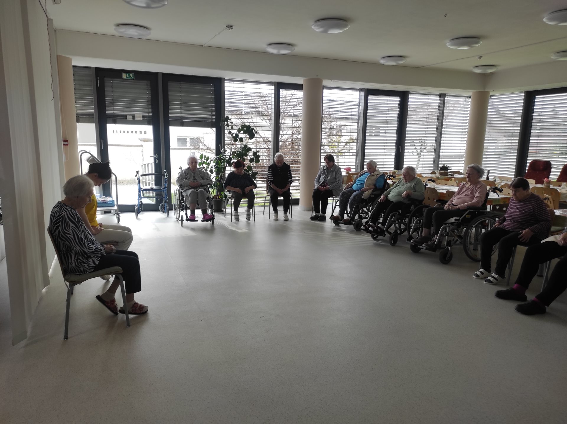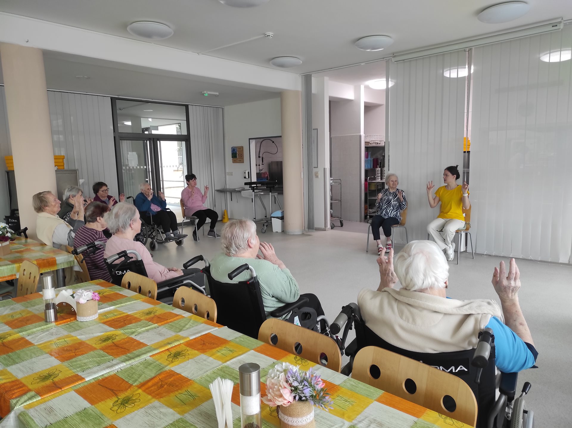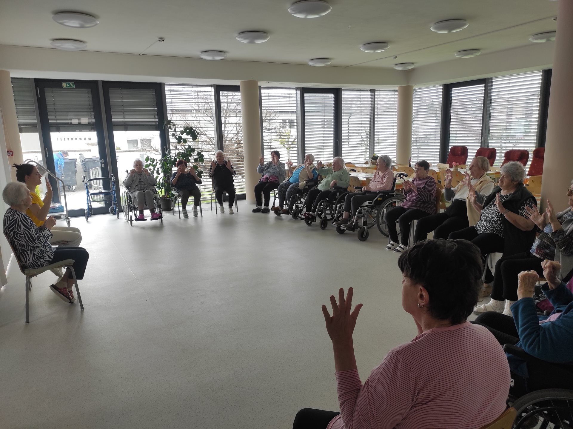 I dnes, jako každý pátek, proběhlo v jídelně našeho domova pravidelné skupinové cvičení. Program byl zaměřen na celkové protažení těla – od hlavy až k patě – a pomohl tak podpořit pohyblivost i celkovou kondici našich uživatelek. Po protažení celého těla následovalo i cvičení s pěnovým míčkem, které přispělo ke zlepšení koordinace a jemné motoriky. Součástí bylo také dechové cvičení a protažení orofaciálních svalů, které podporuje správné dýchání i funkci mluvidel. Na závěr si uživatelky procvičily paměť zábavnou formou při doplňování známých přísloví. Celé dopoledne se neslo v příjemné a přátelské atmosféře a již nyní se těšíme na další společné cvičení.