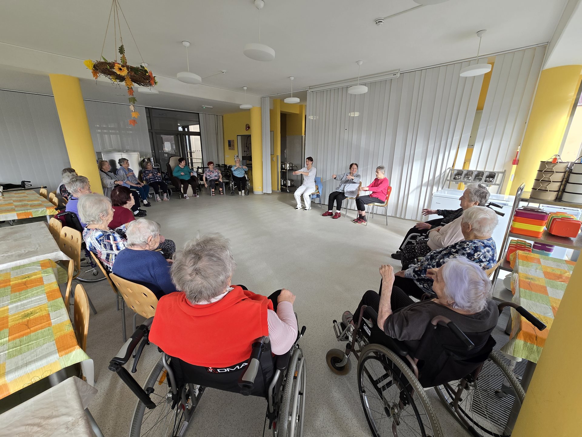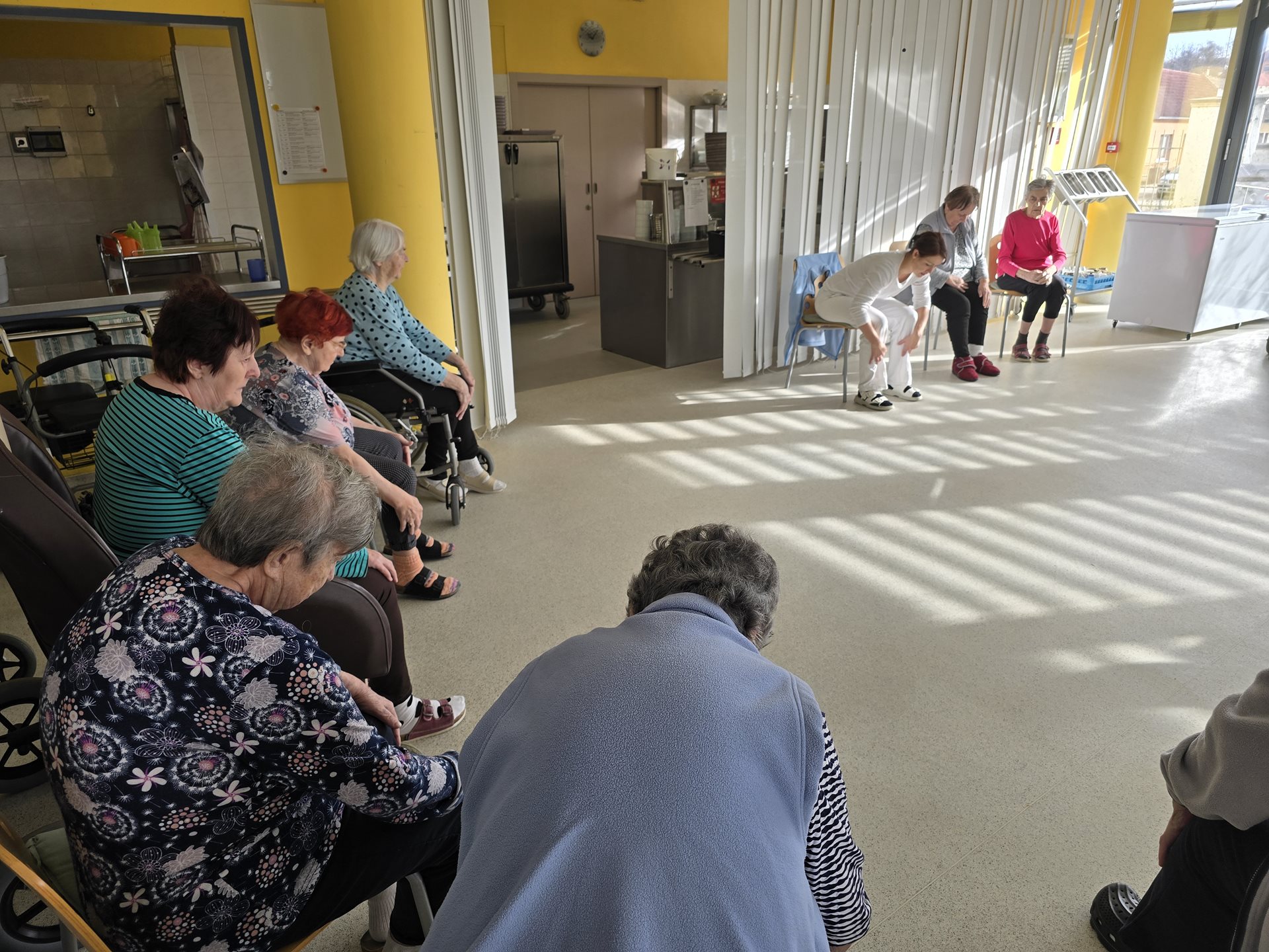Pondělní dopoledne jsme s uživatelkami procvičily svá víkendem strnutá těla. Pomohla nám v tom i dechová a orofaciální cvičení i barevné kroužky. Tyto kroužky uživatelky mačkaly, „ždímaly“, kroužily na předloktí, házely do vzduchu apod.