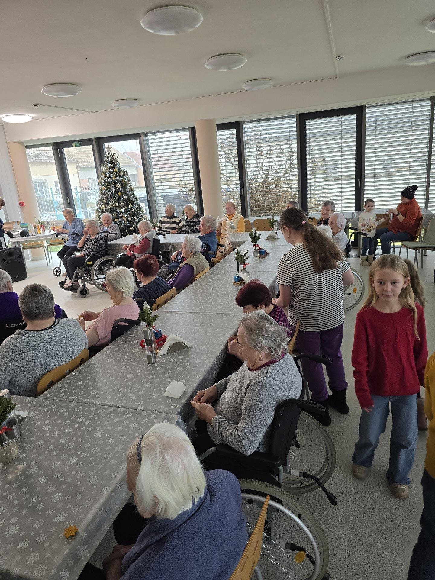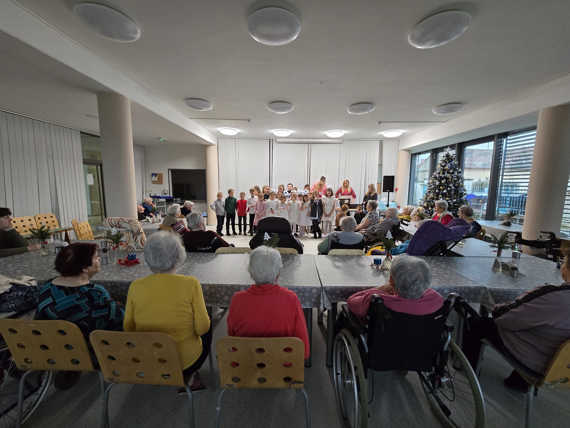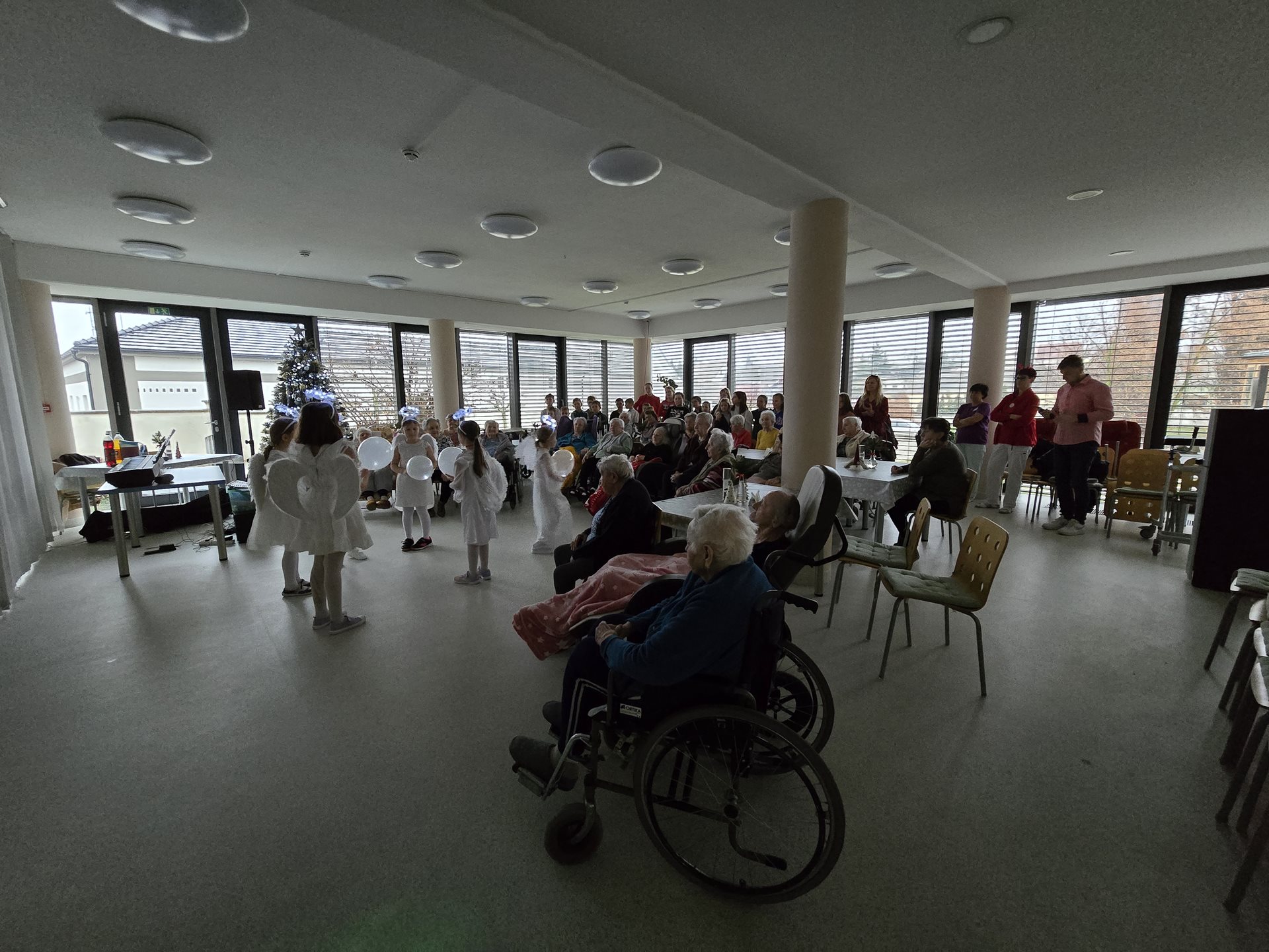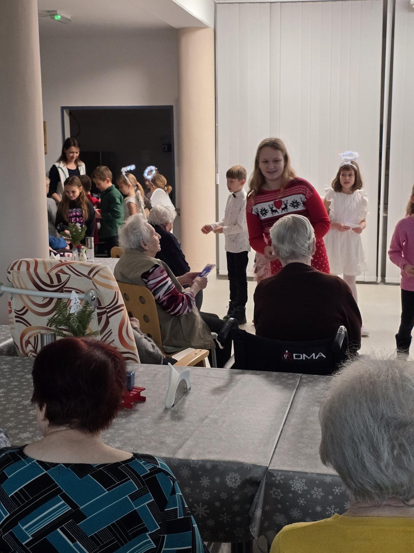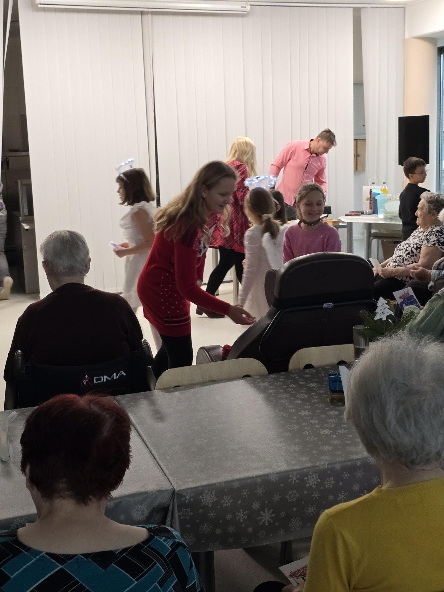 Čtvrteční a páteční dopoledne nám zpříjemnily krásné známé i neznámé písně v podání dětí ze základních škol. Všechny děti od těch nejmenších až po ty největší se sešly, aby společně zatančily, zazpívaly a podarovaly uživatele našeho domova vlastnoručně vyrobenými vánočními přáníčky. Jedno z vystoupení začalo dokonce i tancem andílků, kteří měli osvětlené balonky, křídla a svatozáře a my pouzí přihlížející smrtelníci jsme jen vydechli „ach“. Je až neuvěřitelné, co všechno učitelé vymyslí, naplánují, natrénují a co vše si děti zapamatují a dokážou. Děti mají zvláštní vlastnost, a to že dokáží naše uživatele a uživatelky naladit na „pohodovou vlnu“, která na jejich rtech vykouzlí úsměv a v očích se jim zračí nekonečná láska. O tom, že obě vystoupení byla výjimečná svědčí i to, že se kolemjdoucí personál zastavoval, nakukoval do jídelny, kde se představení odehrávala, nebo si přímo přišel sednout a užít si vánoční radost a energii předávanou dětmi.