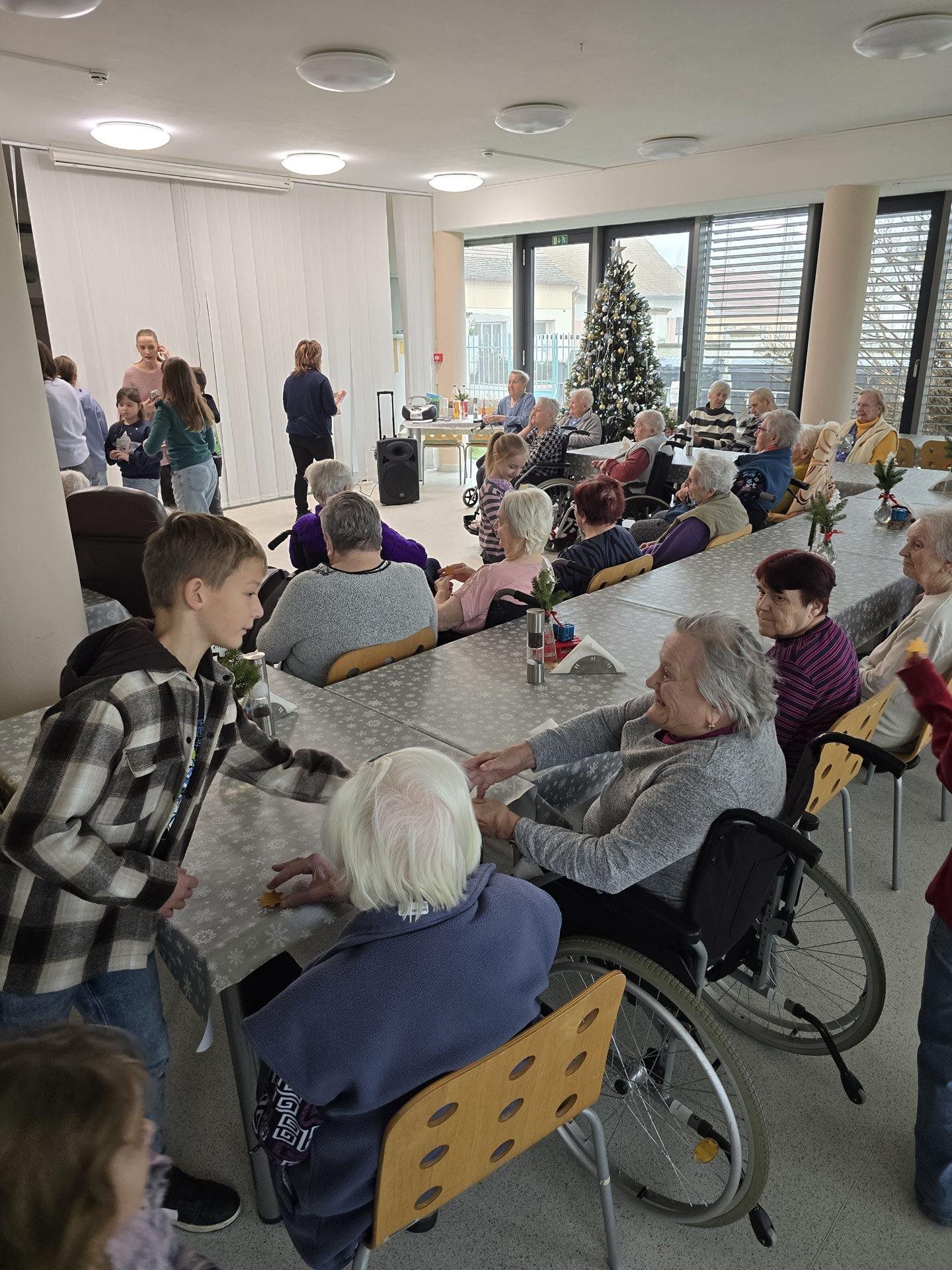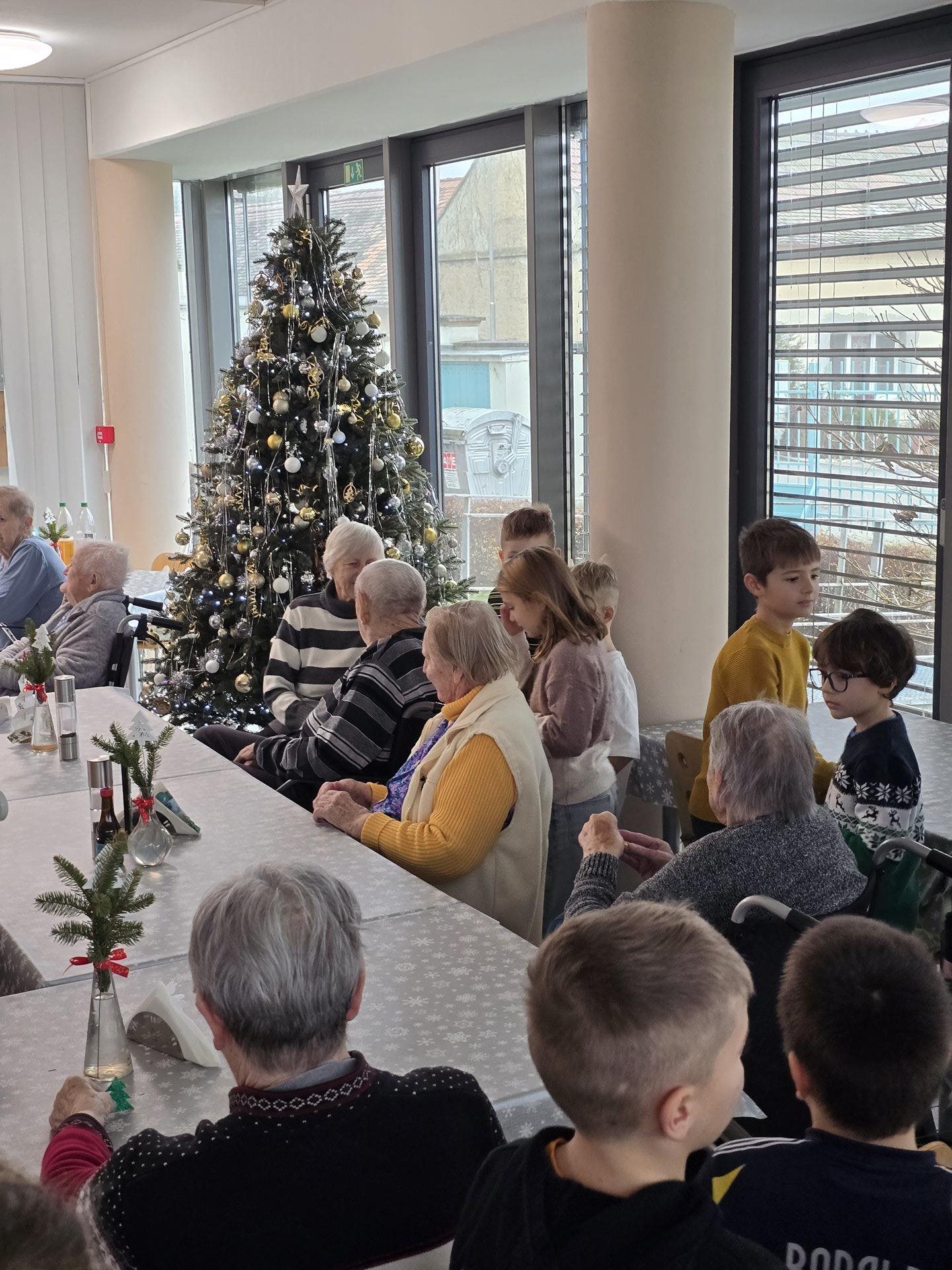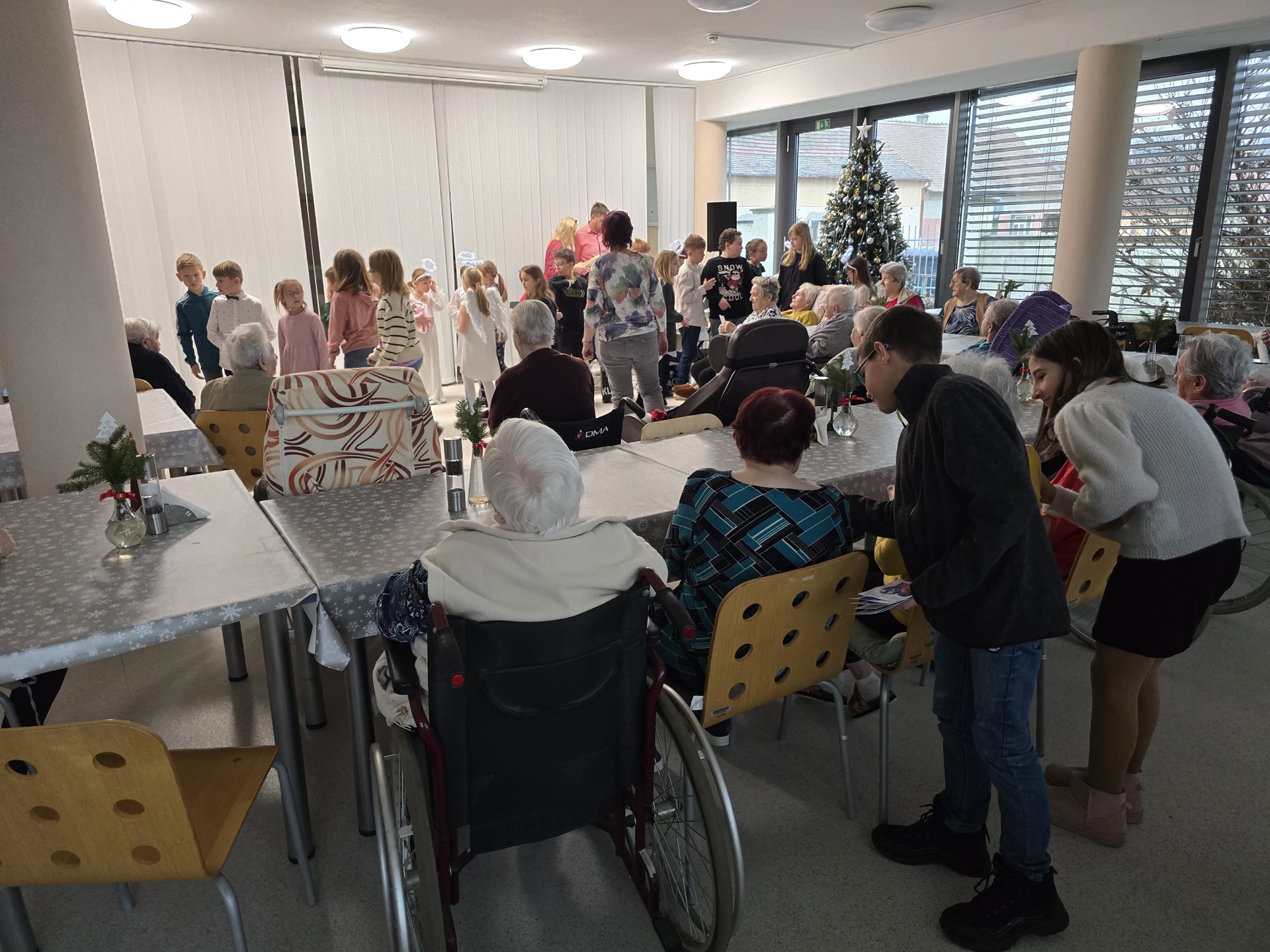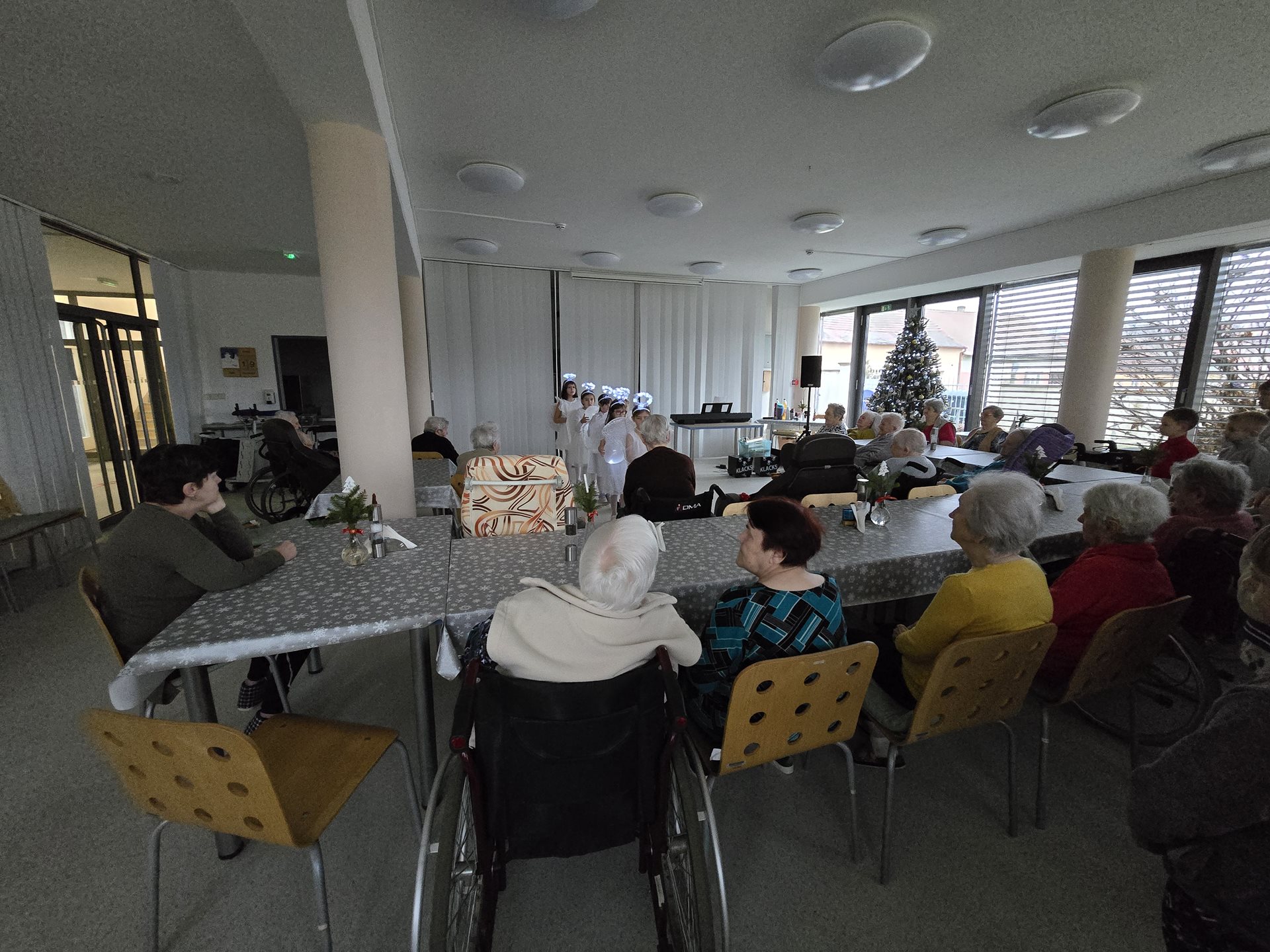 Čtvrteční a páteční dopoledne nám zpříjemnily krásné známé i neznámé písně v podání dětí ze základních škol. Všechny děti od těch nejmenších až po ty největší se sešly, aby společně zatančily, zazpívaly a podarovaly uživatele našeho domova vlastnoručně vyrobenými vánočními přáníčky. Jedno z vystoupení začalo dokonce i tancem andílků, kteří měli osvětlené balonky, křídla a svatozáře a my pouzí přihlížející smrtelníci jsme jen vydechli „ach“. Je až neuvěřitelné, co všechno učitelé vymyslí, naplánují, natrénují a co vše si děti zapamatují a dokážou. Děti mají zvláštní vlastnost, a to že dokáží naše uživatele a uživatelky naladit na „pohodovou vlnu“, která na jejich rtech vykouzlí úsměv a v očích se jim zračí nekonečná láska. O tom, že obě vystoupení byla výjimečná svědčí i to, že se kolemjdoucí personál zastavoval, nakukoval do jídelny, kde se představení odehrávala, nebo si přímo přišel sednout a užít si vánoční radost a energii předávanou dětmi.