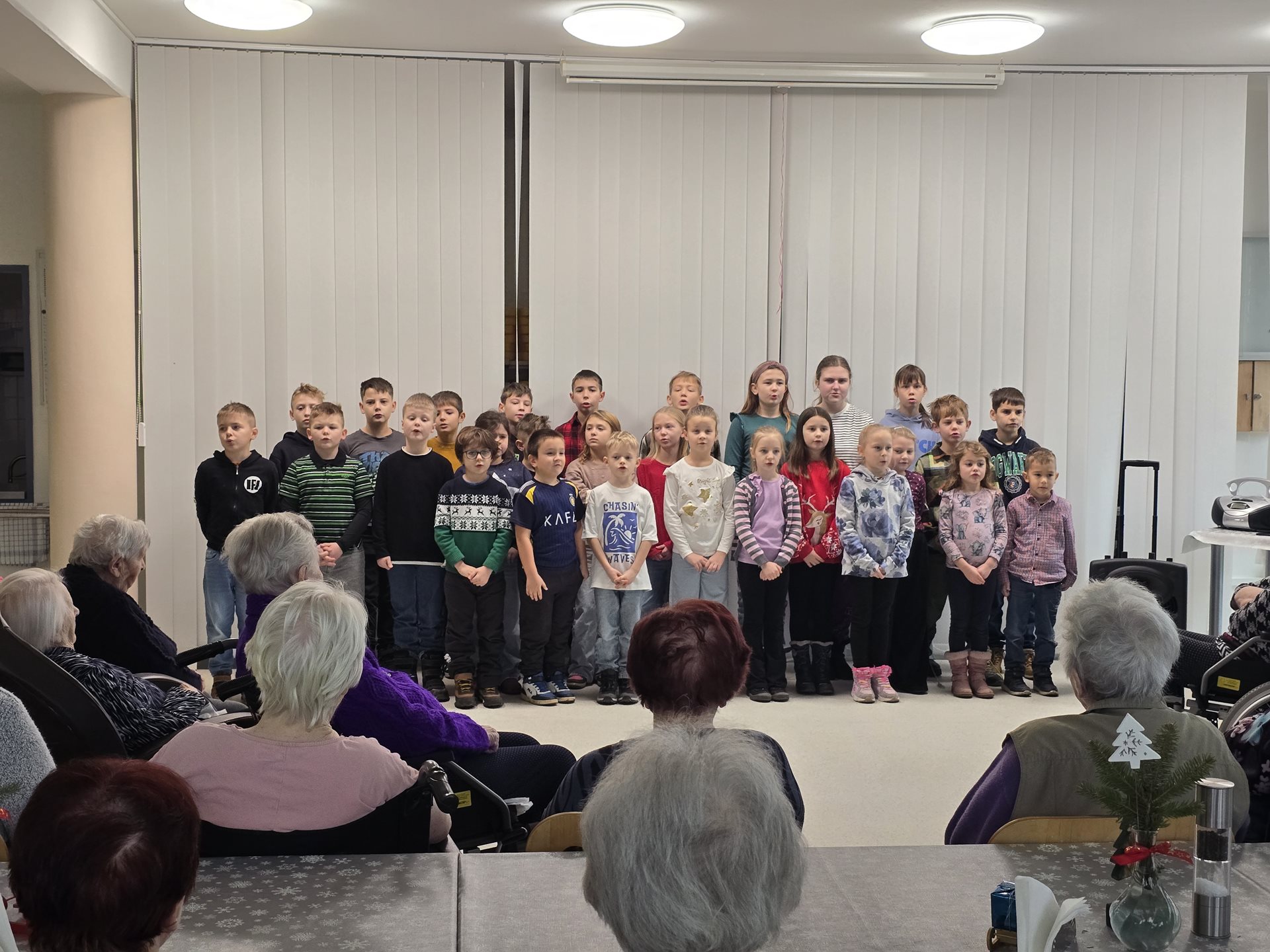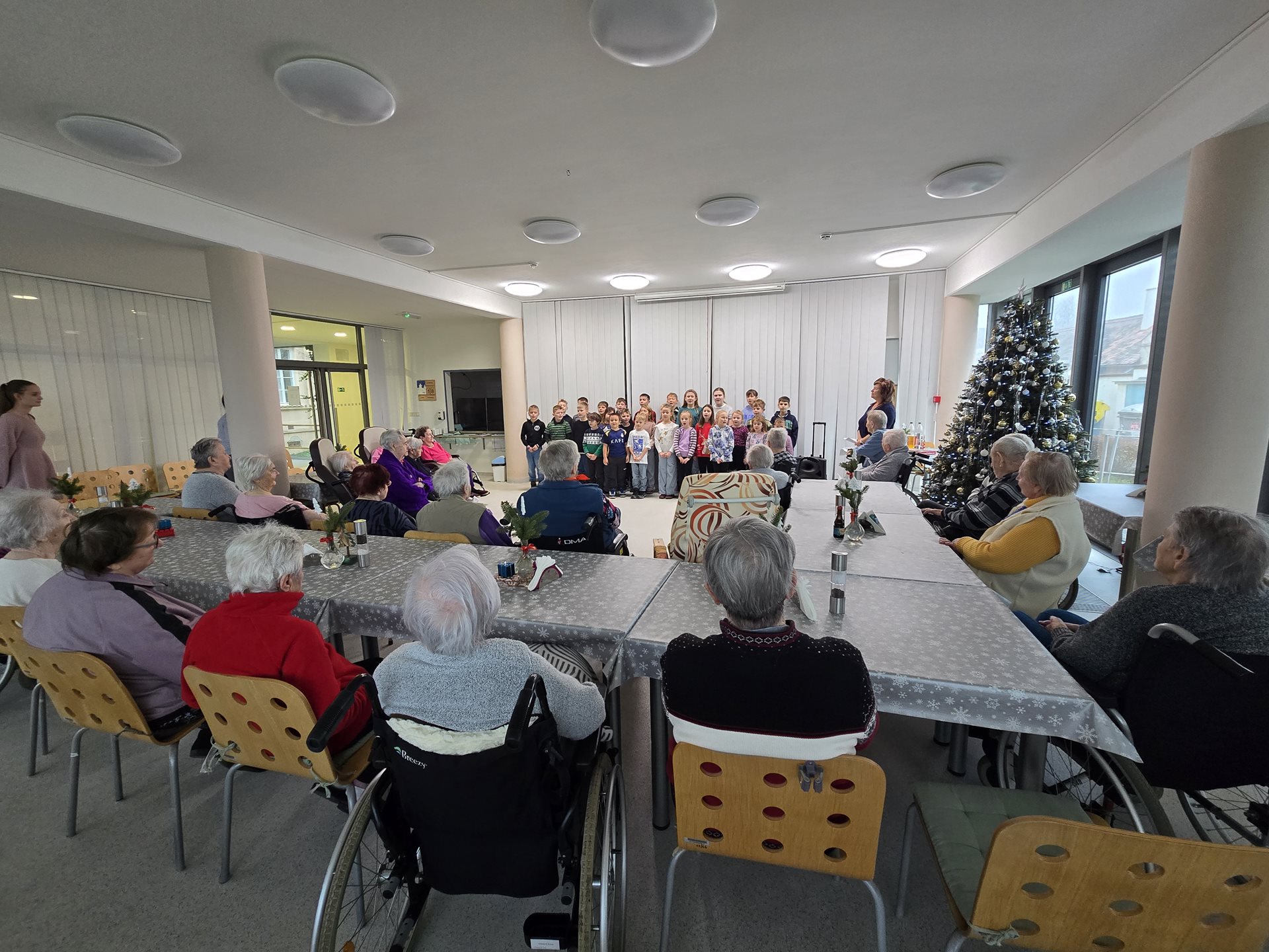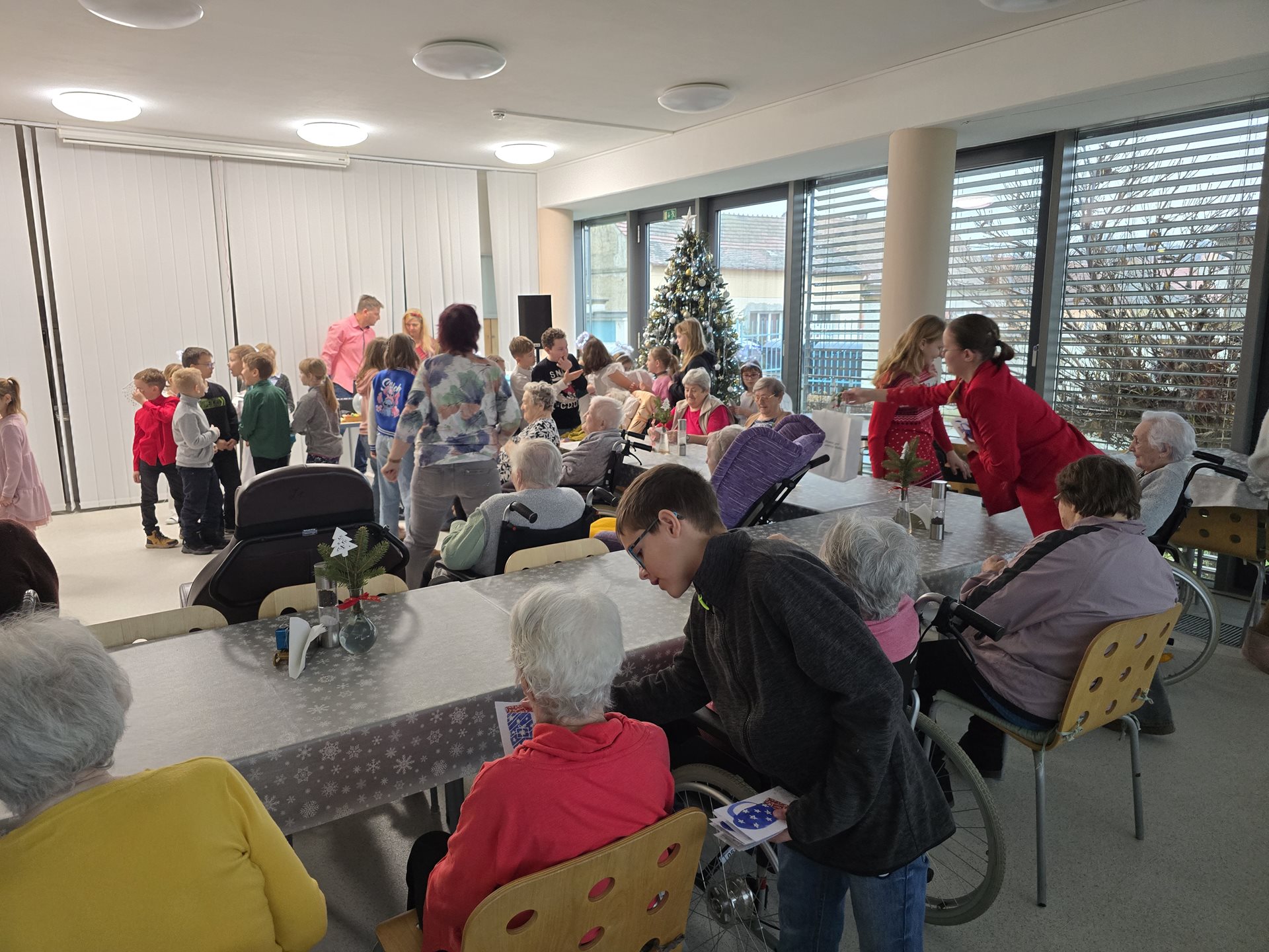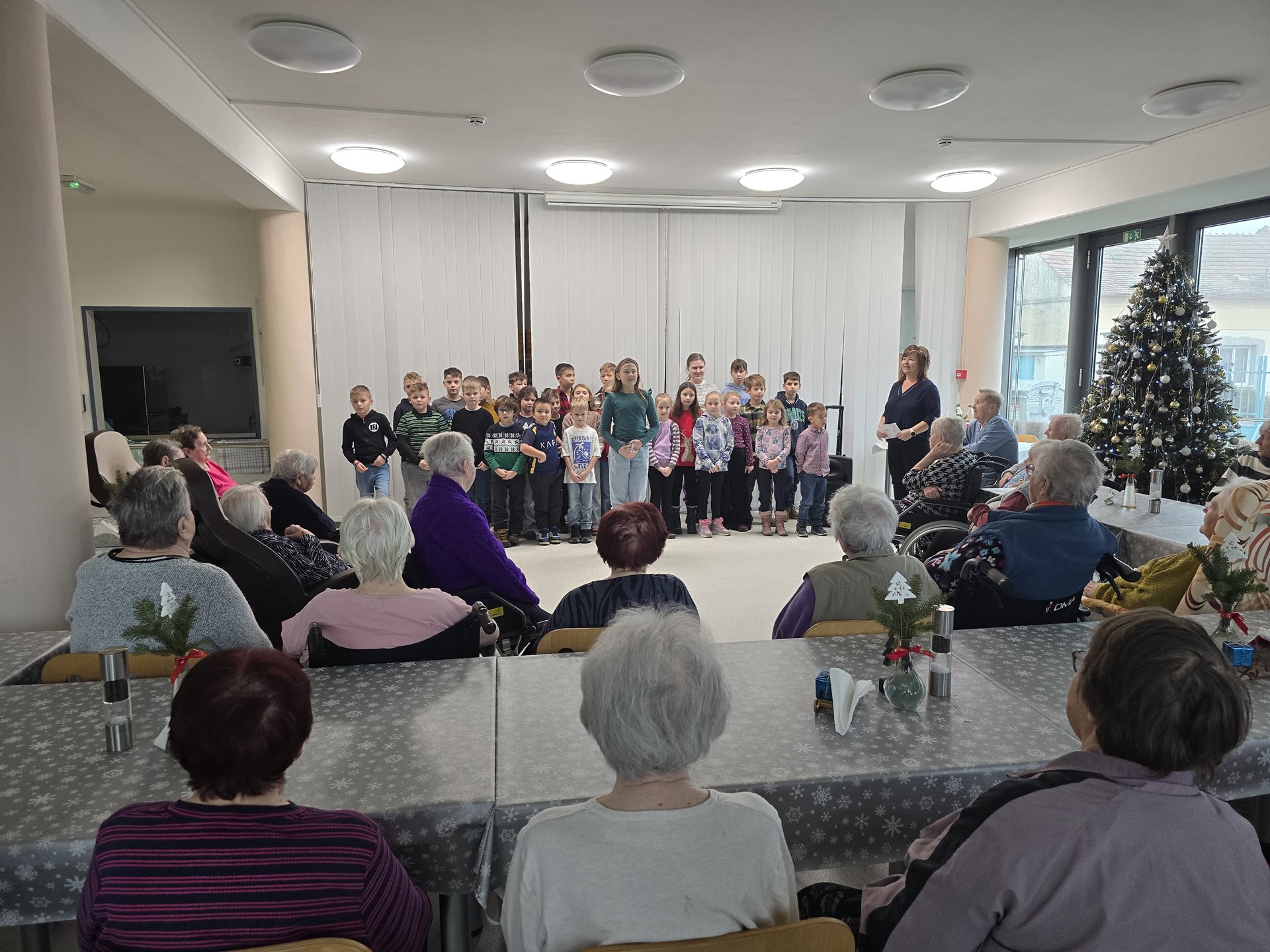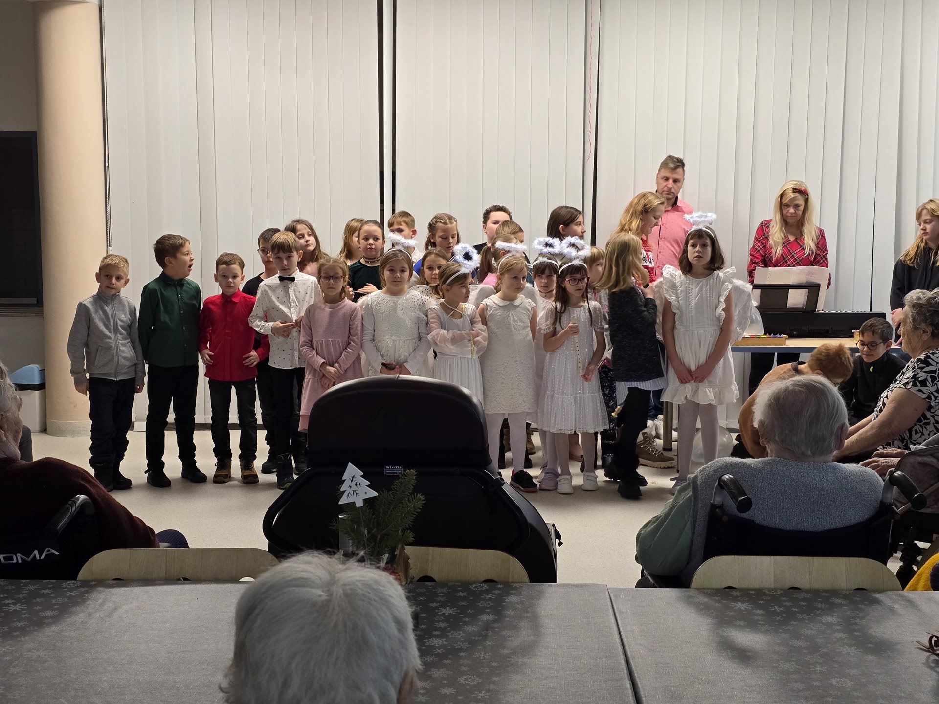 Čtvrteční a páteční dopoledne nám zpříjemnily krásné známé i neznámé písně v podání dětí ze základních škol. Všechny děti od těch nejmenších až po ty největší se sešly, aby společně zatančily, zazpívaly a podarovaly uživatele našeho domova vlastnoručně vyrobenými vánočními přáníčky. Jedno z vystoupení začalo dokonce i tancem andílků, kteří měli osvětlené balonky, křídla a svatozáře a my pouzí přihlížející smrtelníci jsme jen vydechli „ach“. Je až neuvěřitelné, co všechno učitelé vymyslí, naplánují, natrénují a co vše si děti zapamatují a dokážou. Děti mají zvláštní vlastnost, a to že dokáží naše uživatele a uživatelky naladit na „pohodovou vlnu“, která na jejich rtech vykouzlí úsměv a v očích se jim zračí nekonečná láska. O tom, že obě vystoupení byla výjimečná svědčí i to, že se kolemjdoucí personál zastavoval, nakukoval do jídelny, kde se představení odehrávala, nebo si přímo přišel sednout a užít si vánoční radost a energii předávanou dětmi.