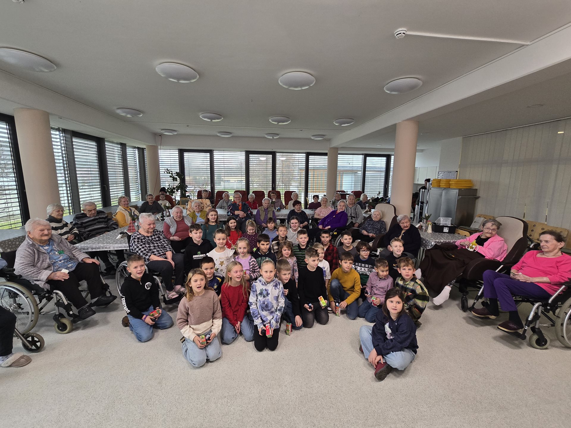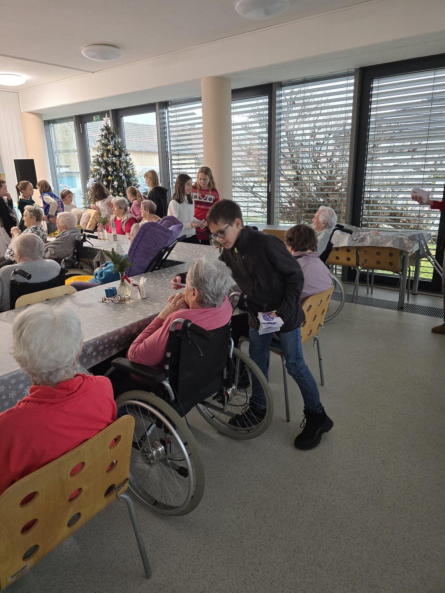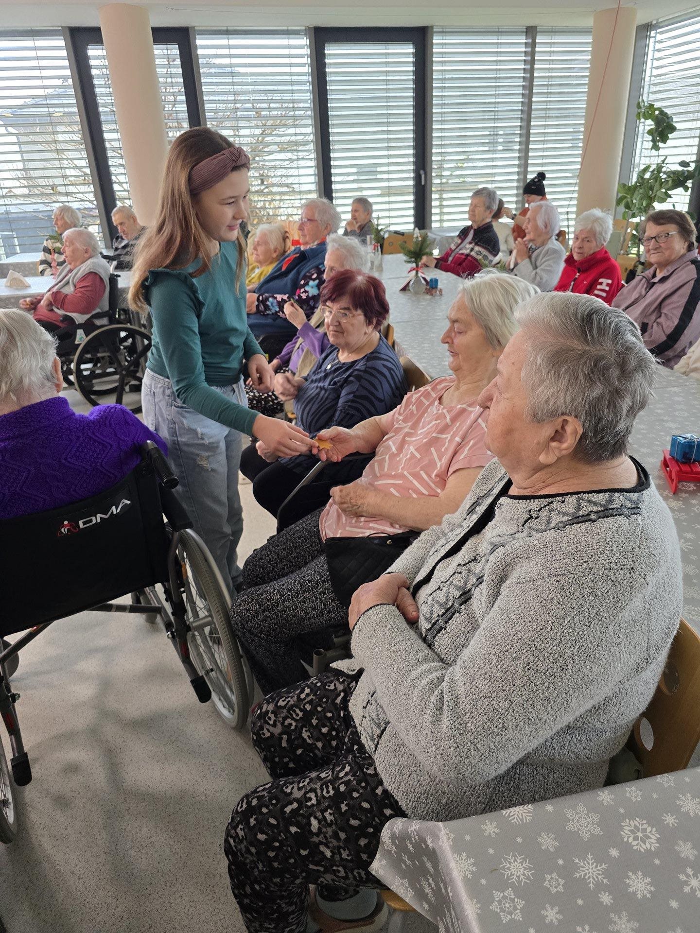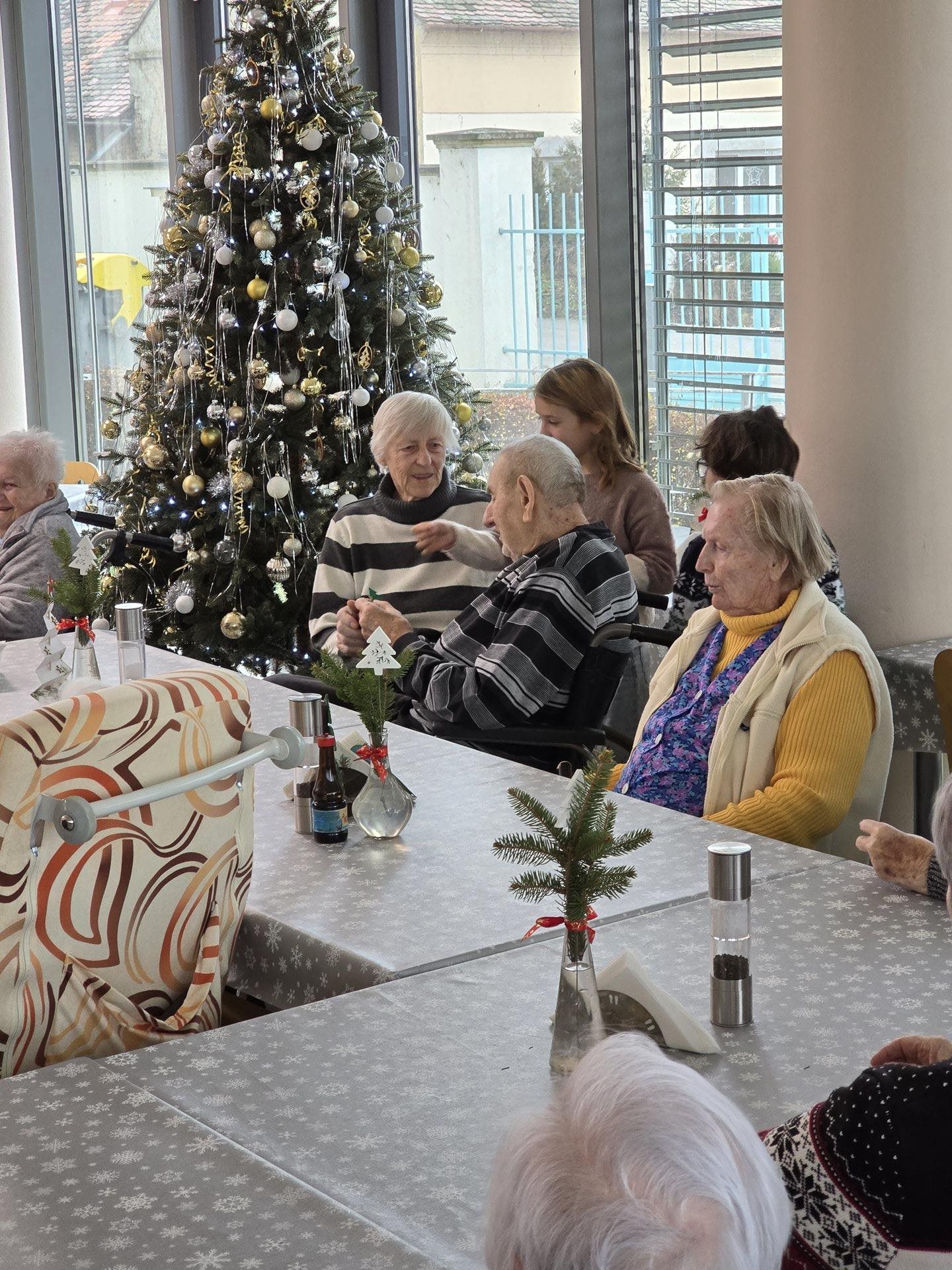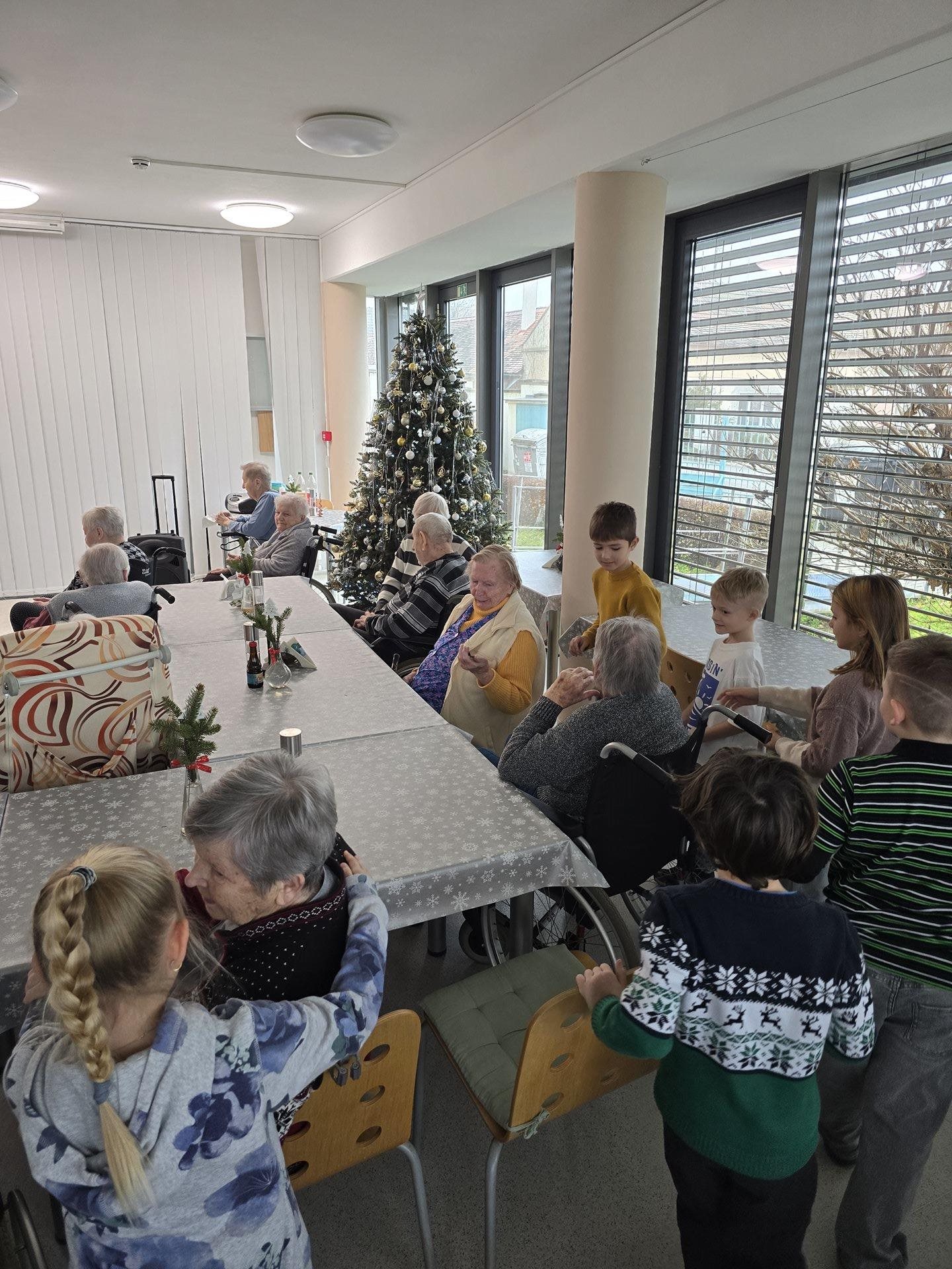 Čtvrteční a páteční dopoledne nám zpříjemnily krásné známé i neznámé písně v podání dětí ze základních škol. Všechny děti od těch nejmenších až po ty největší se sešly, aby společně zatančily, zazpívaly a podarovaly uživatele našeho domova vlastnoručně vyrobenými vánočními přáníčky. Jedno z vystoupení začalo dokonce i tancem andílků, kteří měli osvětlené balonky, křídla a svatozáře a my pouzí přihlížející smrtelníci jsme jen vydechli „ach“. Je až neuvěřitelné, co všechno učitelé vymyslí, naplánují, natrénují a co vše si děti zapamatují a dokážou. Děti mají zvláštní vlastnost, a to že dokáží naše uživatele a uživatelky naladit na „pohodovou vlnu“, která na jejich rtech vykouzlí úsměv a v očích se jim zračí nekonečná láska. O tom, že obě vystoupení byla výjimečná svědčí i to, že se kolemjdoucí personál zastavoval, nakukoval do jídelny, kde se představení odehrávala, nebo si přímo přišel sednout a užít si vánoční radost a energii předávanou dětmi.