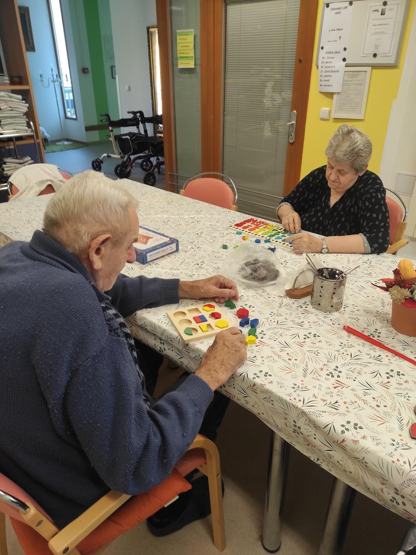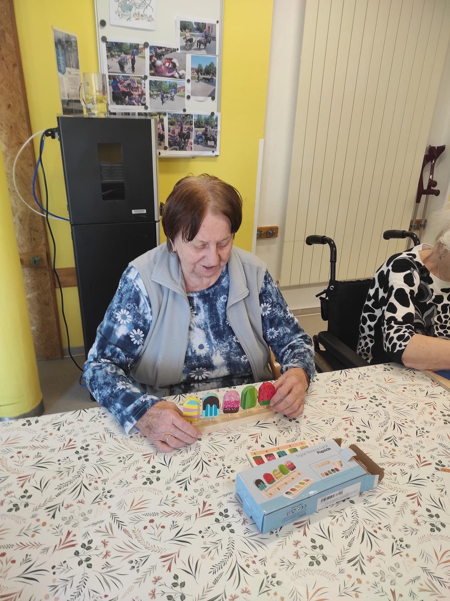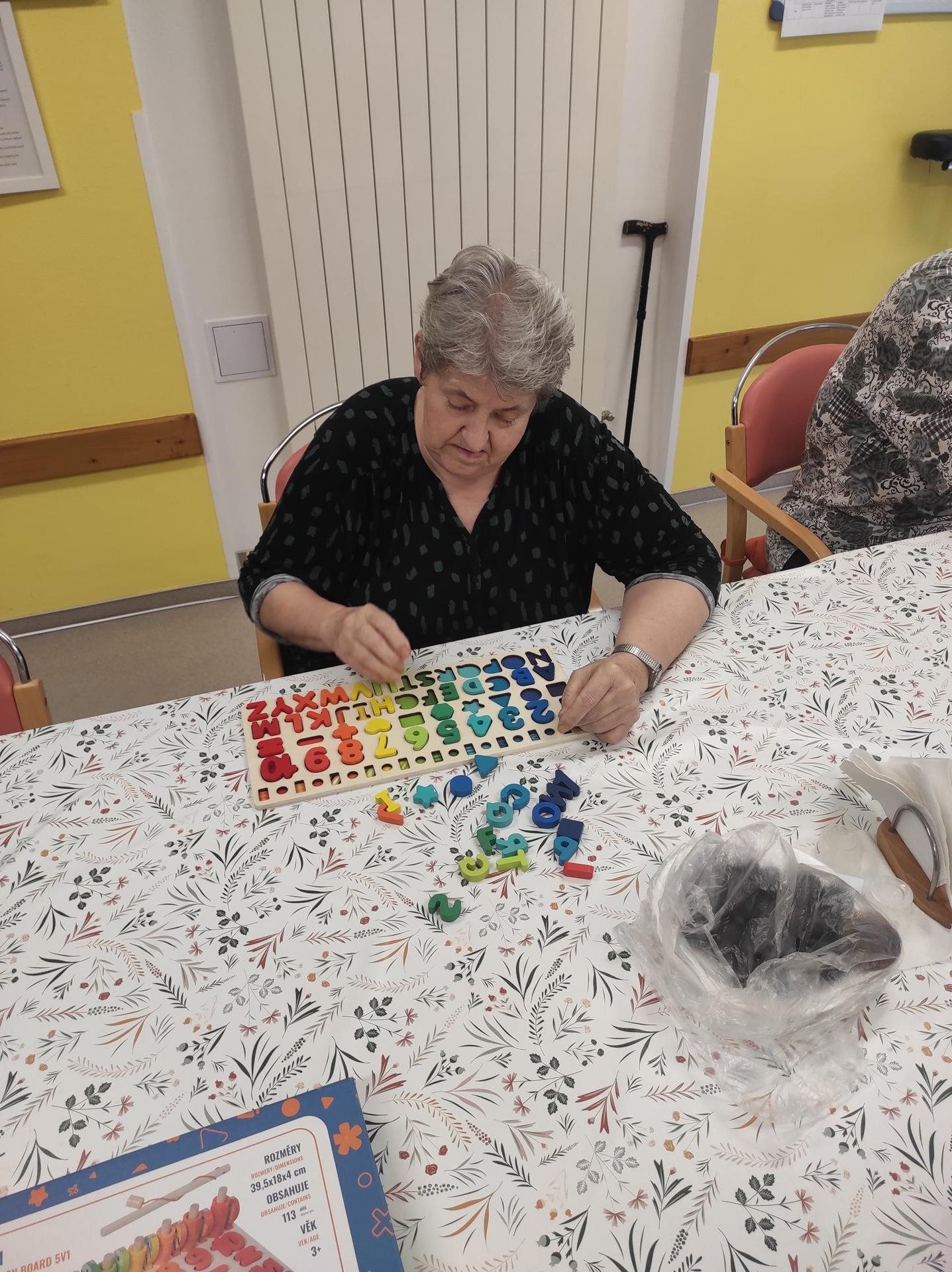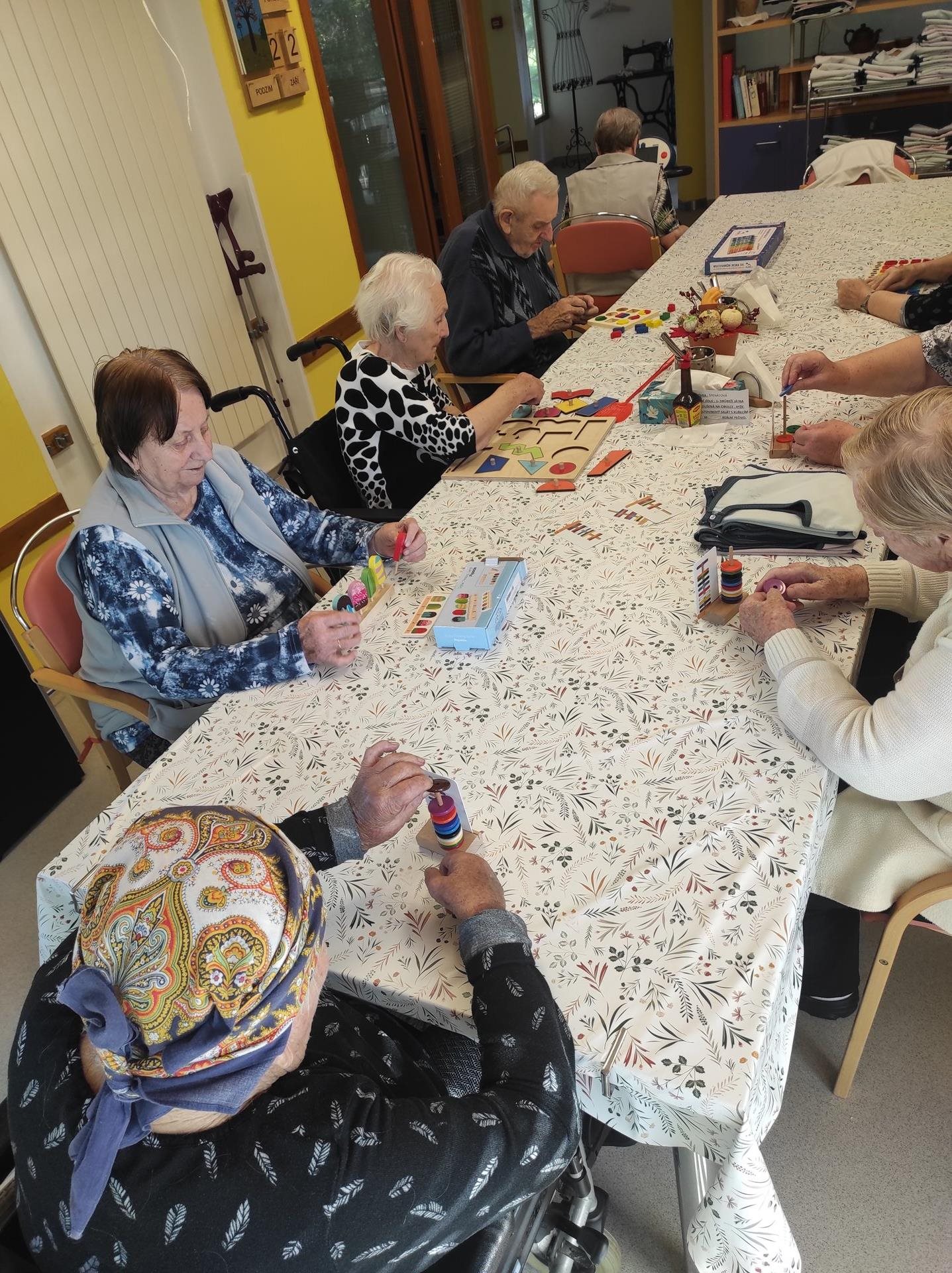 Středeční dopoledne bylo na pavilonu A slyšet hudbu a smích. To proto, že naši uživatelé trénovali jemnou motoriku nejen skládáním prostírek, které je stále neúnavně baví, ale také pomocí různých pomůcek, které se běžně používají především k individuální aktivizaci uživatelů na pokoji/lůžku. Tyto pomůcky jsou barevné, mají různé tvary a profily a jsou vyrobeny z nejrůznějších materiálů, a tak jen hmatovým kontaktem s nimi vznikají a šíří se podněty v nervových drahách a dochází tak ke stimulaci nervů i mozku. Reakce uživatelů na dobře doplněný nebo sestavený "úkol" je k nezaplacení. A co když zadanou aktivitu nezvládnou na 100%? V našem kruhu panuje tak pozitivní a podporující atmosféra, že to uživatelé hodí za hlavu a ještě si z celé situace umí udělat legraci a ze srdce se zasmát. A tak to má být.