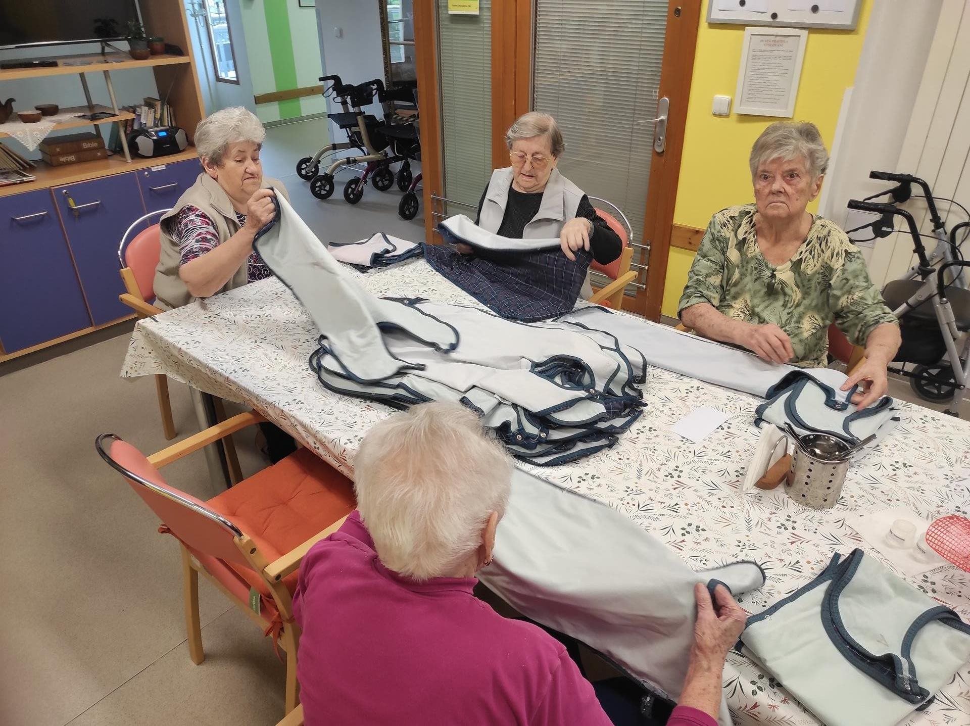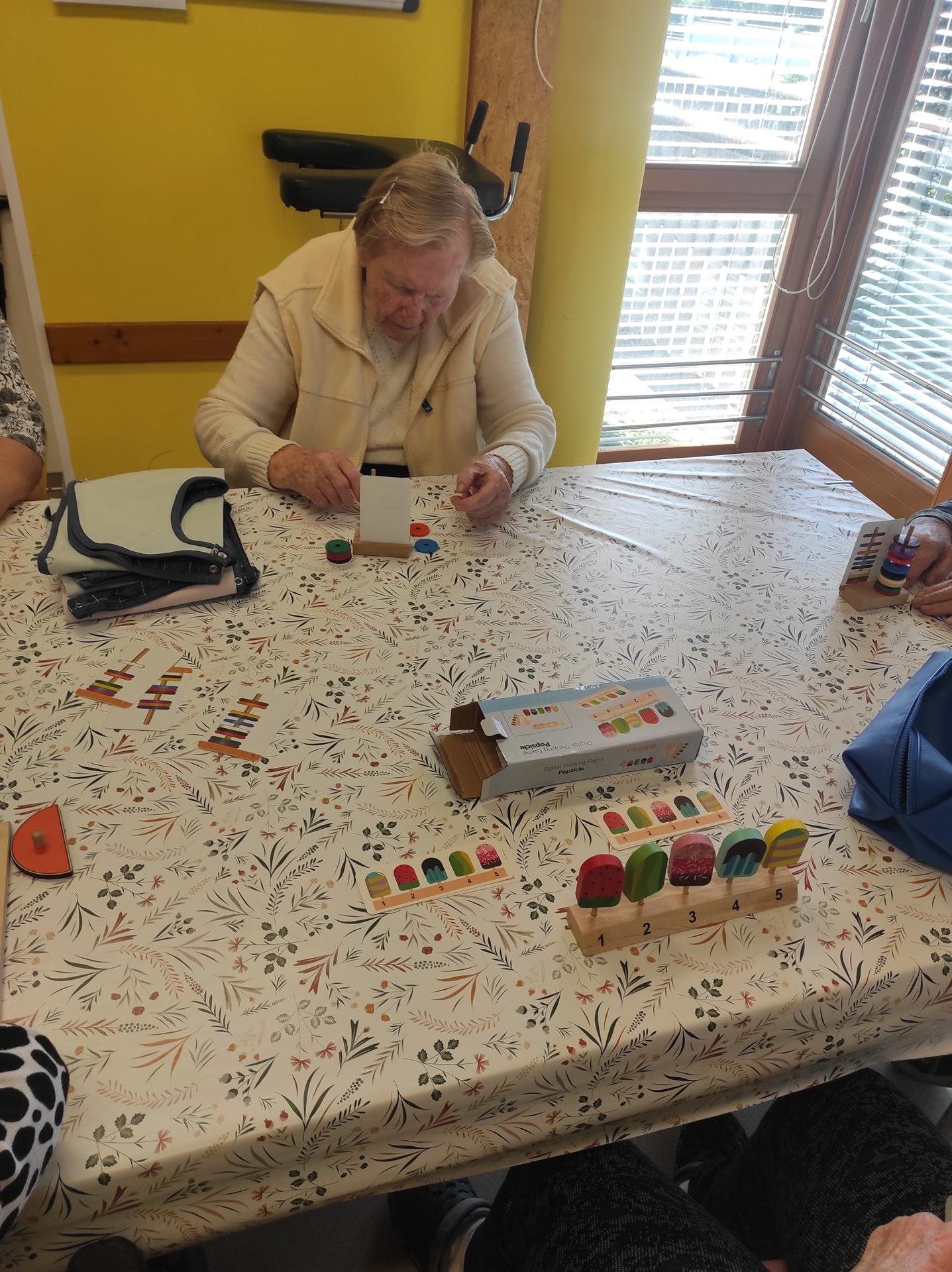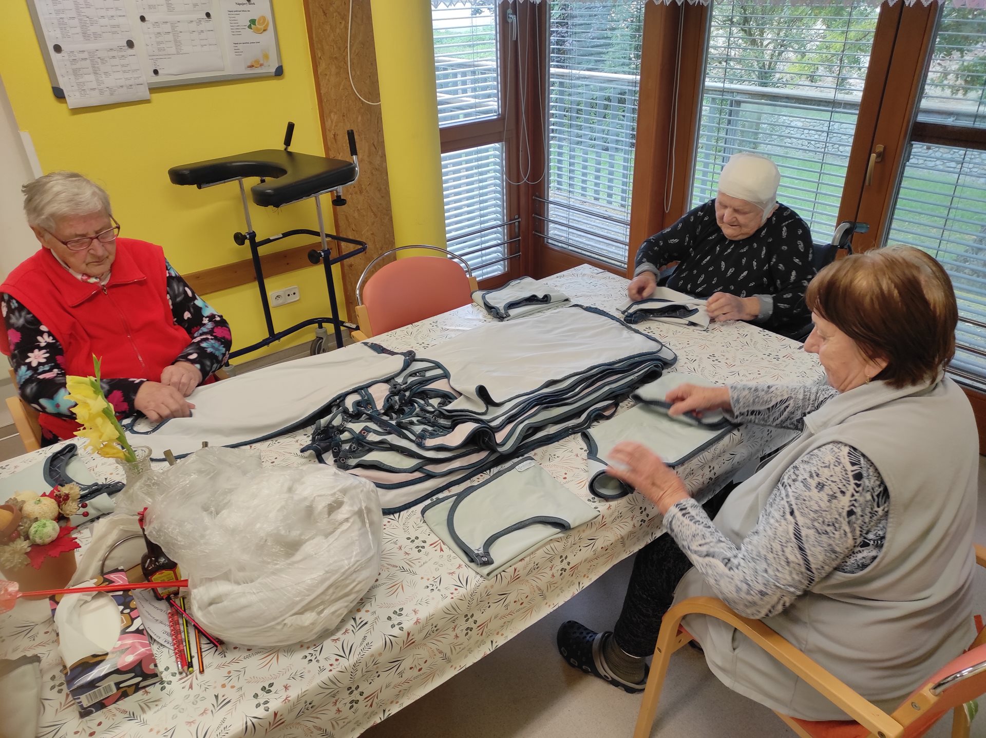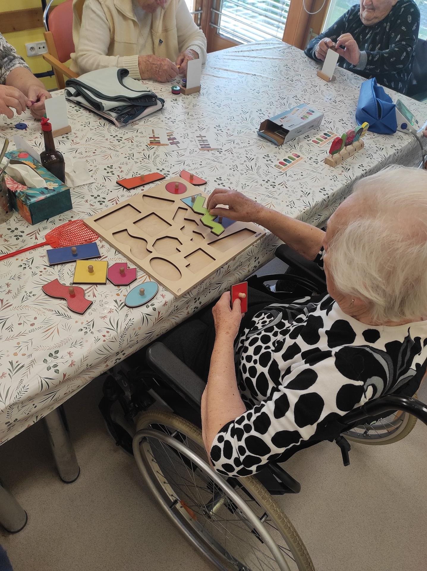 Středeční dopoledne bylo na pavilonu A slyšet hudbu a smích. To proto, že naši uživatelé trénovali jemnou motoriku nejen skládáním prostírek, které je stále neúnavně baví, ale také pomocí různých pomůcek, které se běžně používají především k individuální aktivizaci uživatelů na pokoji/lůžku. Tyto pomůcky jsou barevné, mají různé tvary a profily a jsou vyrobeny z nejrůznějších materiálů, a tak jen hmatovým kontaktem s nimi vznikají a šíří se podněty v nervových drahách a dochází tak ke stimulaci nervů i mozku. Reakce uživatelů na dobře doplněný nebo sestavený "úkol" je k nezaplacení. A co když zadanou aktivitu nezvládnou na 100%? V našem kruhu panuje tak pozitivní a podporující atmosféra, že to uživatelé hodí za hlavu a ještě si z celé situace umí udělat legraci a ze srdce se zasmát. A tak to má být.