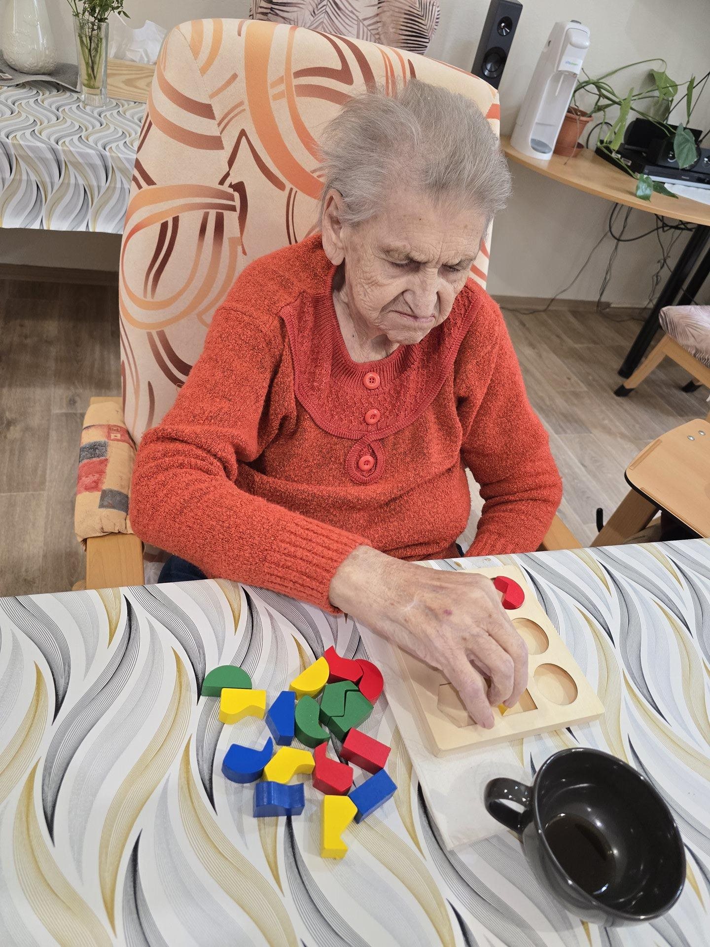 Ve středu dopoledne si uživatelky na pavilonu Z procvičily paměť prostřednictvím poznávání různých květin a bylin. Při této příležitosti jsme si všichni společně vykládali, jaké rostliny si uživatelky pěstovaly doma, a které mají nejradši. Během této aktivity si uživatelky procvičily také jemnou motoriku a to tak, že do dřevěné desky skládaly různé geometrické tvary - aby to všechno do sebe hezky zapadlo. Uživatelkám se středeční dopoledne moc líbilo a samozřejmě nechyběly ani vtipné chvilky, kdy jsme se všechny upřímně a od srdce zasmály.