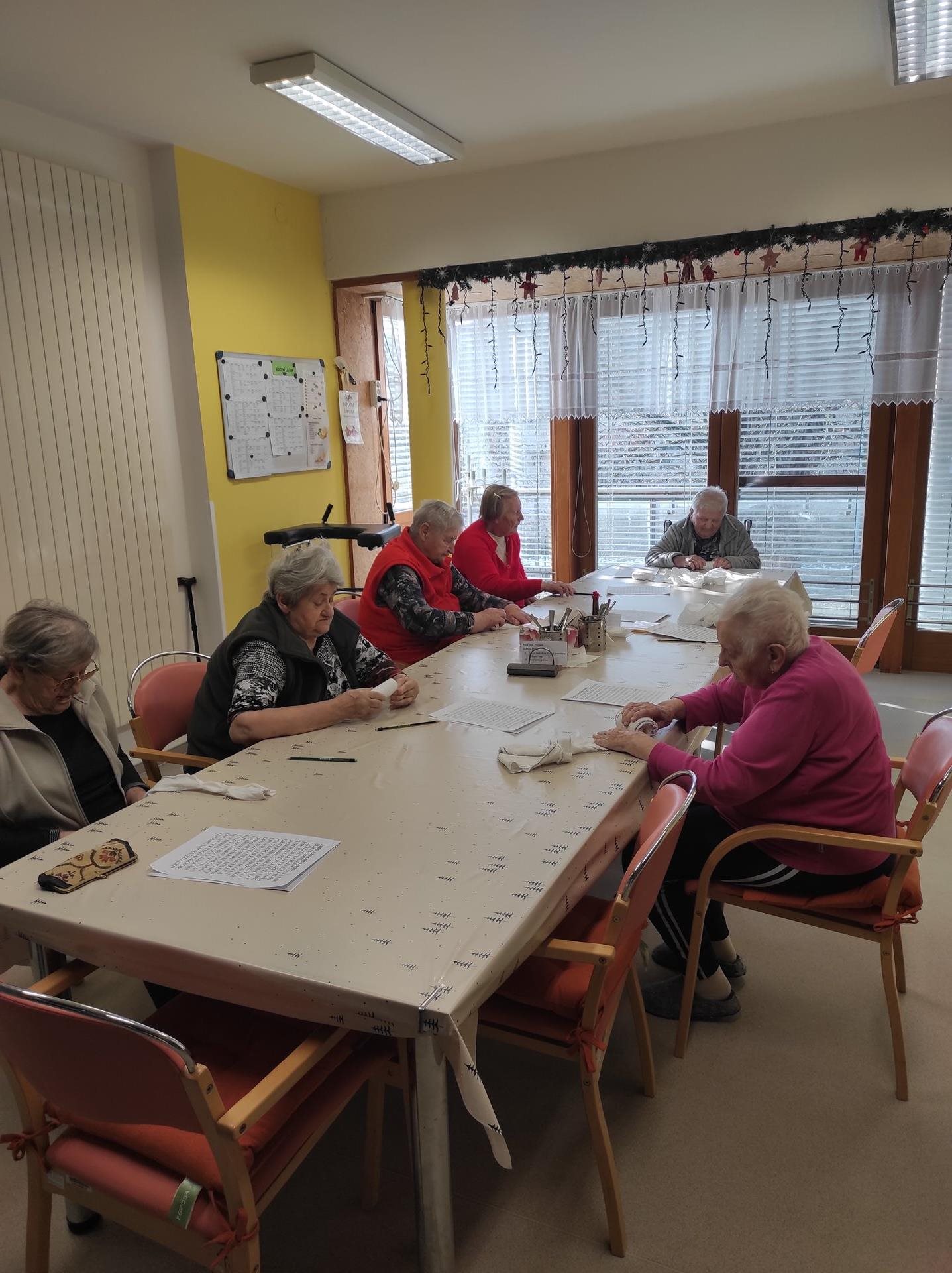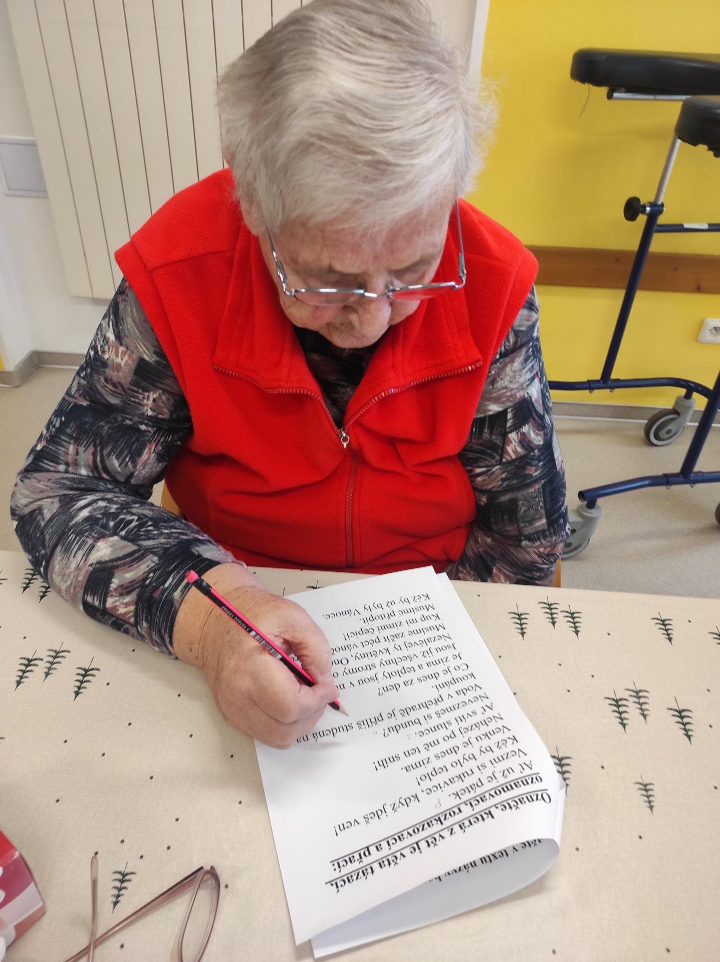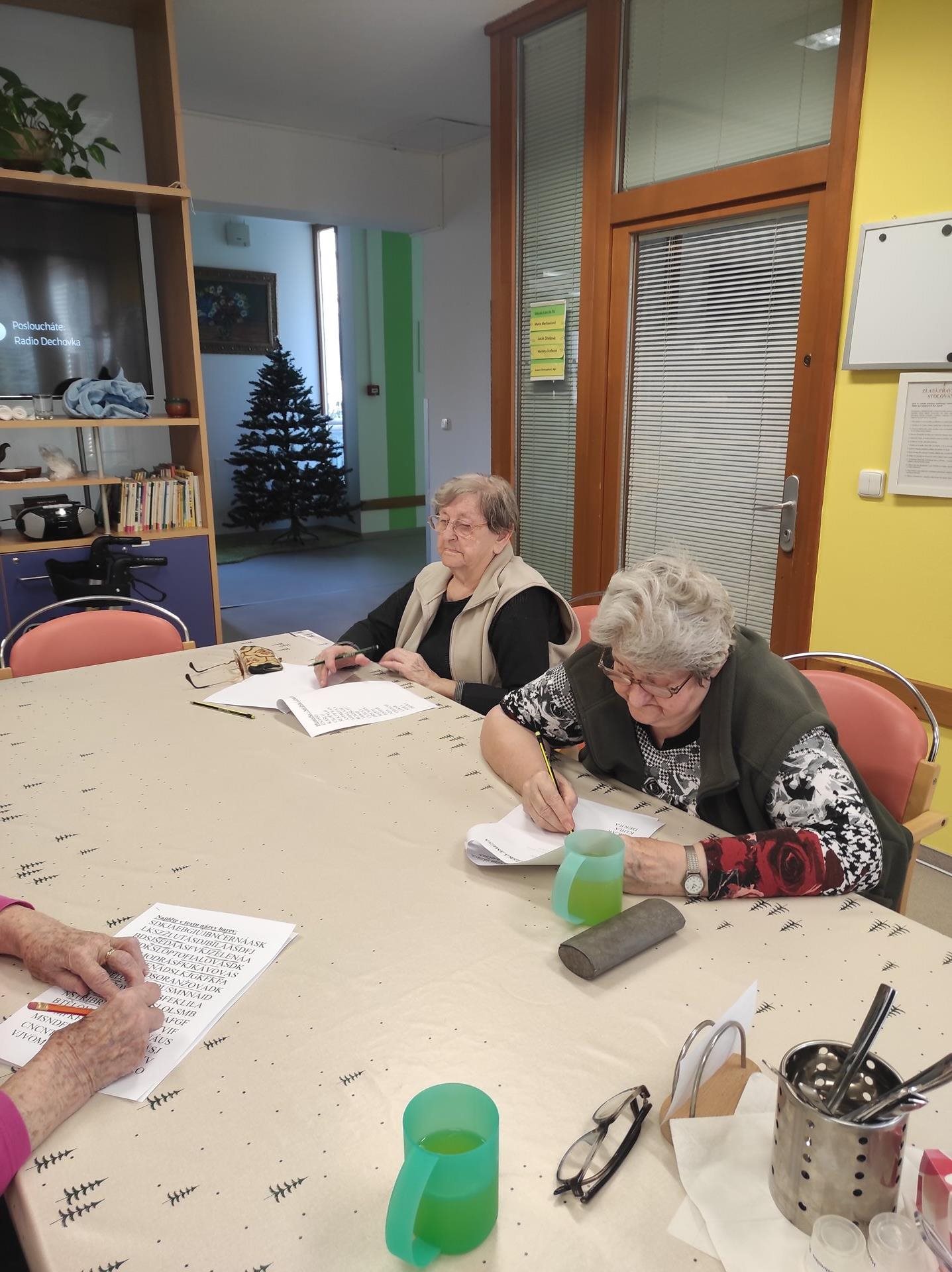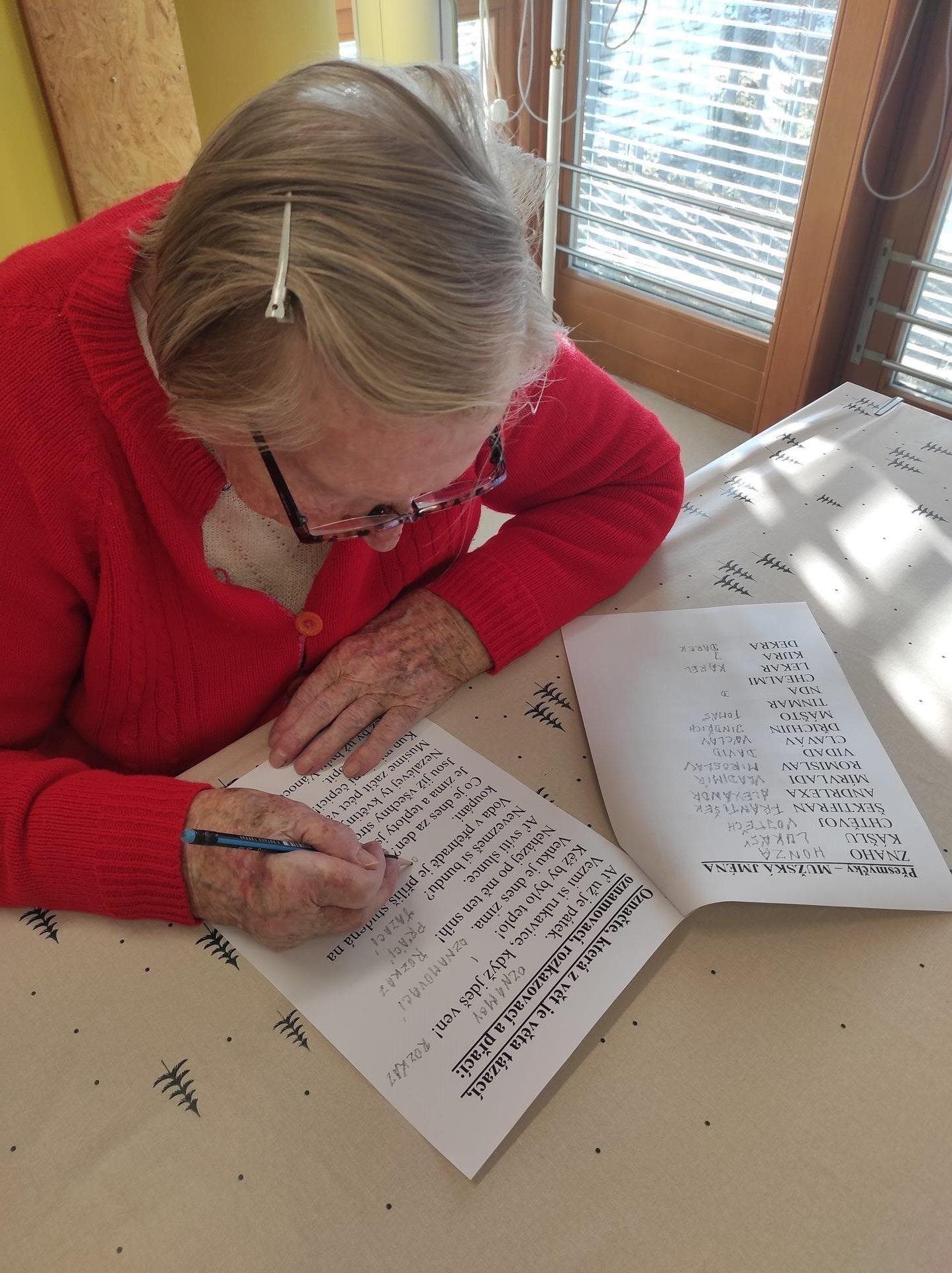 Ve středu jsme s uživatelkami trénovaly nejen jemnou motoriku prostřednictvím velmi oblíbeného skládání prostírek, ale také kognitivní funkce, do kterých patří mj. dlouhodobá a krátkodobá paměť, pozornost, koncentrace, zpracovávání informací, schopnost vyjadřování, porozumění a třeba i prostorová orientace. Uživatelky tak třídily jednoduché věty na oznamovací, rozkazovací, tázací a přací. Dále opravovaly notoricky známé názvy filmů, které byly zapsány chybně. Hledaly názvy barev ve změti písmen a skládaly z přesmyček mužská jména. A musíme uznat, že jim to šlo na výbornou. A co vy? Jaká jména se ukrývají pod přesmyčkami - KÁLUŠ,VIDAD,LEKRA a DEKRA?