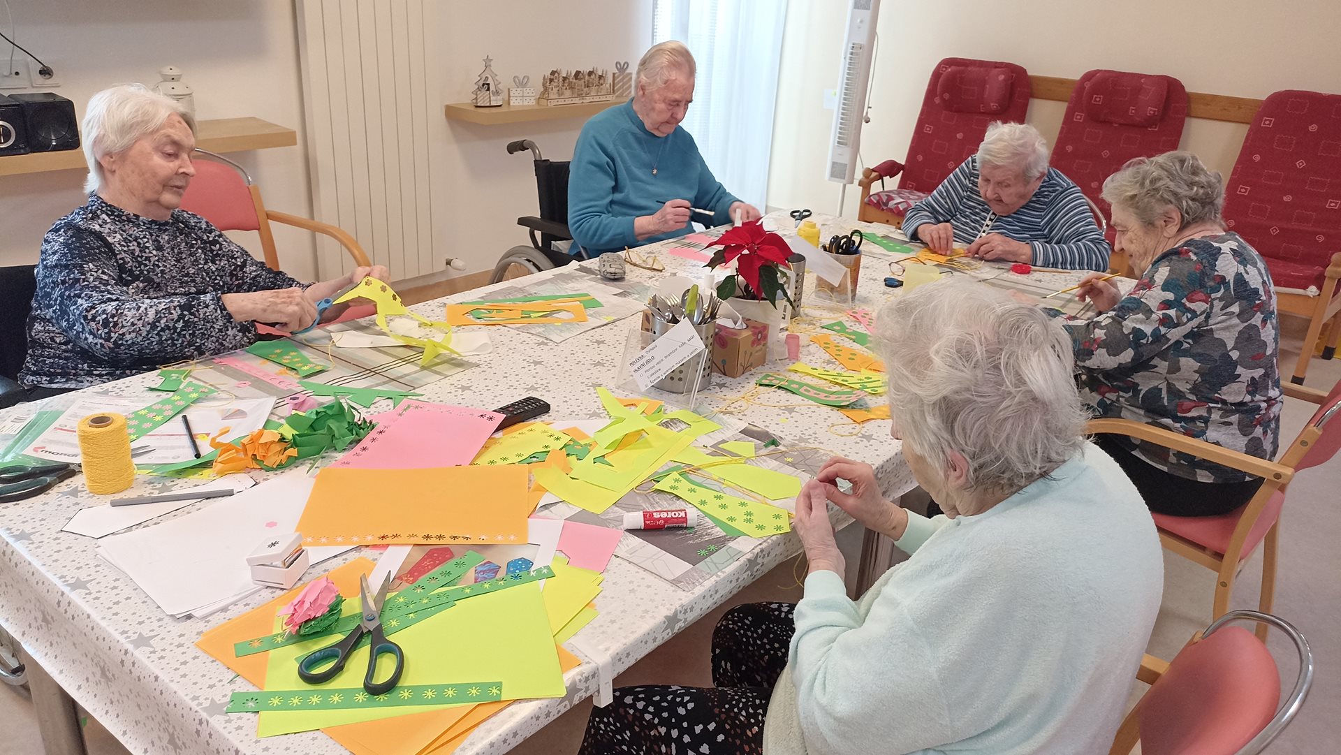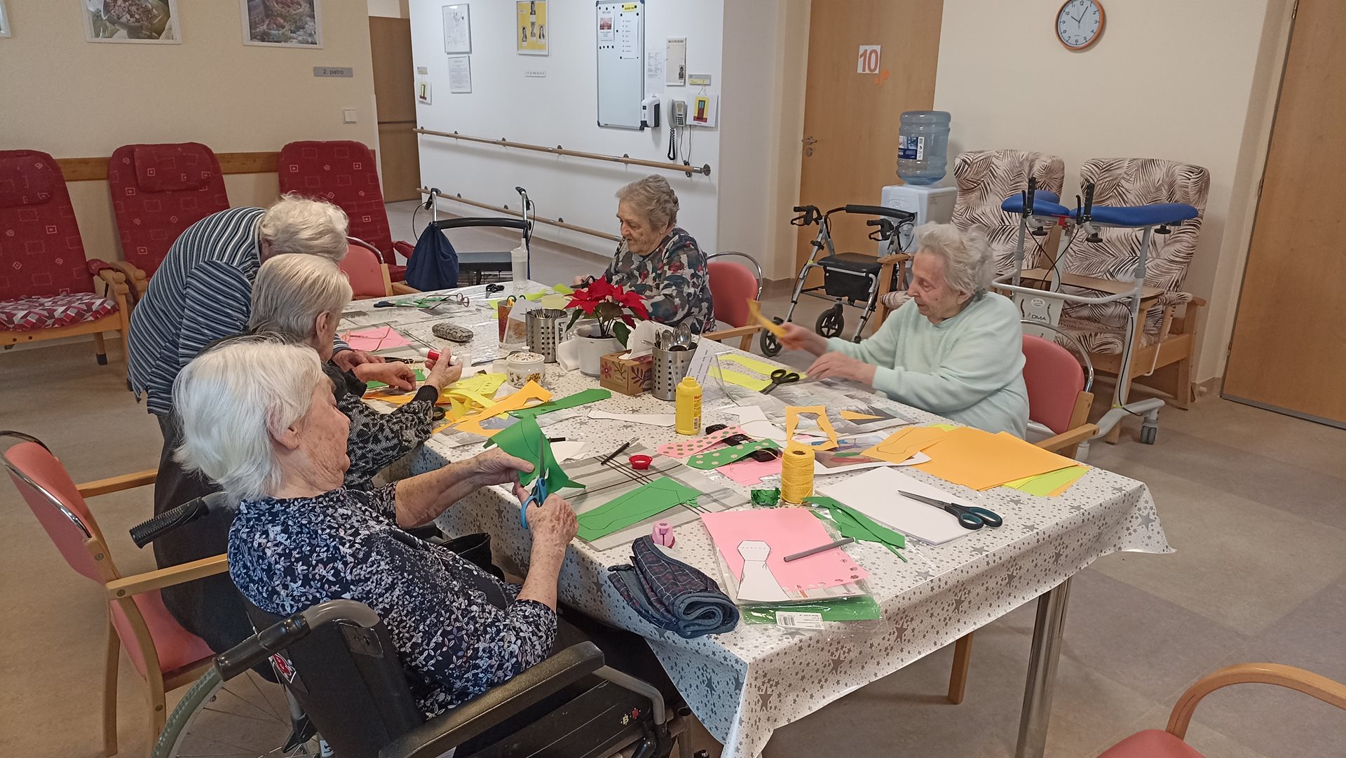 V našem domově proběhla tvořivá dílna na oddělení zaměřená na arteterapii, jejímž cílem byla příprava masek na blížící se maškarní ples. Uživatelé se s chutí zapojili do výroby škrabošek a veselých kravat z barevného papíru. Při tvoření si procvičovali jemnou i hrubou motoriku, koordinaci pohybů a soustředění, a zároveň mohli uplatnit svou fantazii a kreativitu. Celou dílnu provázel poslech oblíbené dechové hudby, která navodila příjemnou atmosféru a podpořila reminiscenci. Vzpomínky na dřívější plesy, zábavy a ruční práce se přirozeně prolínaly s rozhovory a sdílením zážitků. Tvoření se tak stalo nejen terapeutickou aktivitou, ale i příležitostí k sociálnímu kontaktu a posílení dobré nálady. Vznikly krásné, originální výrobky, které dokazují, že naši uživatelé mají stále velmi šikovné ruce a chuť tvořit. Maškarní ples tak bude o to radostnější a osobnější.