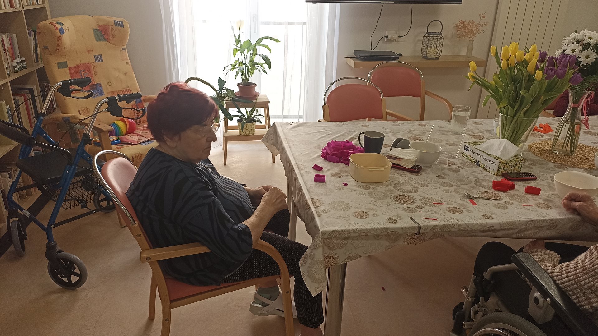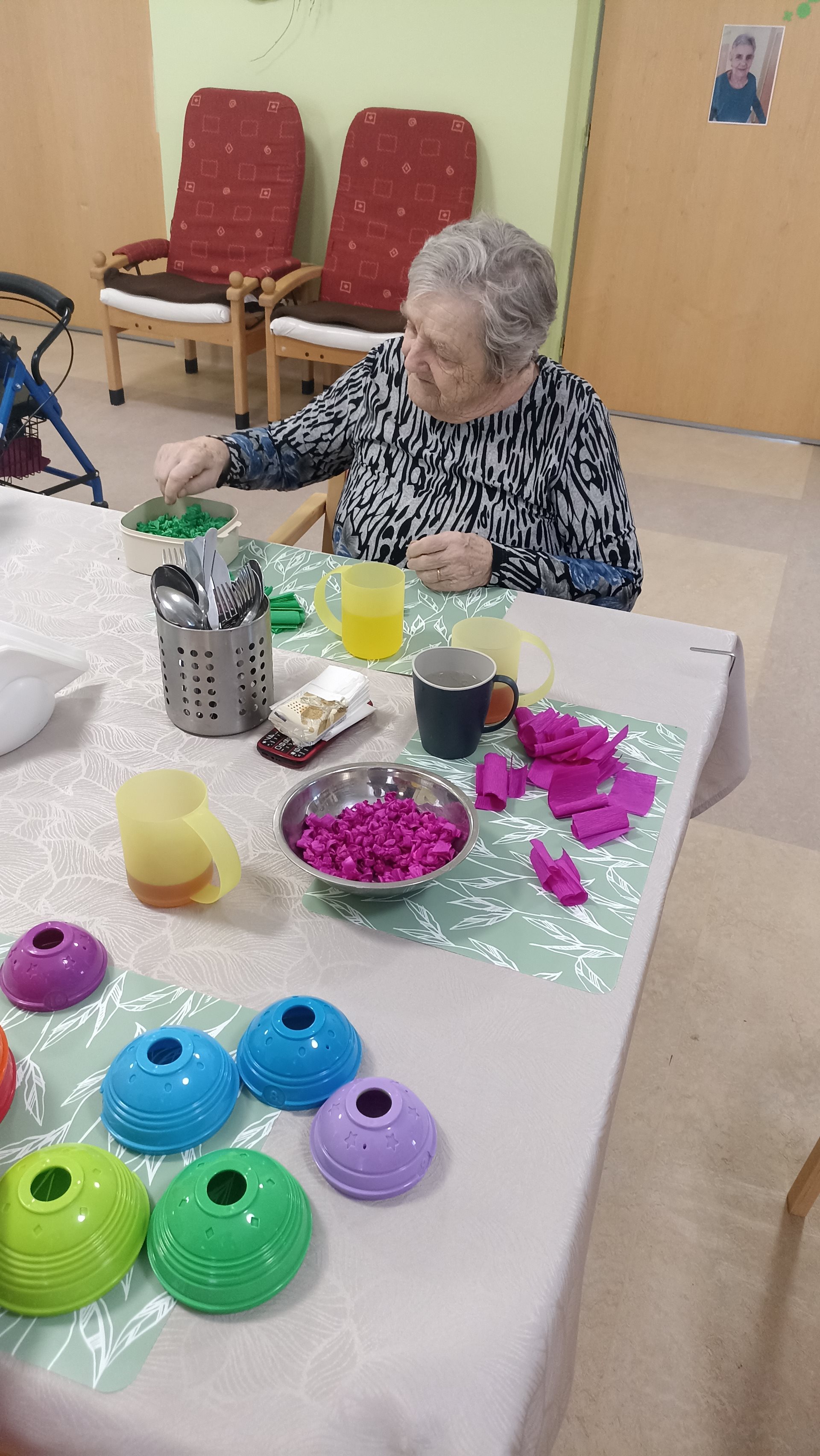 V našem Domově pro seniory pravidelně probíhají tvořivé dílny, které jsou nejen oblíbenou aktivitou pro trávení volného času, ale i cenným prostředkem pro udržování motorických dovedností. Tentokrát jsme se společně pustili do tvoření barevných kuliček z krepového papíru. Práce s krepovým papírem je nejen příjemná na dotek, ale také ideální pro procvičení jemné motoriky prstů. Uživatelé pečlivě tvarovali kuličky, lepili je na připravené šablony a vytvářeli pestré obrazy plné fantazie. Během dílny panovala přátelská atmosféra, nechyběl smích, vzpomínky ani chuť tvořit. Tvořivé aktivity hrají v životě seniorů důležitou roli – podporují paměť, trpělivost a soustředění, a zároveň přinášejí radost z výsledku i pocit smysluplně stráveného času. Děkujeme všem zúčastněným za jejich energii, kreativitu a chuť zapojit se. Těšíme se na další společné tvoření, které přináší nejen krásné výtvory, ale především blízkost, spolupráci a radost ze sdíleného okamžiku.