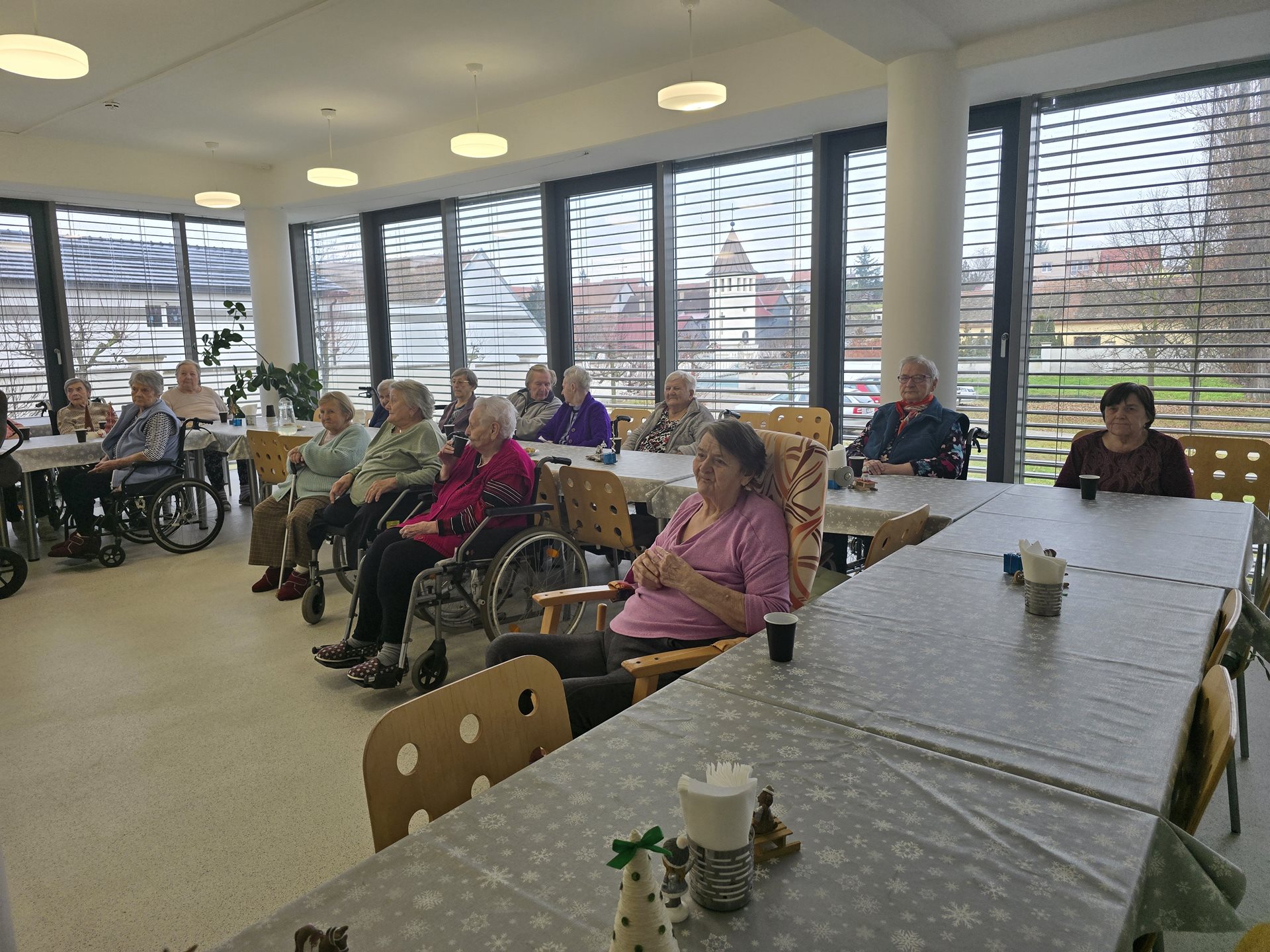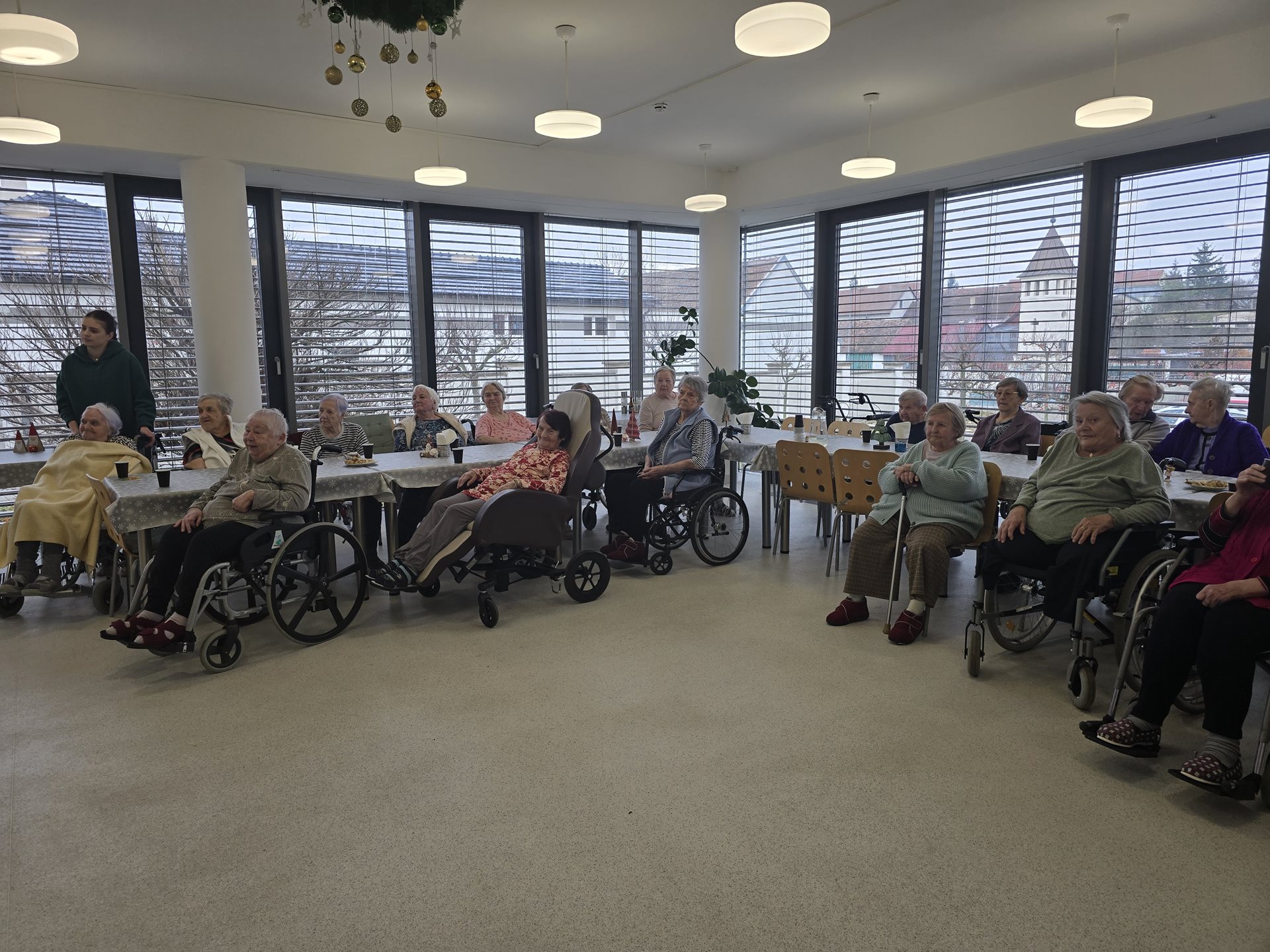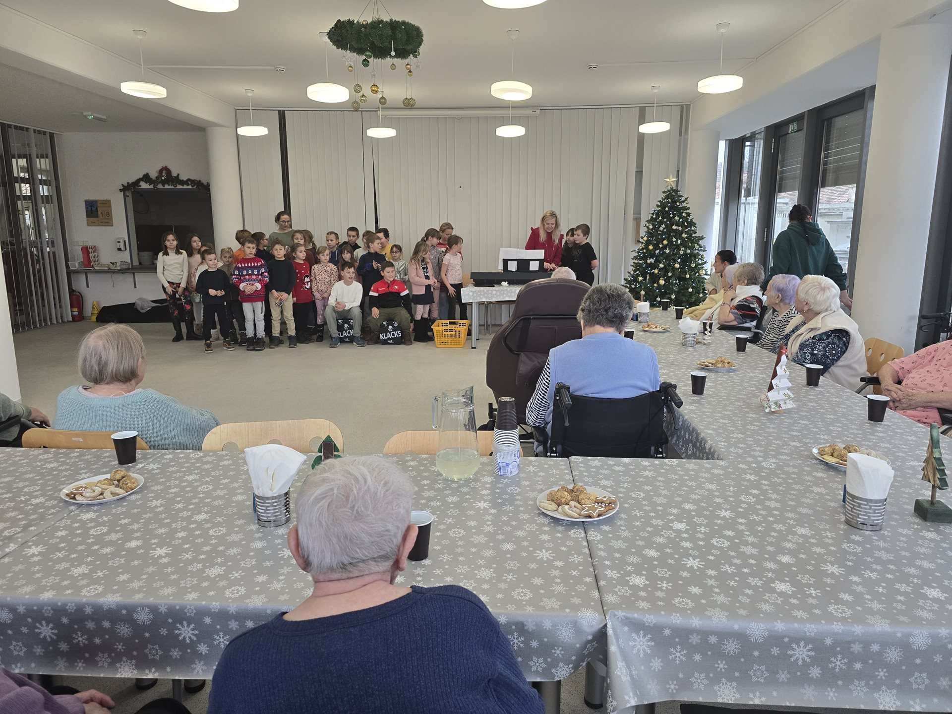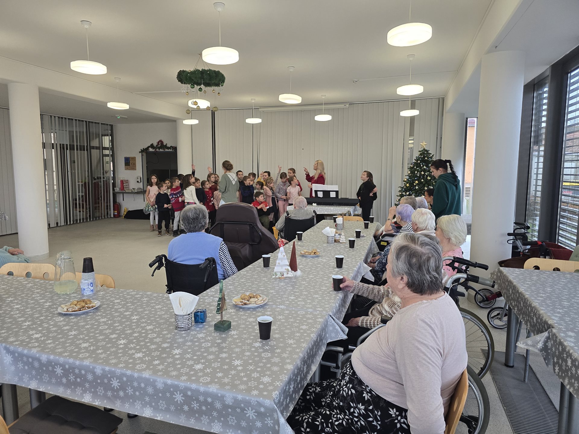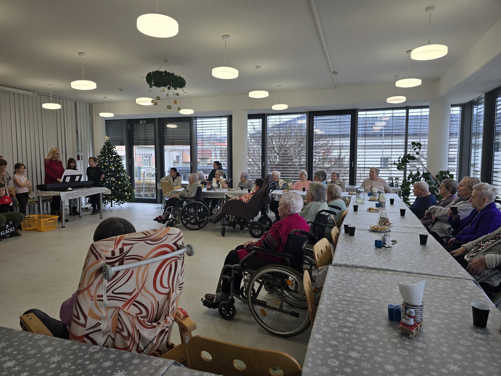 Středečním dopolednem se rozezněla po celém zařízení muzika a zpěv dětí. Není divu – navštívily nás totiž děti z místní základní školy. Společně se svými kantorkami si pro naše uživatele připravily besídku plnou vánočních básniček, písní a koled. Na konci besídky obdarovaly děti naše seniory ručně vytvořenými vánočními přáními. Od našich seniorů na oplátku dostaly našimi seniory vytvořené náramky, trpaslíčky, stromečky a hvězdičky.