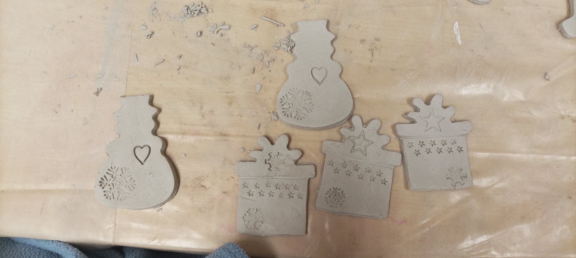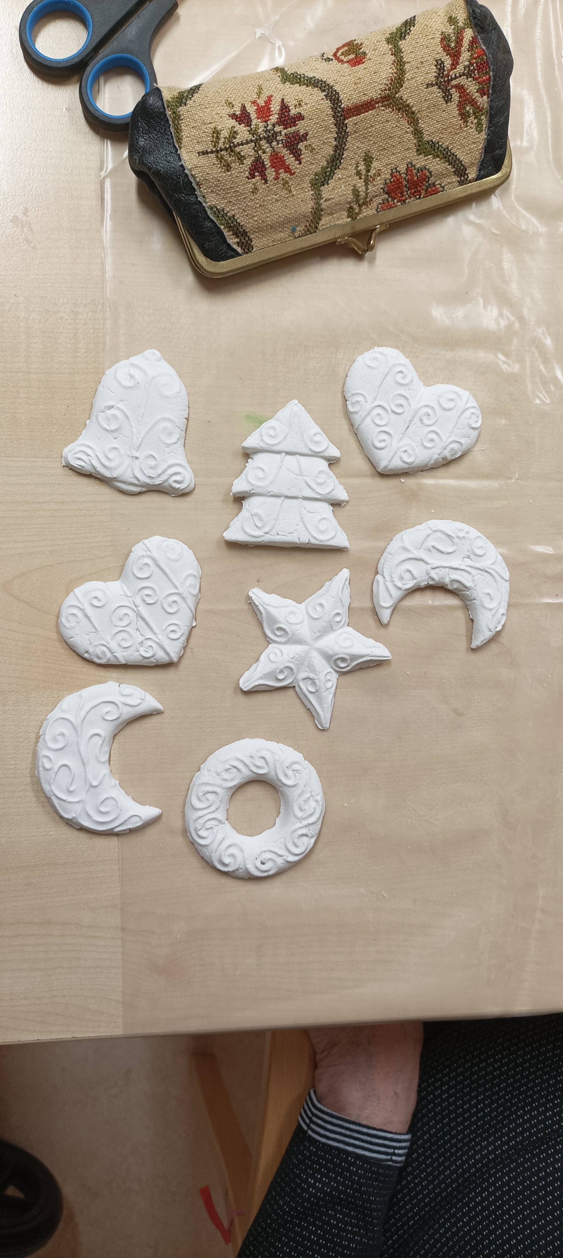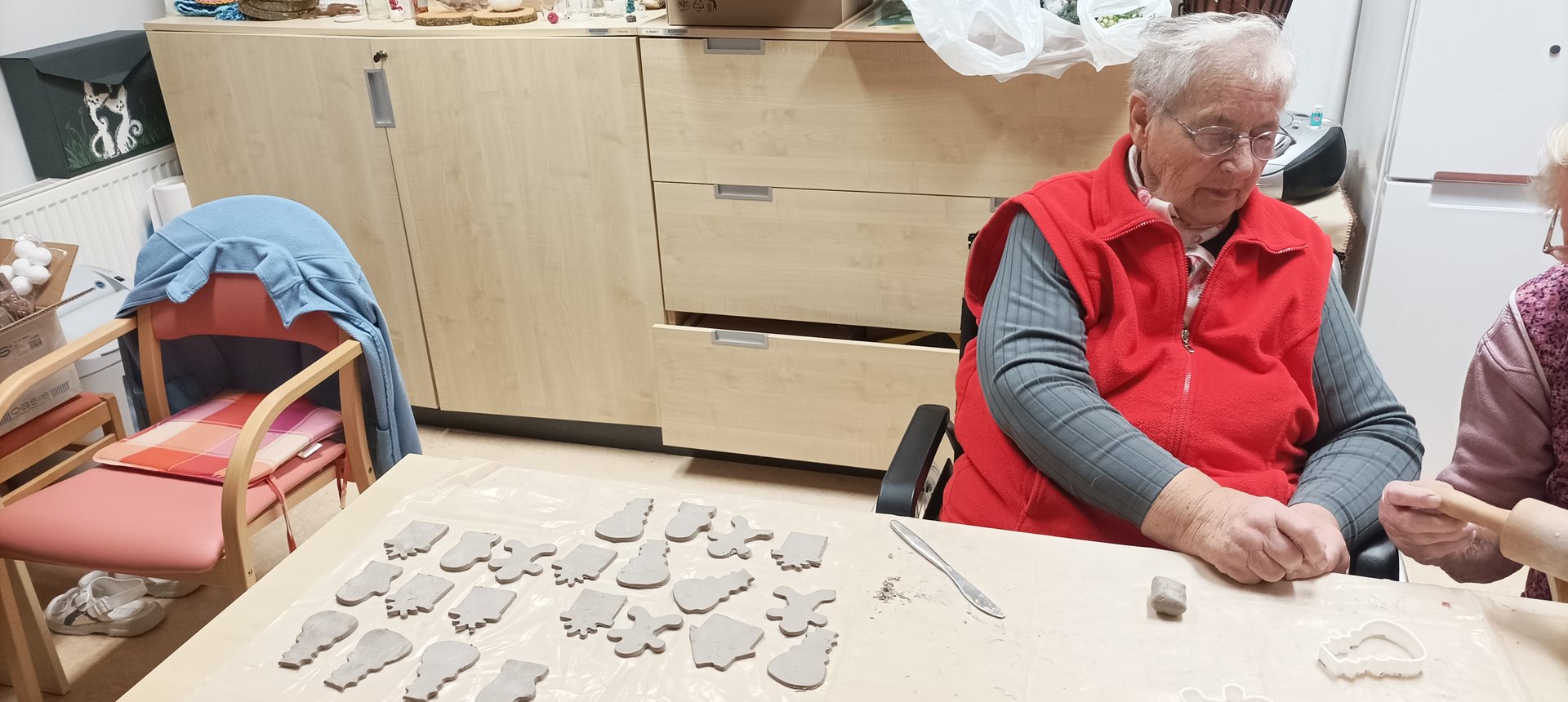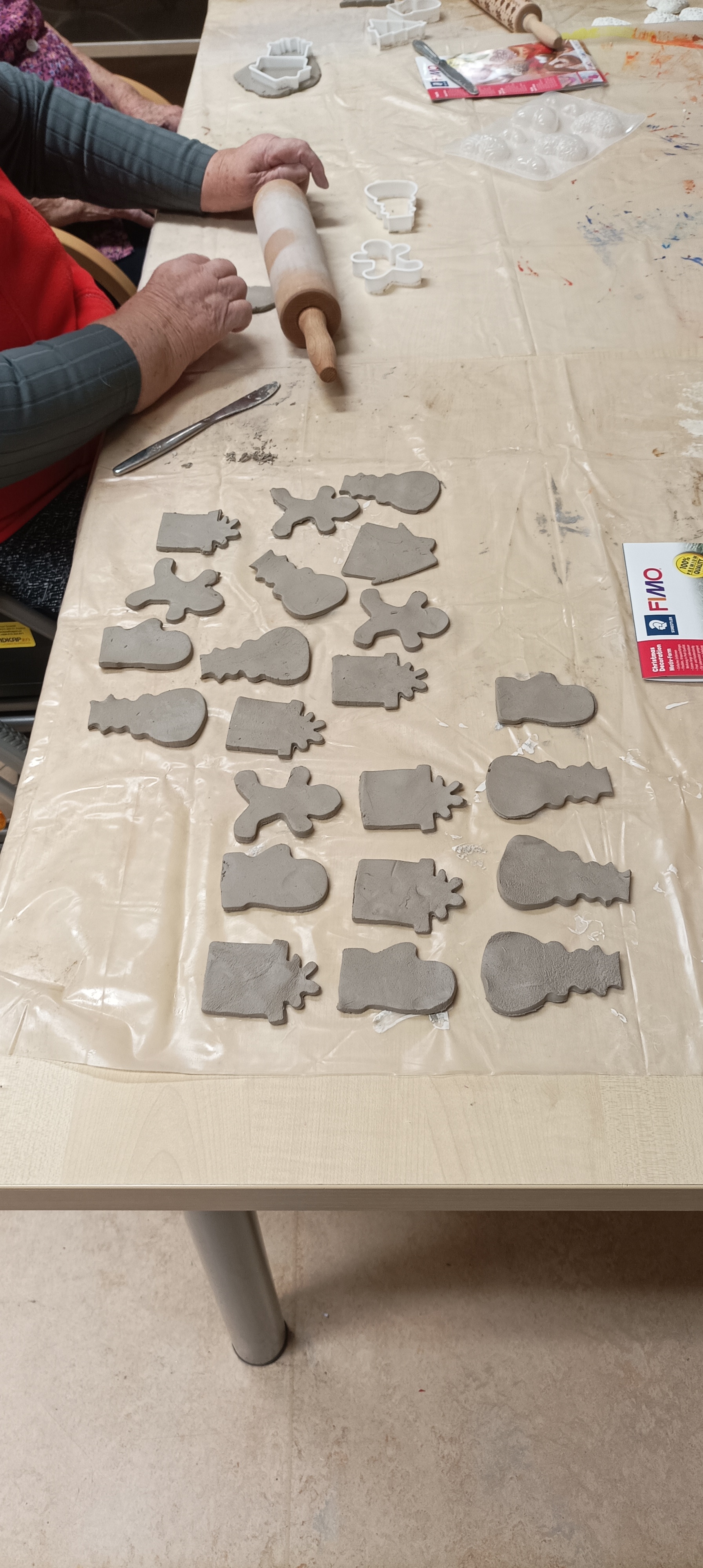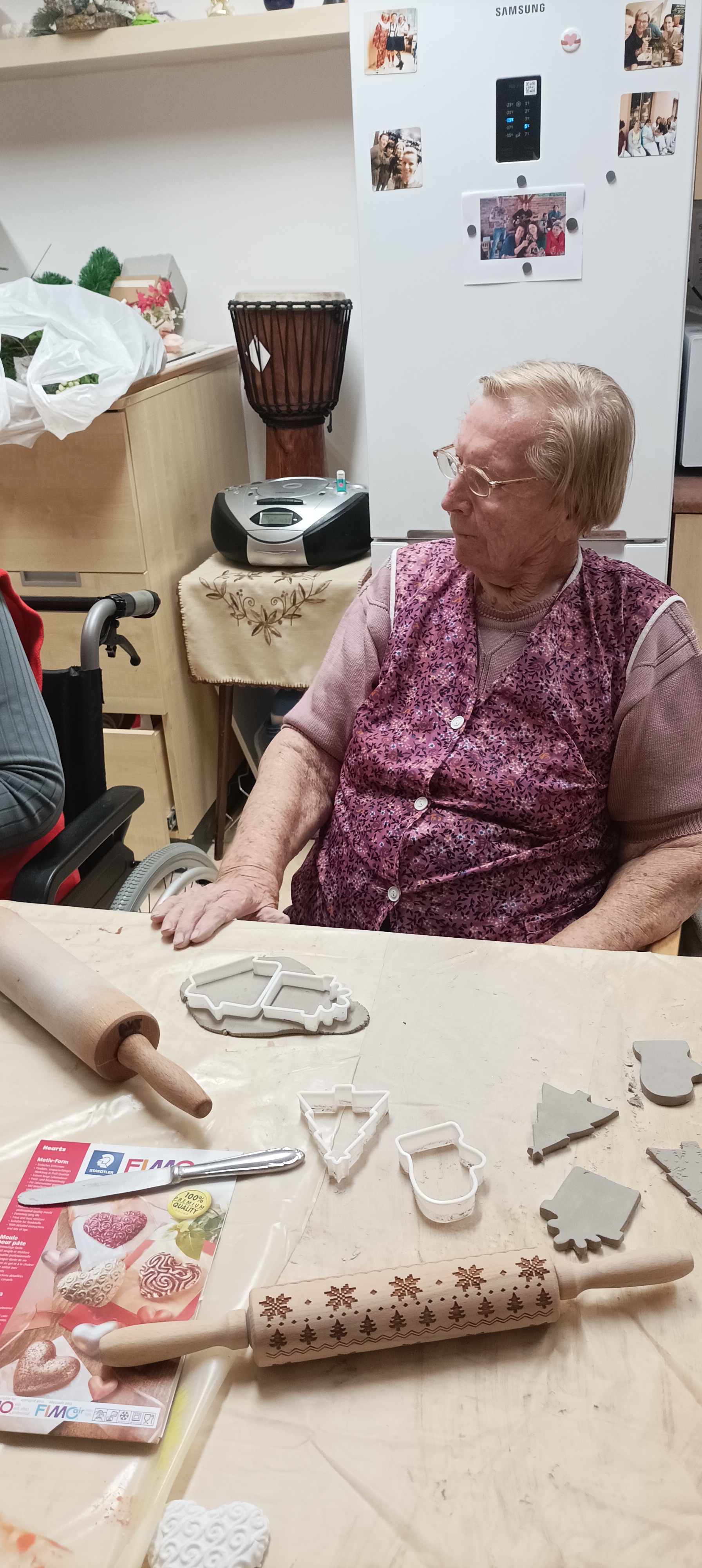 Středeční dopoledne jsme probudily své kreativní já a s uživatelkami jsme tvořily výrobky na vánoční jarmark. Bílou samotvrdnoucí hmotu uživatelky vmačkávaly do předem připravených silikonových forem a následně je vyklepávaly na stůl. Z keramické hlíny pak uživatelky vyválely placku, ze které pomocí vykrajovátek tvořily vánoční tvary (domečky, sněhuláky, dárky, rukavičky...). Poté, co byla všechna hmota spotřebována, mohly uživatelky dané výtvory ještě „dodekorovat“ různými tiskátky a raznicemi. Při poslechu hudby to byl příjemný závan Vánoc.