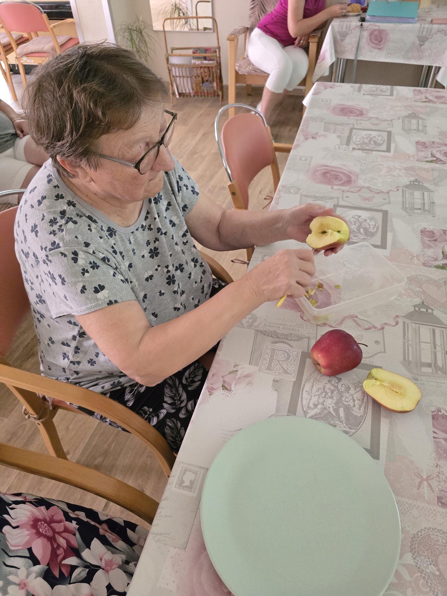 Jelikož se na pavilonu Z nahromadily jablka, tak jsme se rozhodly s uživatelkami, že si vytvoříme vlastní domácí jablečný kompot. Uživatelky pomáhaly personálu s přípravami – loupání jablek, vyjadřincování jablek i krájení jablek na menší kousky. U této aktivity panovala taktéž dobrá nálada – uživatelky si zazpívaly staré známé lidovky a zároveň proběhla debata, jaké moučníky uživatelky dělávaly doma a jaké moučníky měly nejradši. Po uvaření kompotu si všechny uživatelky mohly pochutnat na tomto sladkém jablečném moučníku.