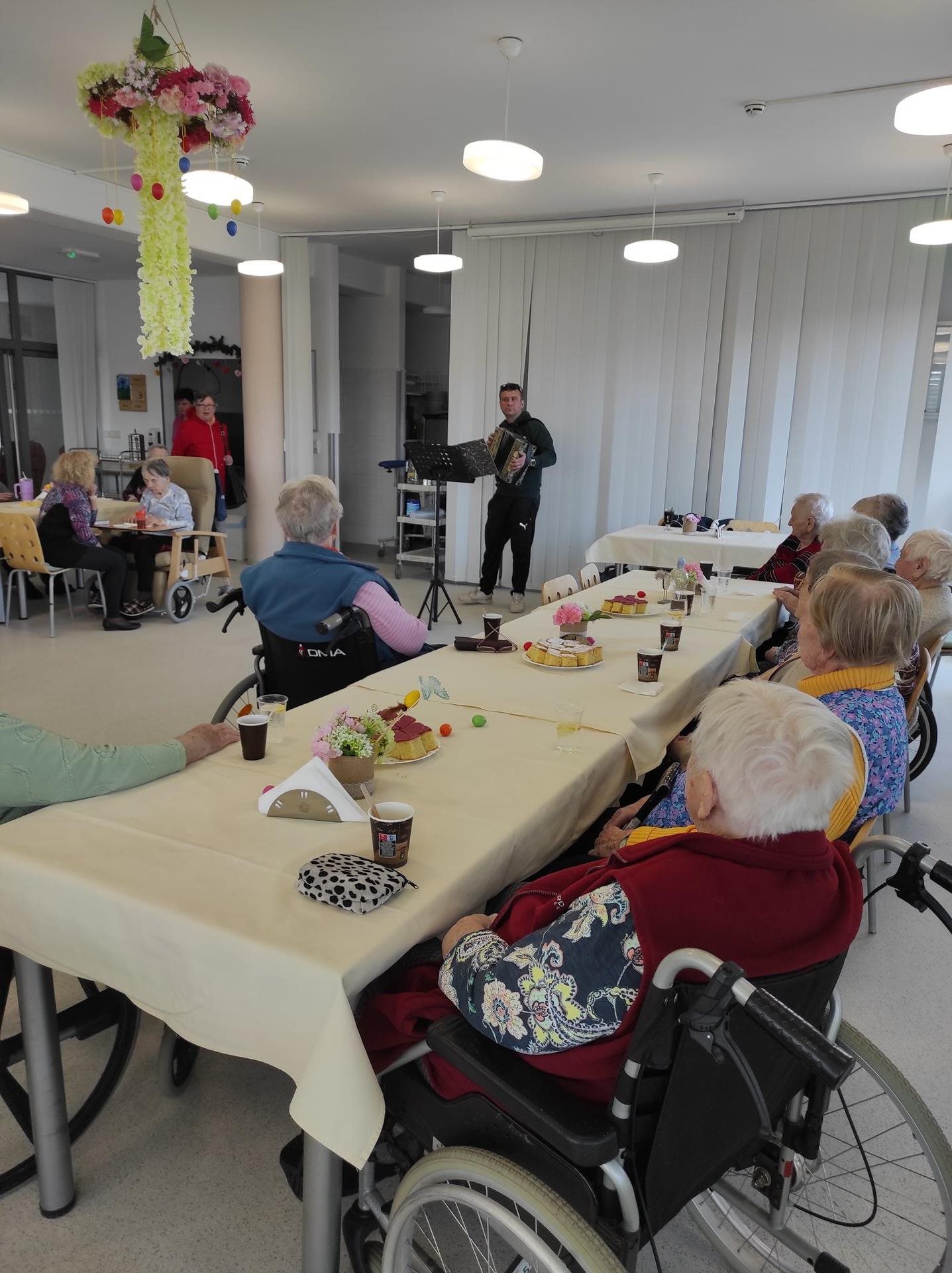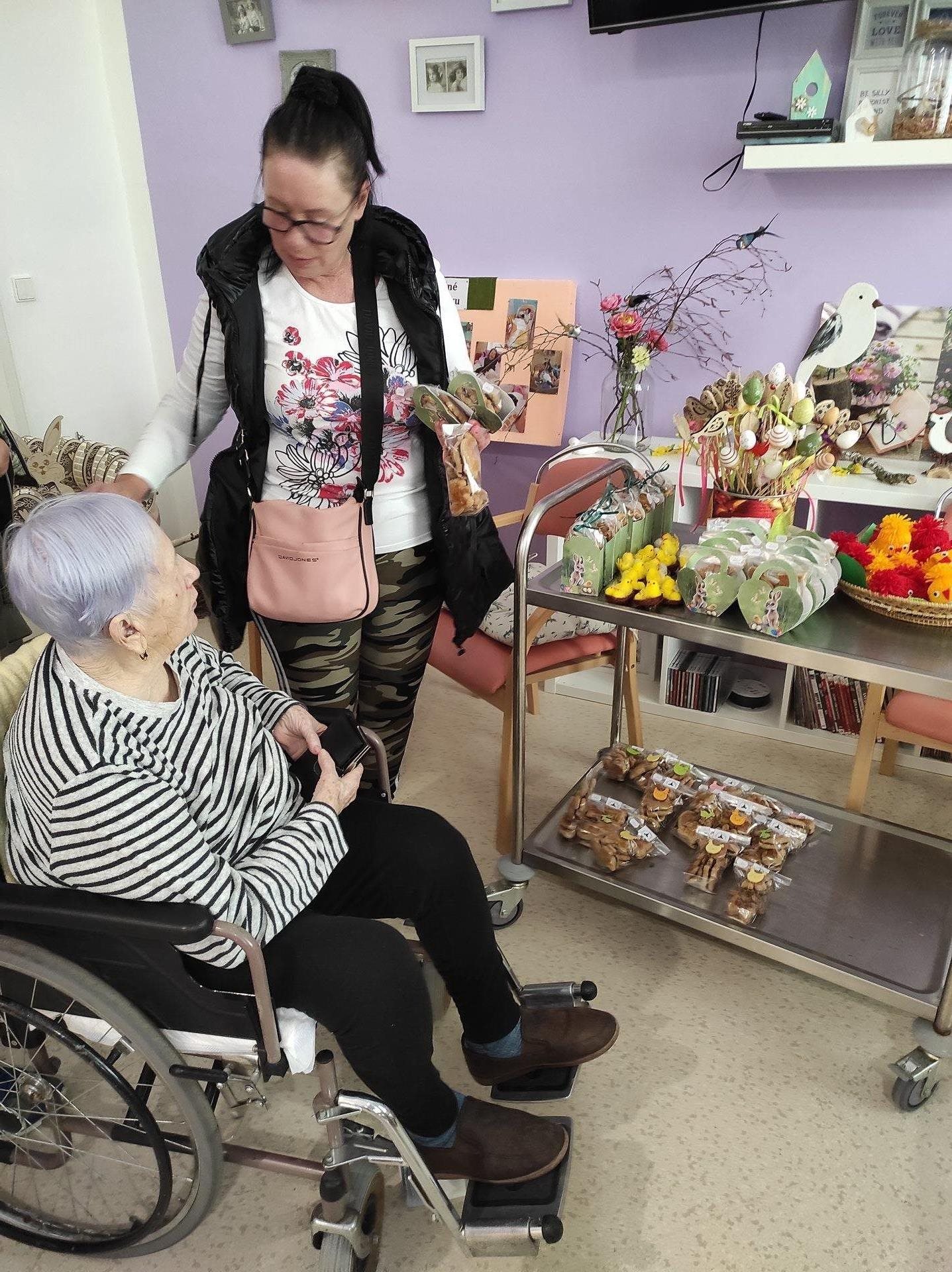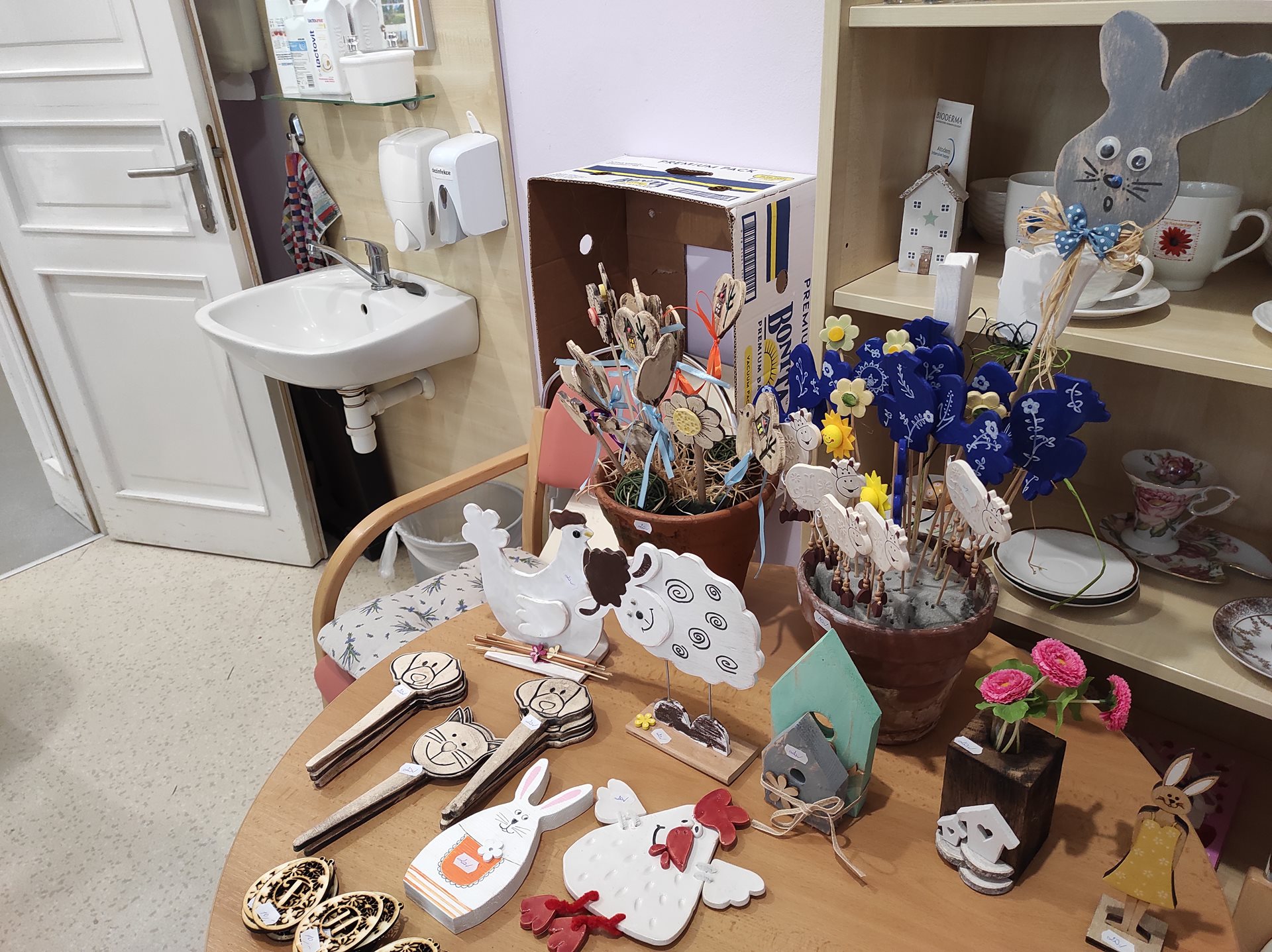 Středeční odpoledne se neslo v duchu přicházejících Velikonoc. Z velké jídelny na pavilonu B se ozýval zpěv doprovázený harmonikou, při kterém si uživatelky vychutnávaly kávu a dezert. V zámecké kavárně pak měli uživatelé a rodinní příslušníci možnost zakoupit sobě či svým blízkým velikonoční dekorace na stůl, závěsné věnce, zápichy do květináčů a v neposlední řadě také perníčky a sušené ovoce.