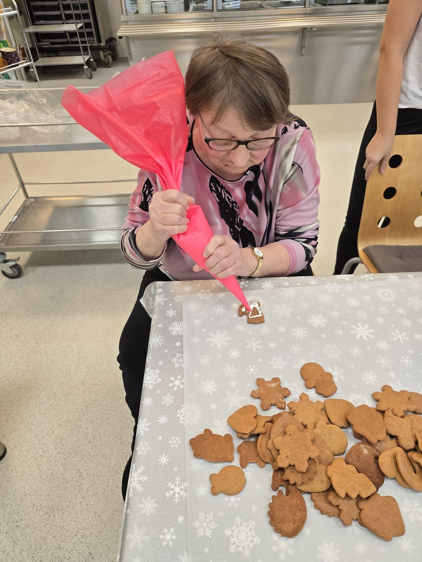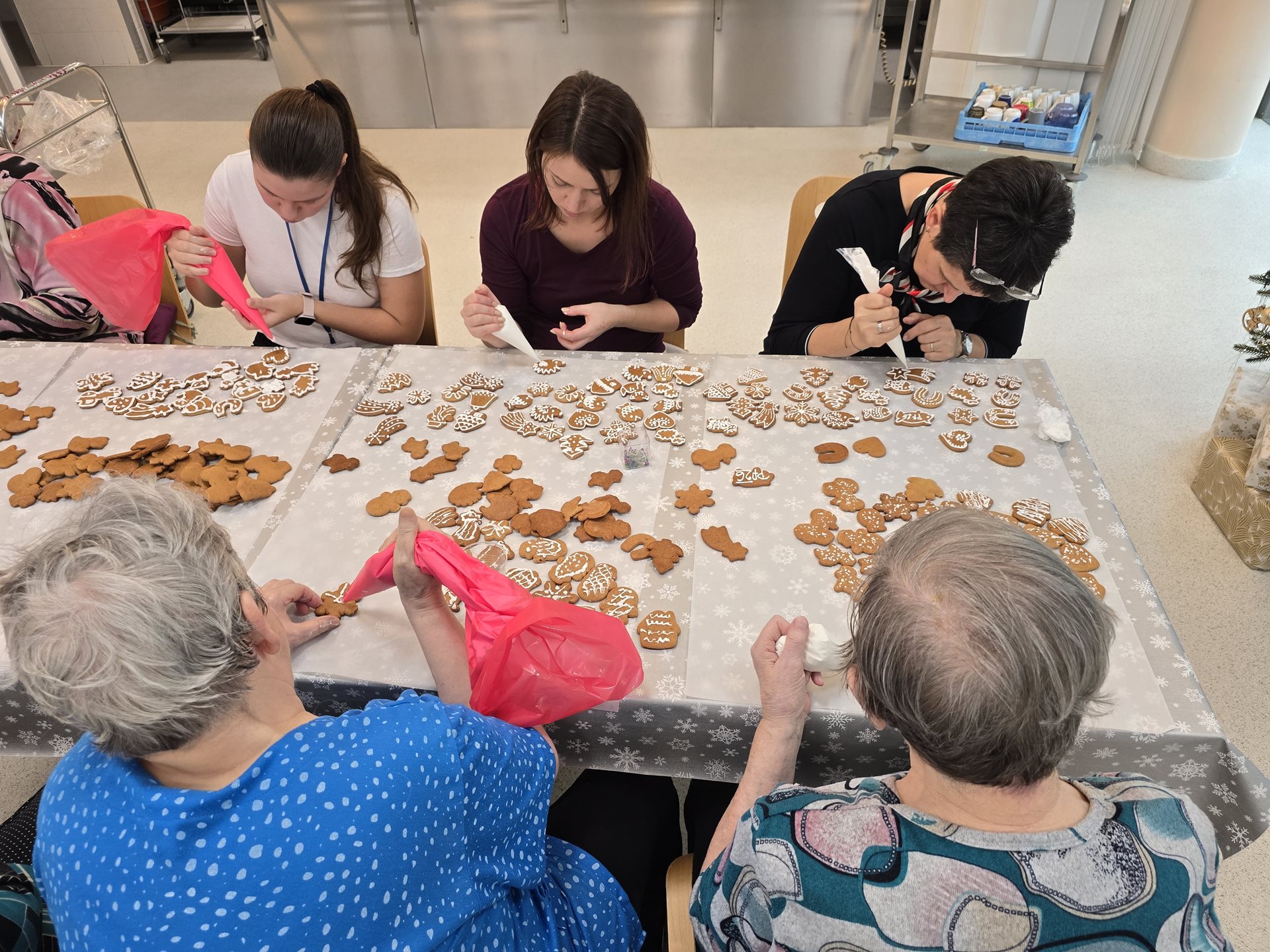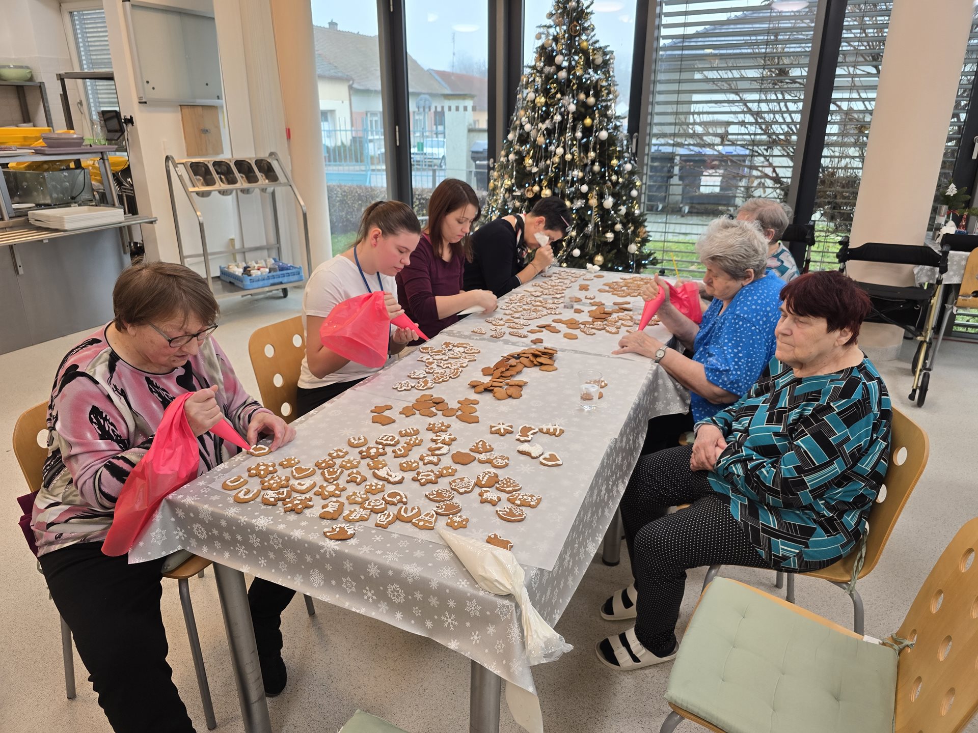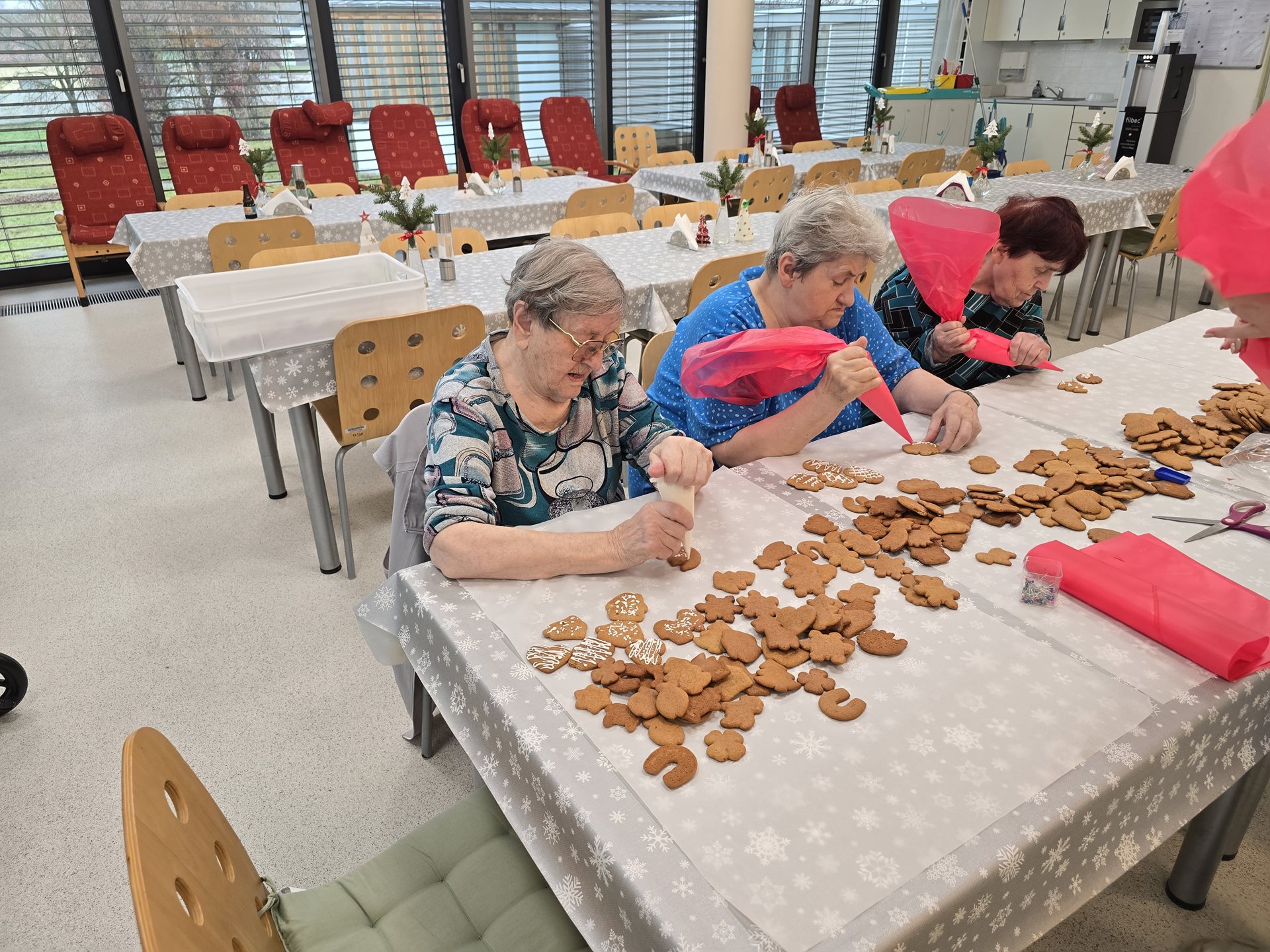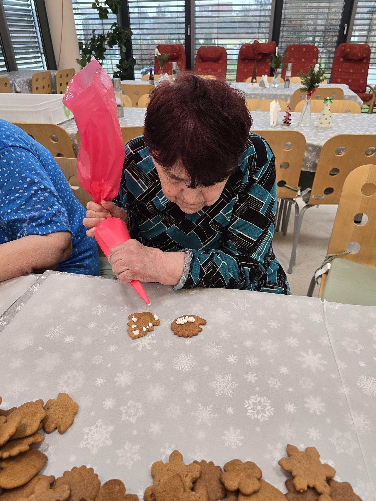 Středeční dopoledne vonělo perníkovým kořením. Za zvuku koled zdobil personál společně s uživatelkami perníčky bílkovou polevou. Tyto perníčky jsou určené k potěše uživatelů během vánočních svátků - ke kávě, svačině, apod. Za 2 hodiny jsme měly stůl plný zasněžených chaloupek, stromečků, zdobných zvonků, hvězd, komet, sladkých srdíček, vloček a "šťastných" podkov a prasátek přejících tzv. "Péefko" nebo-li Pour féliciter - tedy šťastný nový nadcházející rok :)