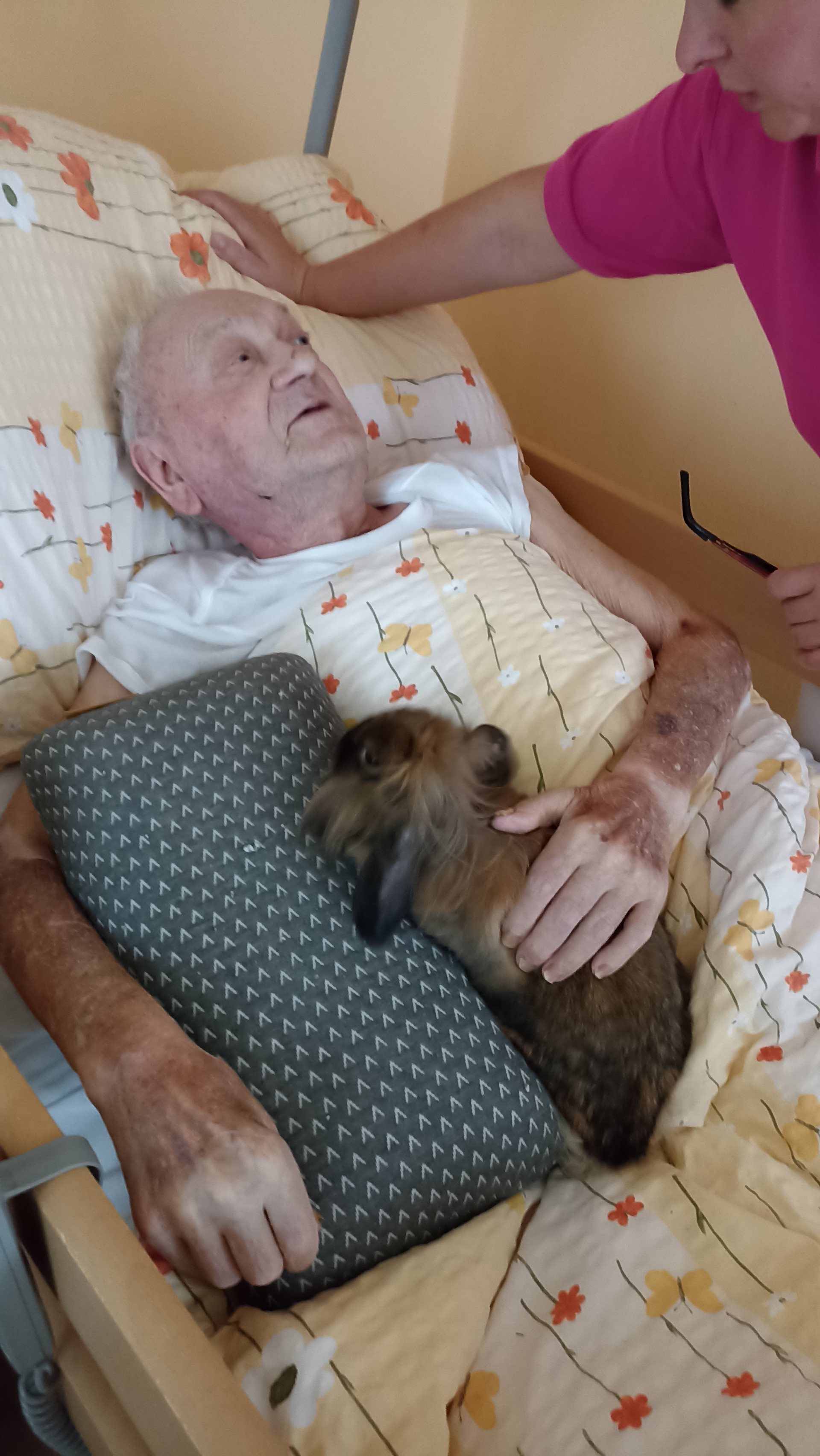 Zooterapie je nejen při individuálních terapiích velmi oblíbená u našich seniorů, a proto v odpoledních hodinách se králíčice Karlička, vypravila potěšit své uživatele. Vykouzlila jim úsměv na rtech a navodila jim spokojenou atmosféru.