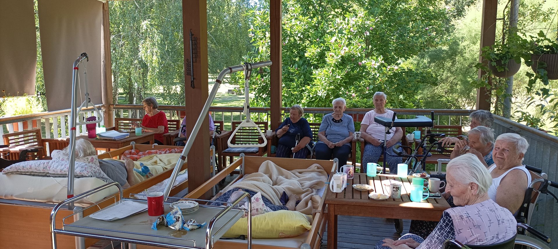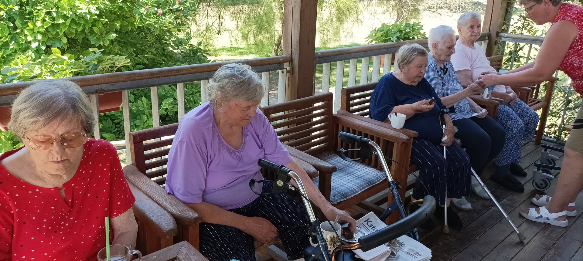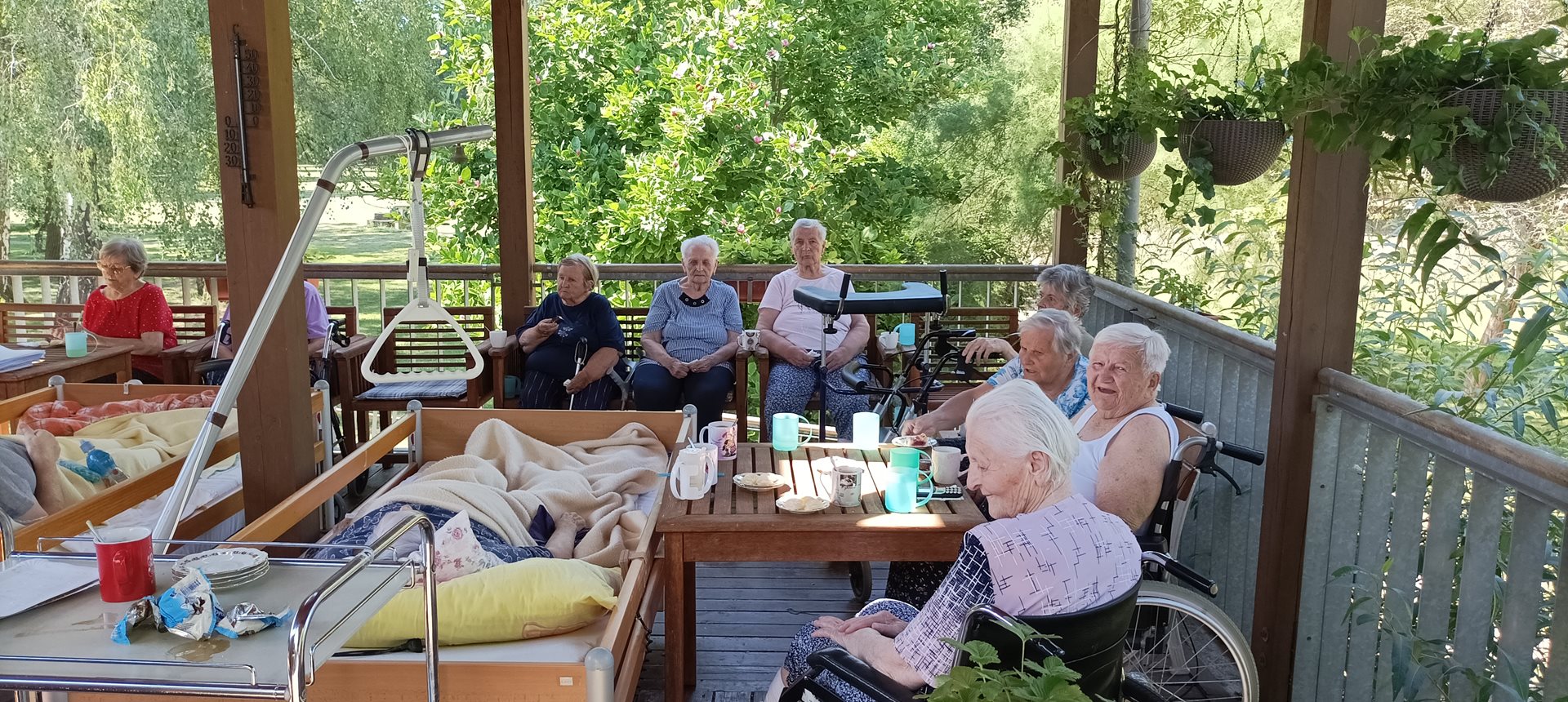 Již dříve jsme psali o tom, že když je počasí přívětivé, vozíme naše uživatele, kterým jejich zdravotní stav nedovoluje se volně pohybovat po pavilonu či trávit hodiny vsedě v křesle, ven před budovu či na altánek na lůžkách. Letní dny se nyní často předhánějí v tom, který z nich bude nejteplejší a úmornější, ale když se mírně ochladí, hned vyrážíme s uživateli na procházku či na altánek. Zde si pak mohou dát šálek dobré kávy/čaje, sníst si zde svou odpolední svačinku nebo je jim donesen nanuk k zakoupení. Dobré jídlo a pití vždy rozvíří dobrou náladu, a tak se uživatelé pod taktovkou pečovatelek často dávají do zpěvu. Za příjemného počasí tak můžete slyšet zpěv lidových písní našich uživatelek na altánku, který se nese do všech koutů parku.