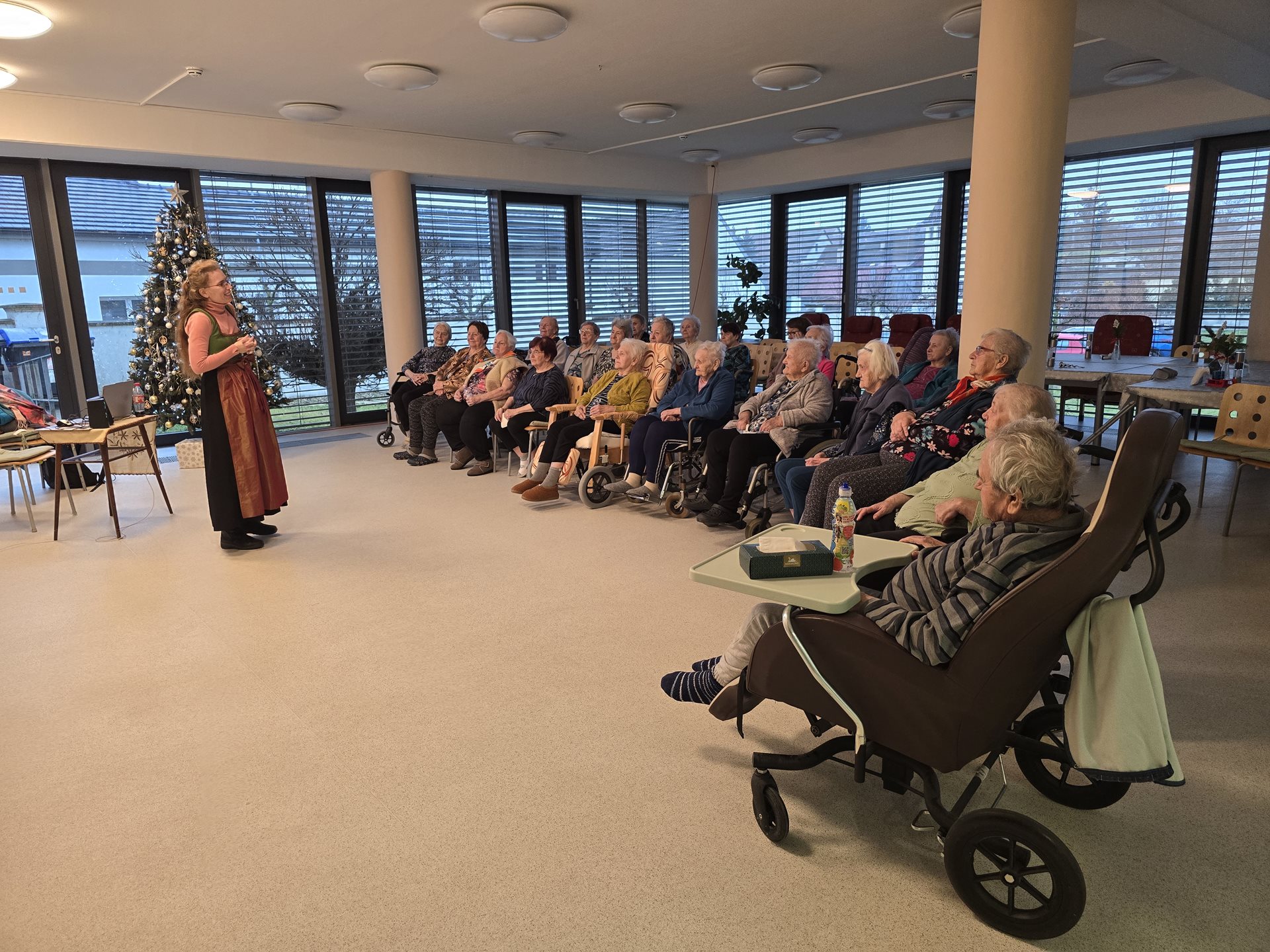 Rádi bychom se s vámi podělili o příjemnou událost, která se uskutečnila v našem domově pro seniory nyní před Vánoci. Ve společné jídelně proběhla tematická přednáška věnovaná vánočním koledám – jejich vzniku, historickému vývoji i podobě, v jaké je známe dnes. Program byl doplněn o poslech známých i méně známých koled, které navodily klidnou a sváteční atmosféru. Přednáška se setkala s velmi pozitivním ohlasem a těšila se velké účasti našich uživatelek. Setkání probíhalo v přátelském duchu a přineslo nejen nové informace, ale především radost ze společně stráveného času. Děkujeme paní Šimkové za skvělou besedu i všem účastníkům za milou atmosféru. Věříme, že podobná setkání budeme moci v budoucnu opět zopakovat.