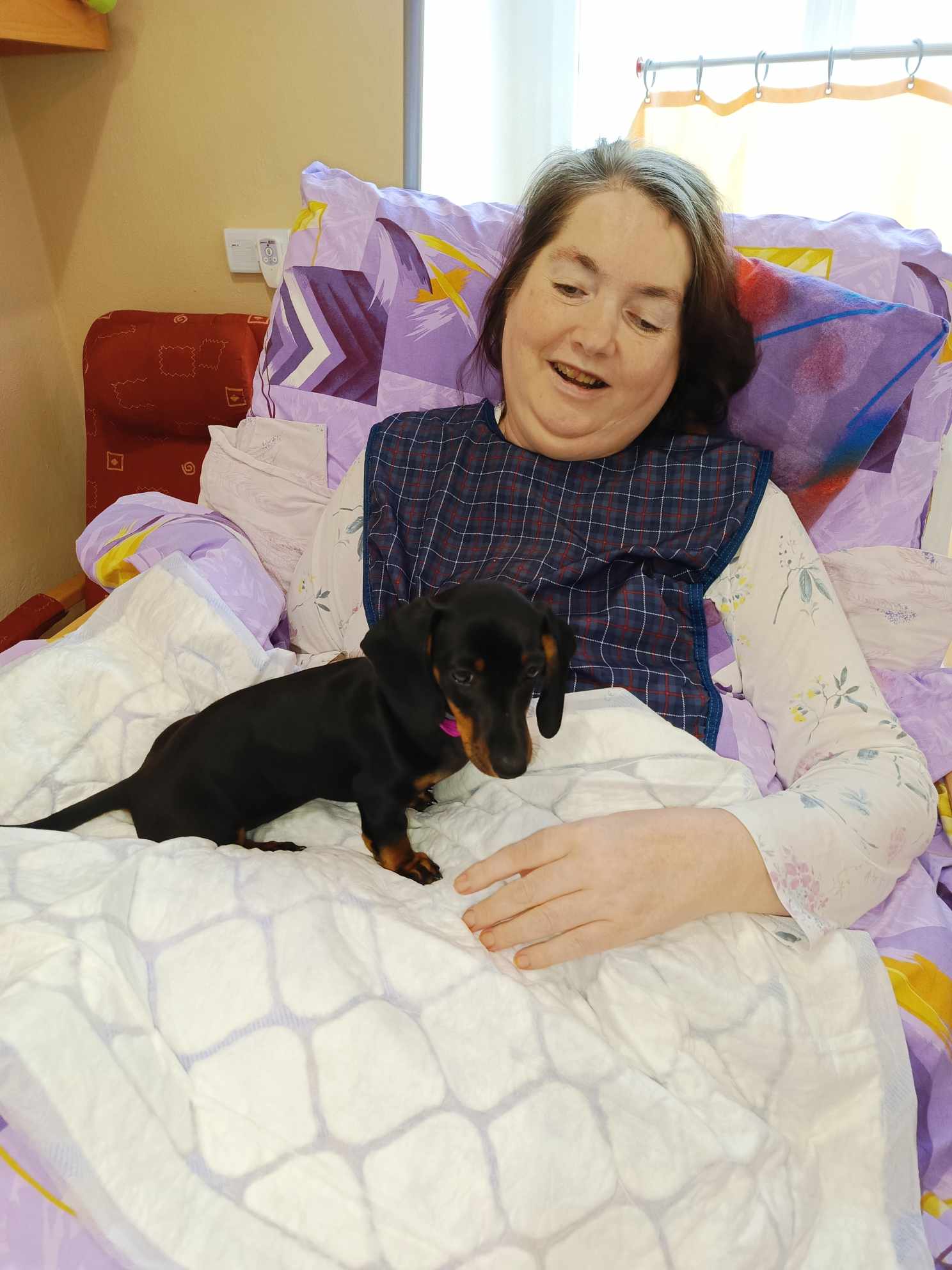 Úterní odpoledne nás svojí návštěvou poctila naše zaměstnankyně spolu se svým pejskem - fenkou Ladynkou. Všem uživatelkám se takto strávené odpoledne moc líbilo, jelikož všechny naše uživatelky mají moc rády zvířata, hlavně tedy pejsky. Ladynka, která je ještě štěnátko, byla taktéž velmi spokojená s návštěvou, jelikož to vypadlo, že se jí u našich uživatelek moc líbí - hlavně tedy na lůžku - v teple.