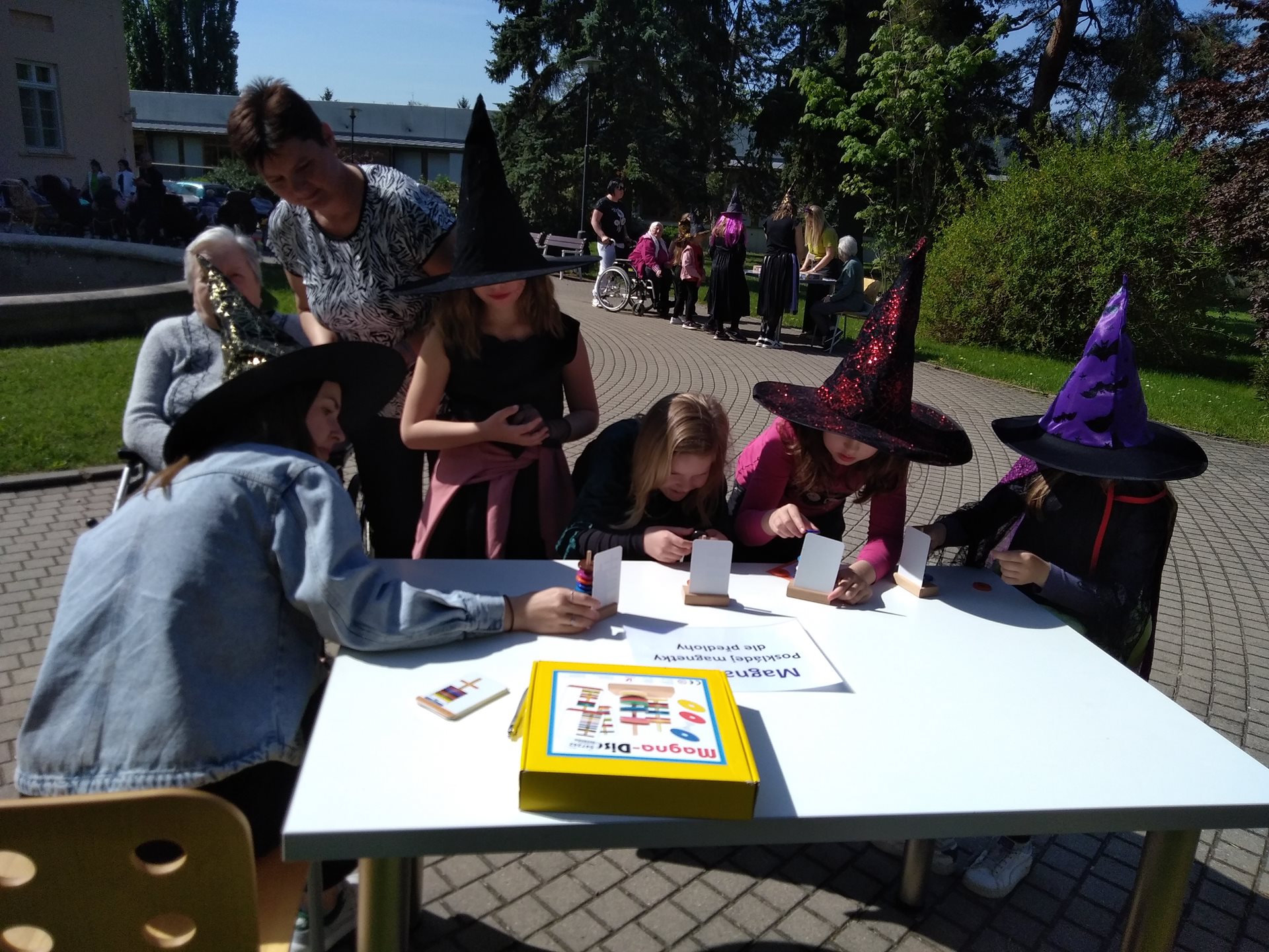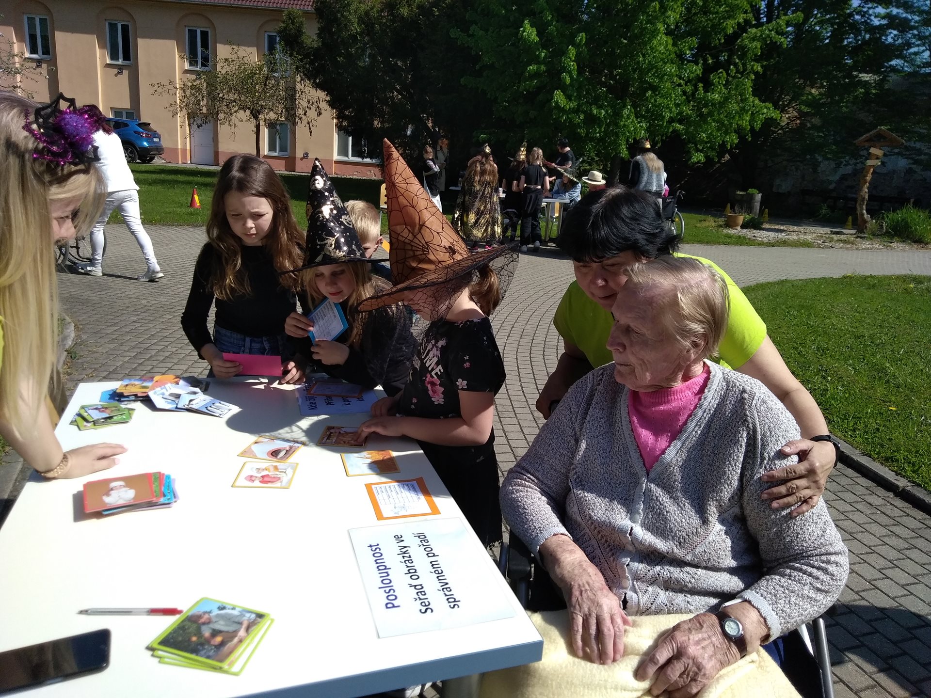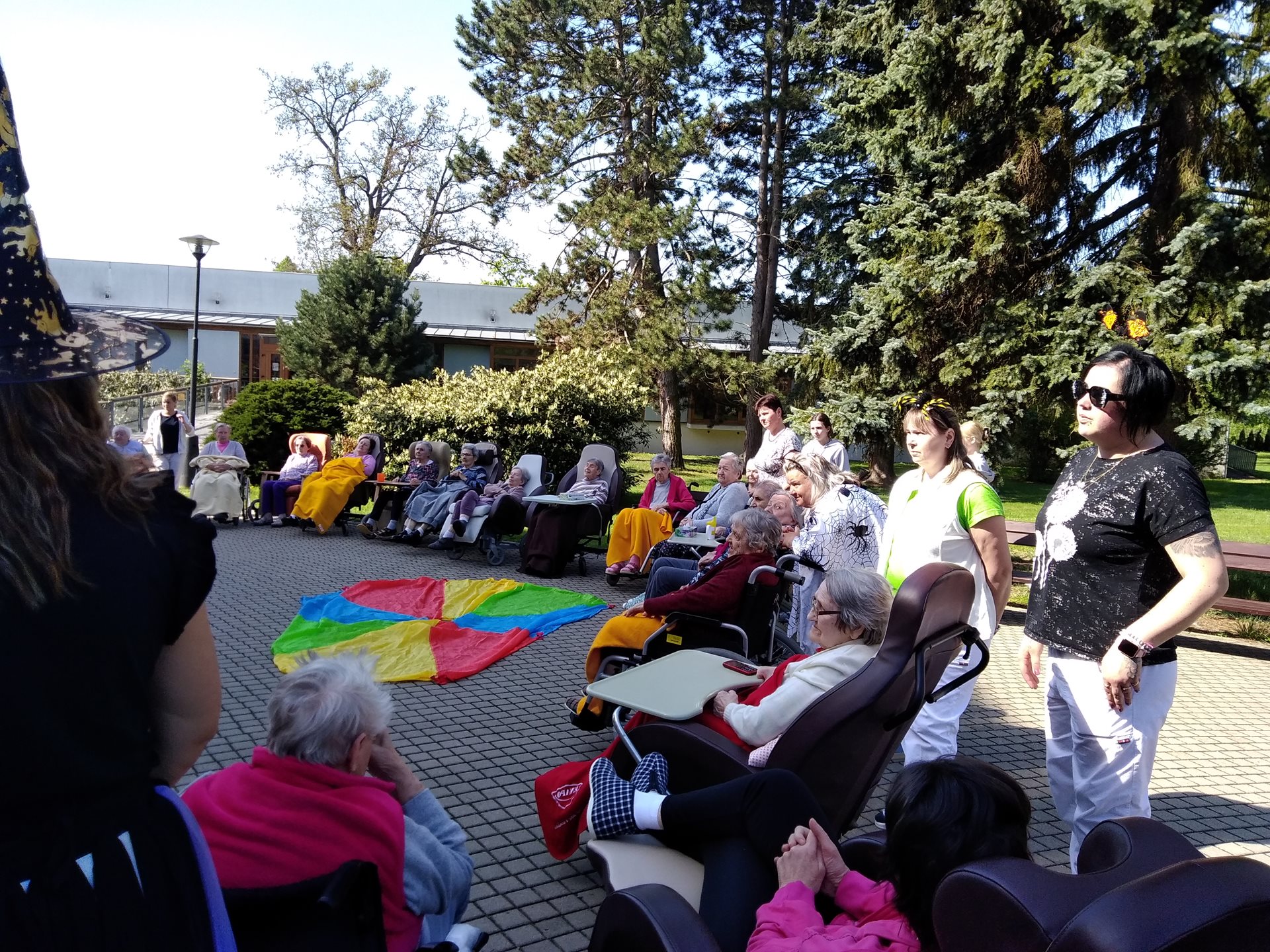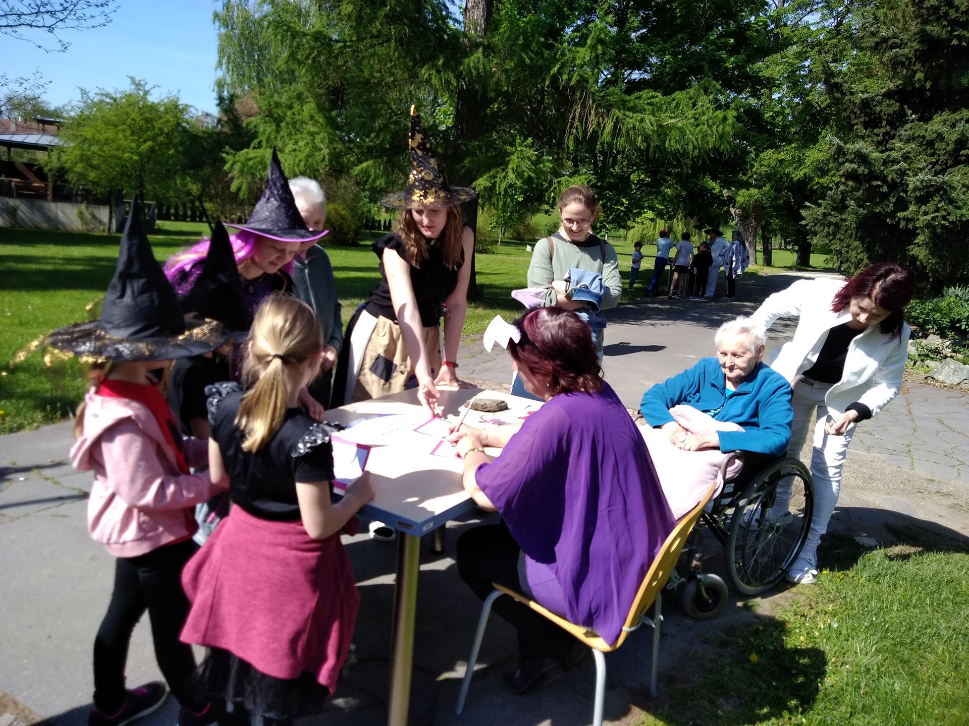 Konec dubna se blíží a květen nám klepe na dveře. A to bychom nebyli my, kdyby se u nás v zařízení nekonal Čarodějnický rej s dětmi z místní základní školy. Počasí nám letos vskutku královsky přálo, a tak jsme se za svitu sluníčka setkali u kašny před domovem, kde jsme se rozřadili do 5-ti členných družstev, z nichž 4 byly děti a 1 seniorka. Každý tým se společně musel prosoutěžit 8 disciplínami, které potrápili nejen ruce a nohy, ale také paměť, soustředění a koordinaci oko - ruka. Během plnění disciplín hrála veselá hudba, špekáčky voněly z grilu a sem tam se ozývaly veselé výkřiky dětí či uznalé tleskání uživatelek a personálu. Každý z týmu si pochutnal na špekáčku a za splněné úkoly dostal sladkou odměnu. Bylo to příjemně strávené dopoledne plné smíchu a radosti.