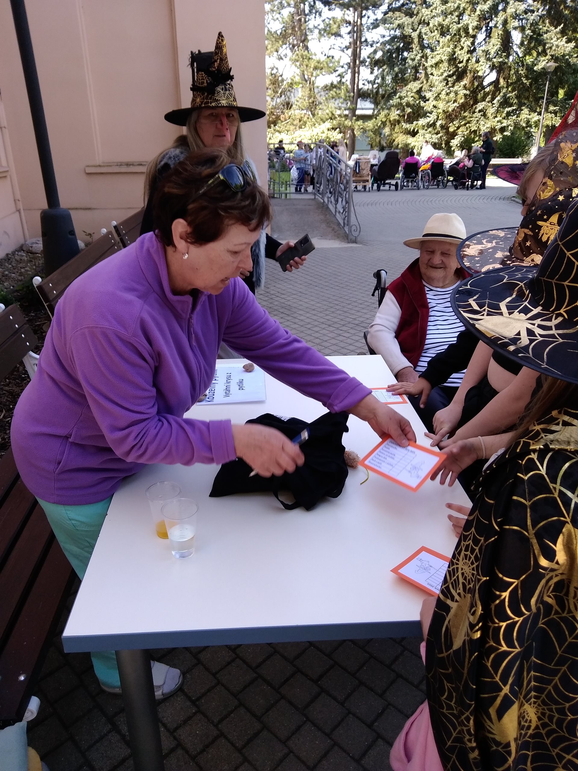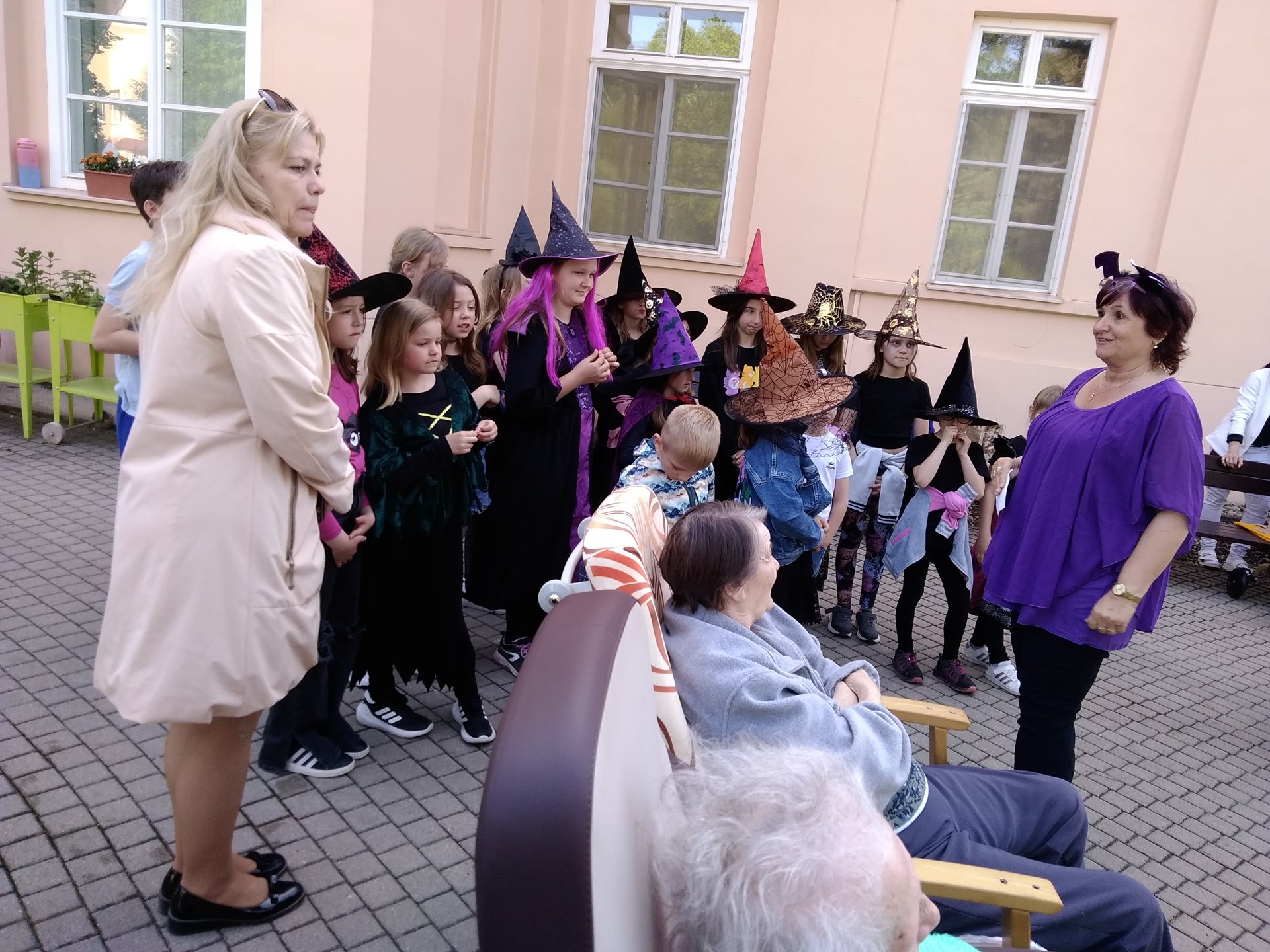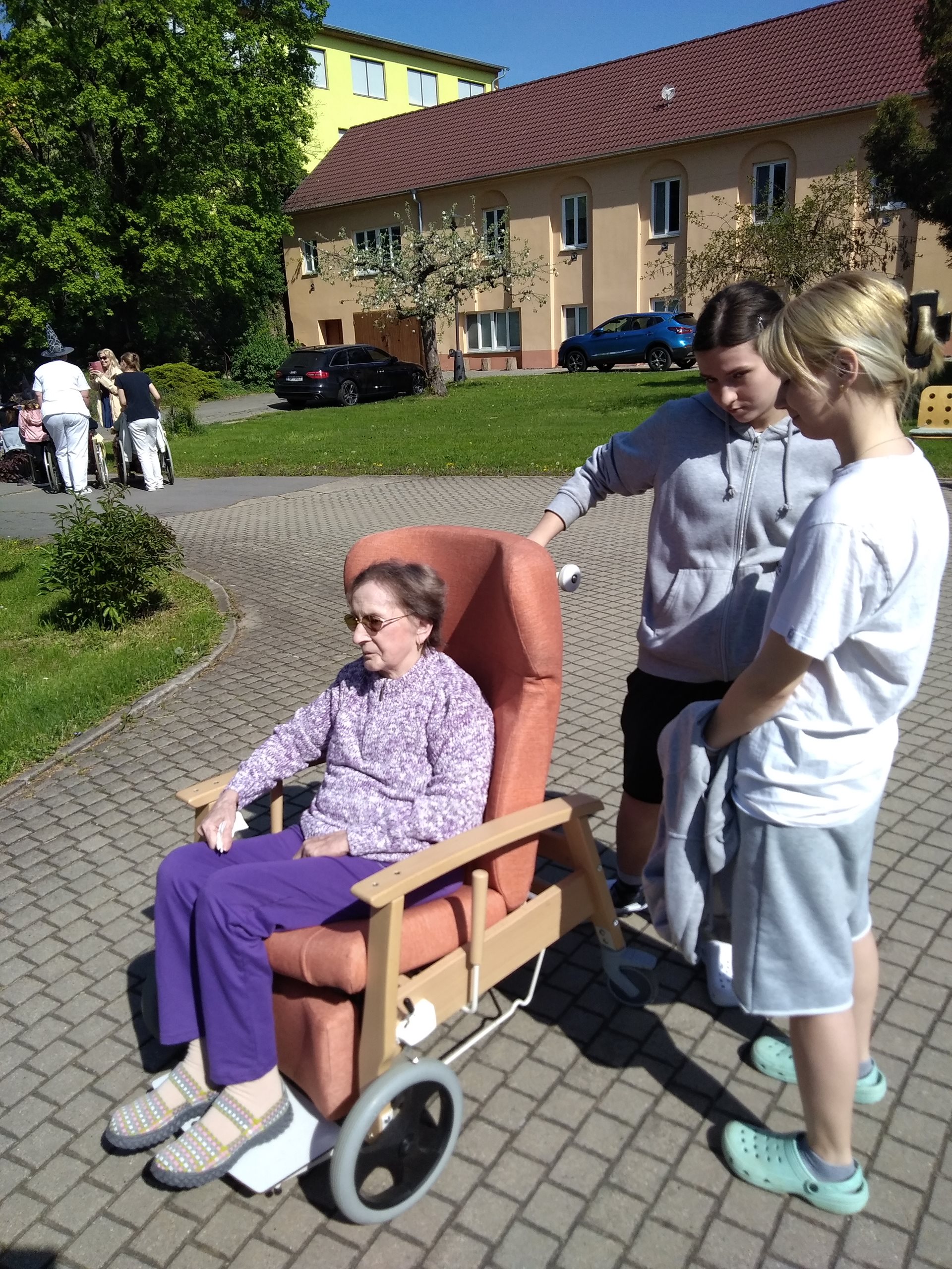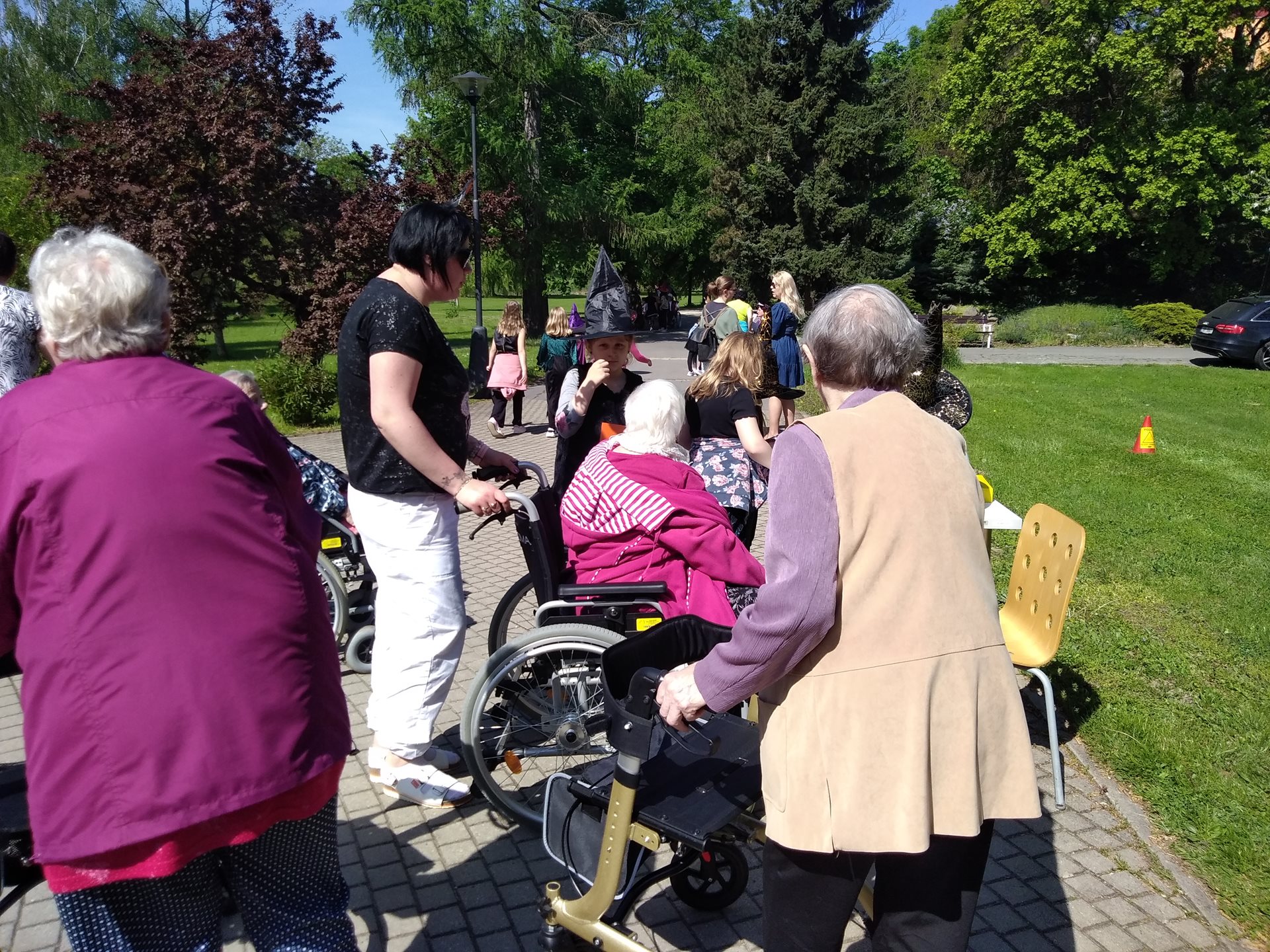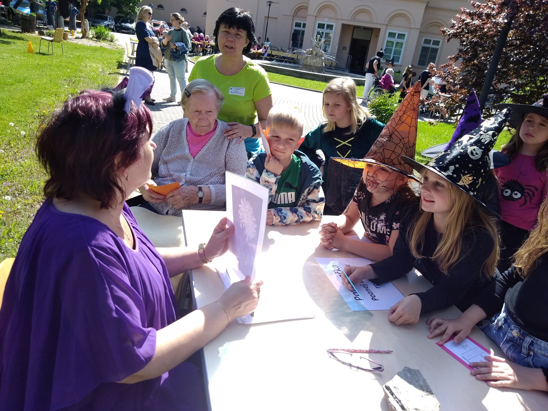 Konec dubna se blíží a květen nám klepe na dveře. A to bychom nebyli my, kdyby se u nás v zařízení nekonal Čarodějnický rej s dětmi z místní základní školy. Počasí nám letos vskutku královsky přálo, a tak jsme se za svitu sluníčka setkali u kašny před domovem, kde jsme se rozřadili do 5-ti členných družstev, z nichž 4 byly děti a 1 seniorka. Každý tým se společně musel prosoutěžit 8 disciplínami, které potrápili nejen ruce a nohy, ale také paměť, soustředění a koordinaci oko - ruka. Během plnění disciplín hrála veselá hudba, špekáčky voněly z grilu a sem tam se ozývaly veselé výkřiky dětí či uznalé tleskání uživatelek a personálu. Každý z týmu si pochutnal na špekáčku a za splněné úkoly dostal sladkou odměnu. Bylo to příjemně strávené dopoledne plné smíchu a radosti.