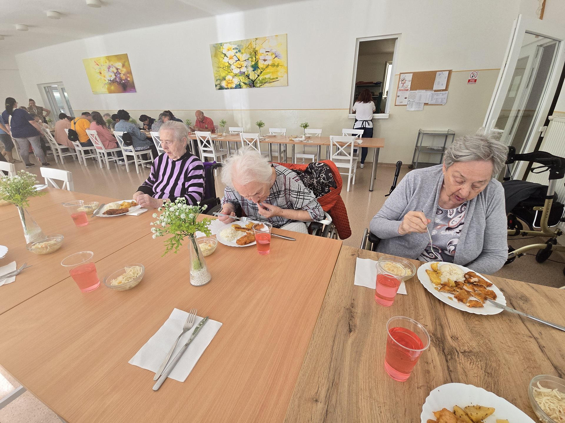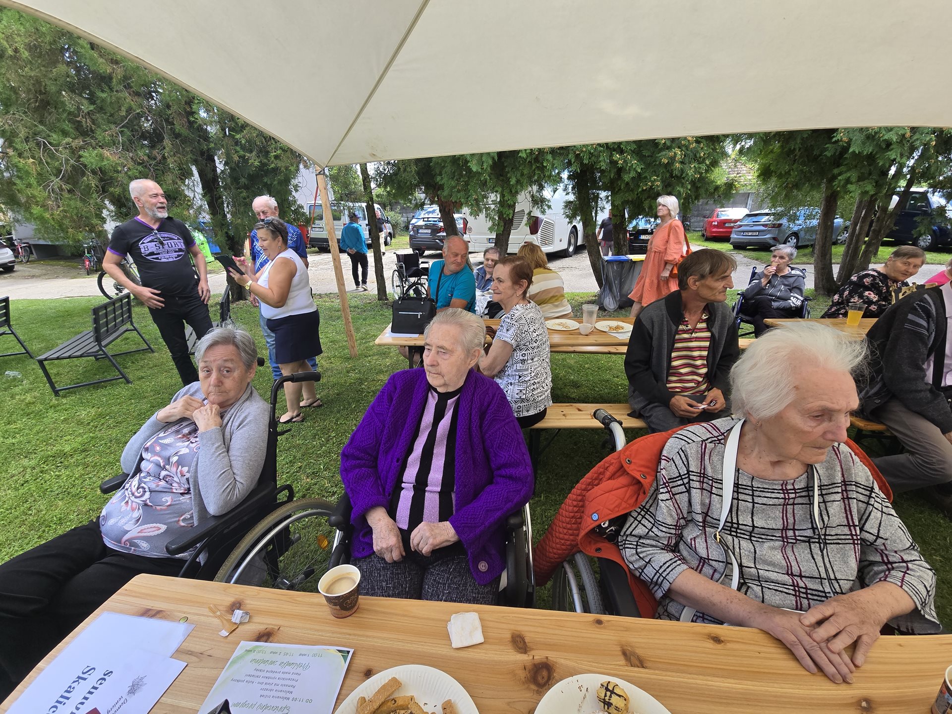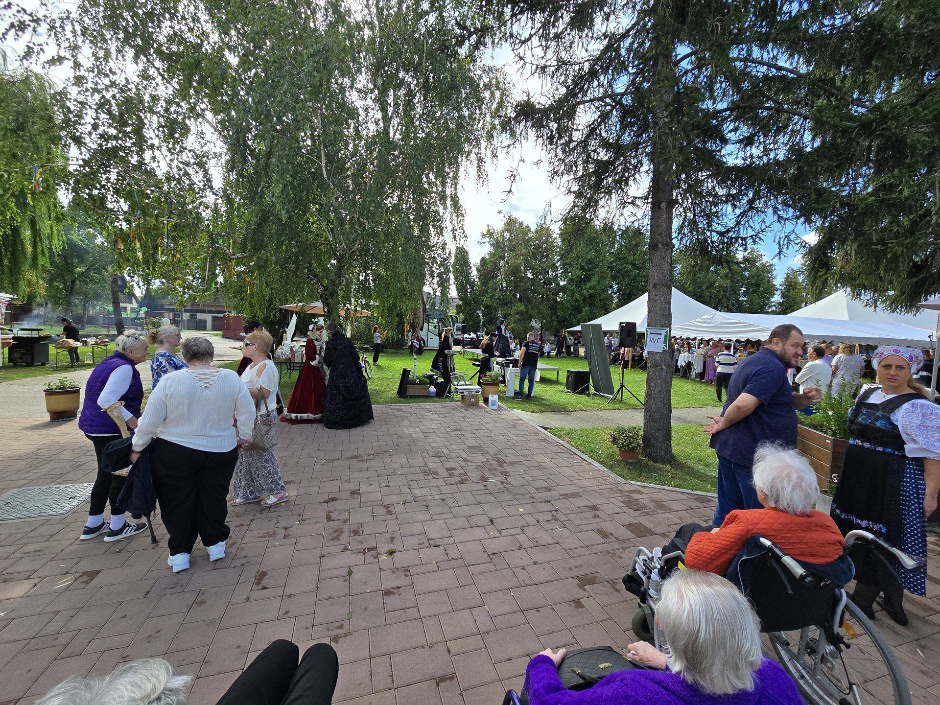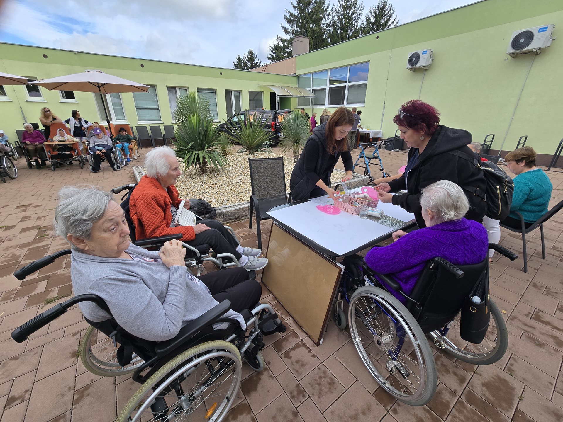 Dne 11.9.2025 se tři naše uživatelky společně s aktivizačními pracovnicemi zúčastnily výjimečné akce, a to dne otevřených dveří ve spřáteleném domově v Seredi na Slovensku. Naše zařízení zde mělo svůj stánek, kde byly vystaveny vlastnoručně vyrobené výrobky a také náš místní kroj, jenž přilákal pozornost mnoha návštěvníků. Atmosféra byla velmi srdečná a přátelská. Hosté měli možnost ochutnat připravené cukroví a osvěžit se limonádou. Naše uživatelky společně s aktivizačními pracovnicemi vytvářely obraz s motivem anděla, který symbolizuje bezpečí a jistotu – hodnoty, které jsou pro naše zařízení velmi důležité. Po chutném obědě, jenž se skládal z řízku s přílohou a zelným salátem, následovalo malé sladké potěšení v podobě zmrzliny a kávy. Odpolední program obohatilo vystoupení známé zpěvačky Gizky Oňové, které přineslo mnoho radosti, potěšení a úsměvů. Na závěr dne byly slavnostně předány obrazy ředitelům jednotlivých zařízení. Celá akce proběhla ve velmi příjemné atmosféře a naše uživatelky si odnesly nejen krásné zážitky, ale také nová přátelství. I když cesta trvala přibližně tři hodiny tam i zpět, tak stála za to.