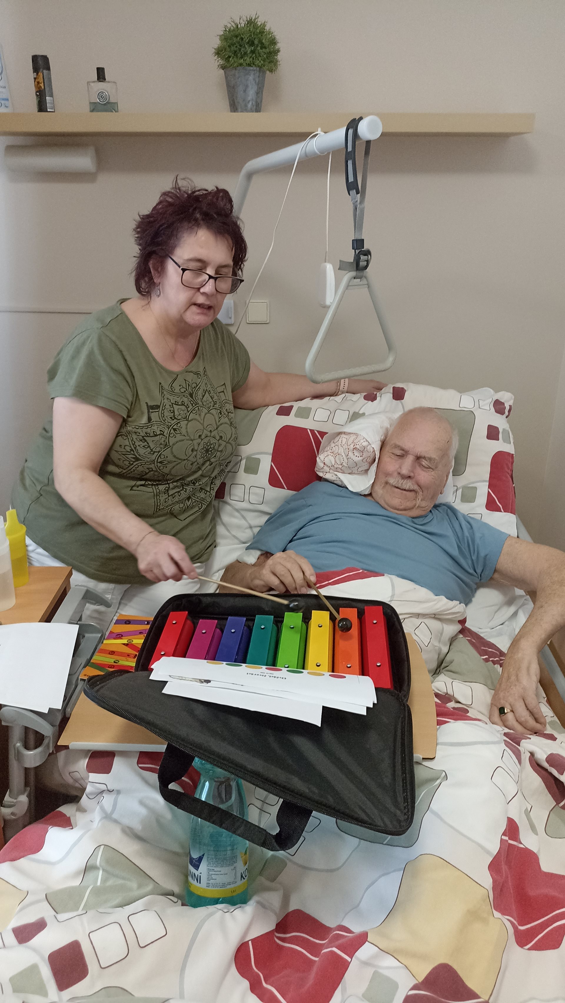 Víte, co jsou to boomwhackers? Tyto plastové barevné trubky patří mezi perkusní nástroje. Každá z nich je laděná na jiný tón a díky své jednoduchosti jsou vhodné i pro úplně hudební začátečníky. A tak v rámci individuální terapie – muzikoterapie, si uživatelé můžou vyzkoušet zahrát na tento hudební nástroj s pomocí not, které jsou barevně odlišeny dle barvy válců. K tomu si společně i zazpíváme. A kdo nechce hrát tak se potěší s reborn panenkou nebo králíčkem.