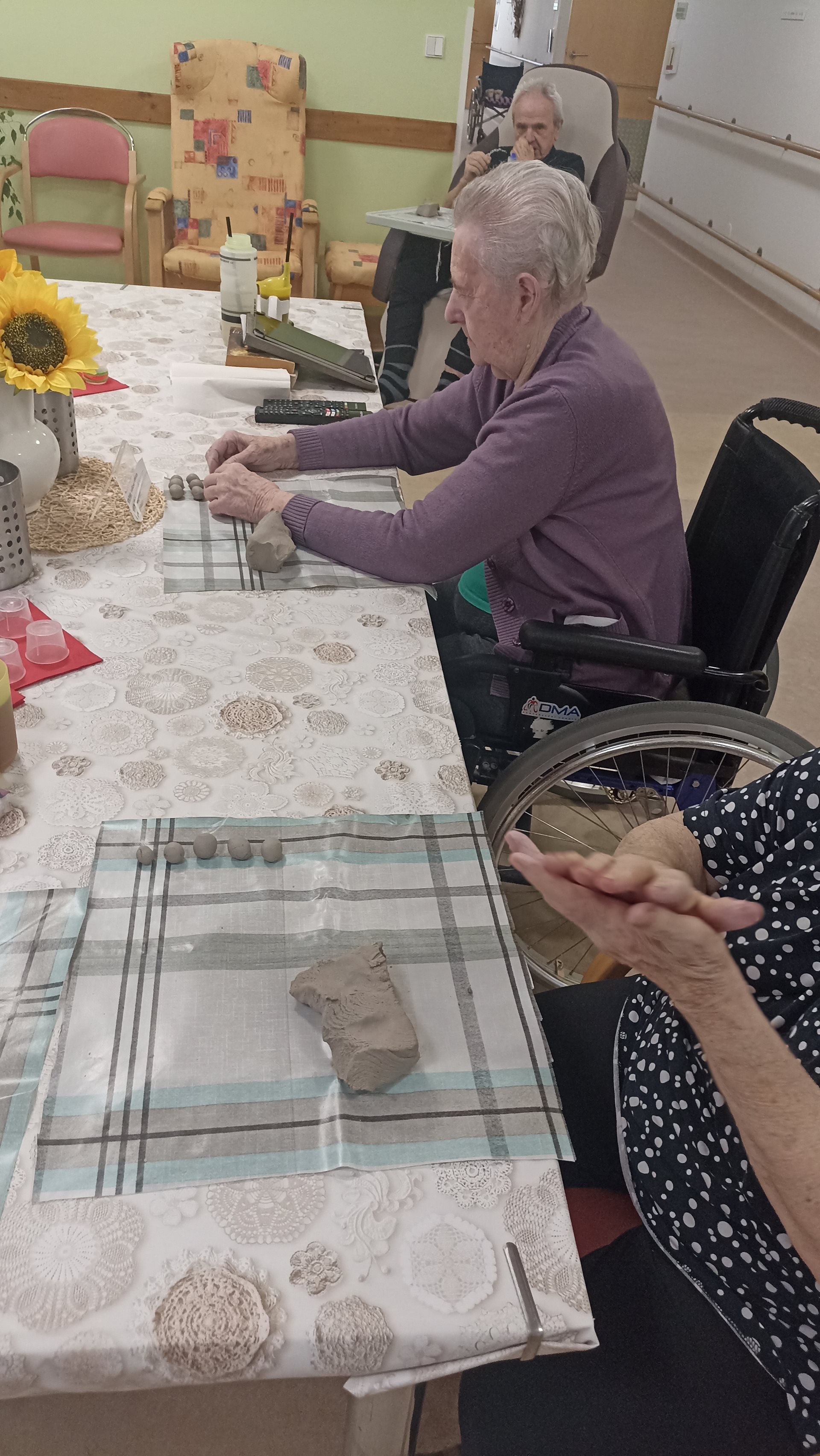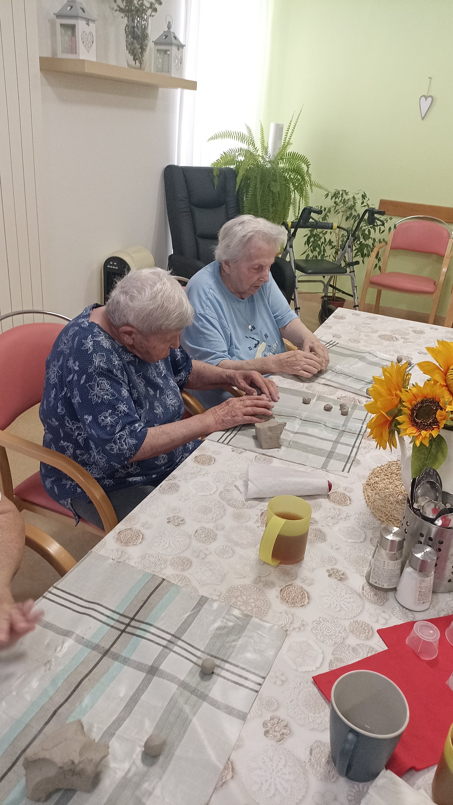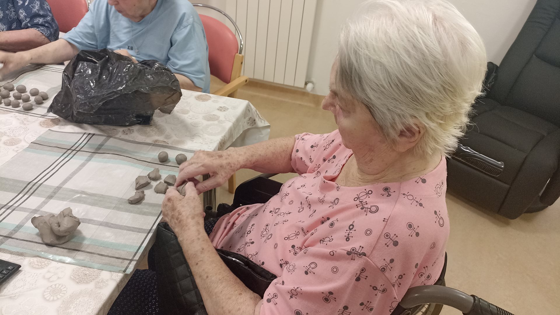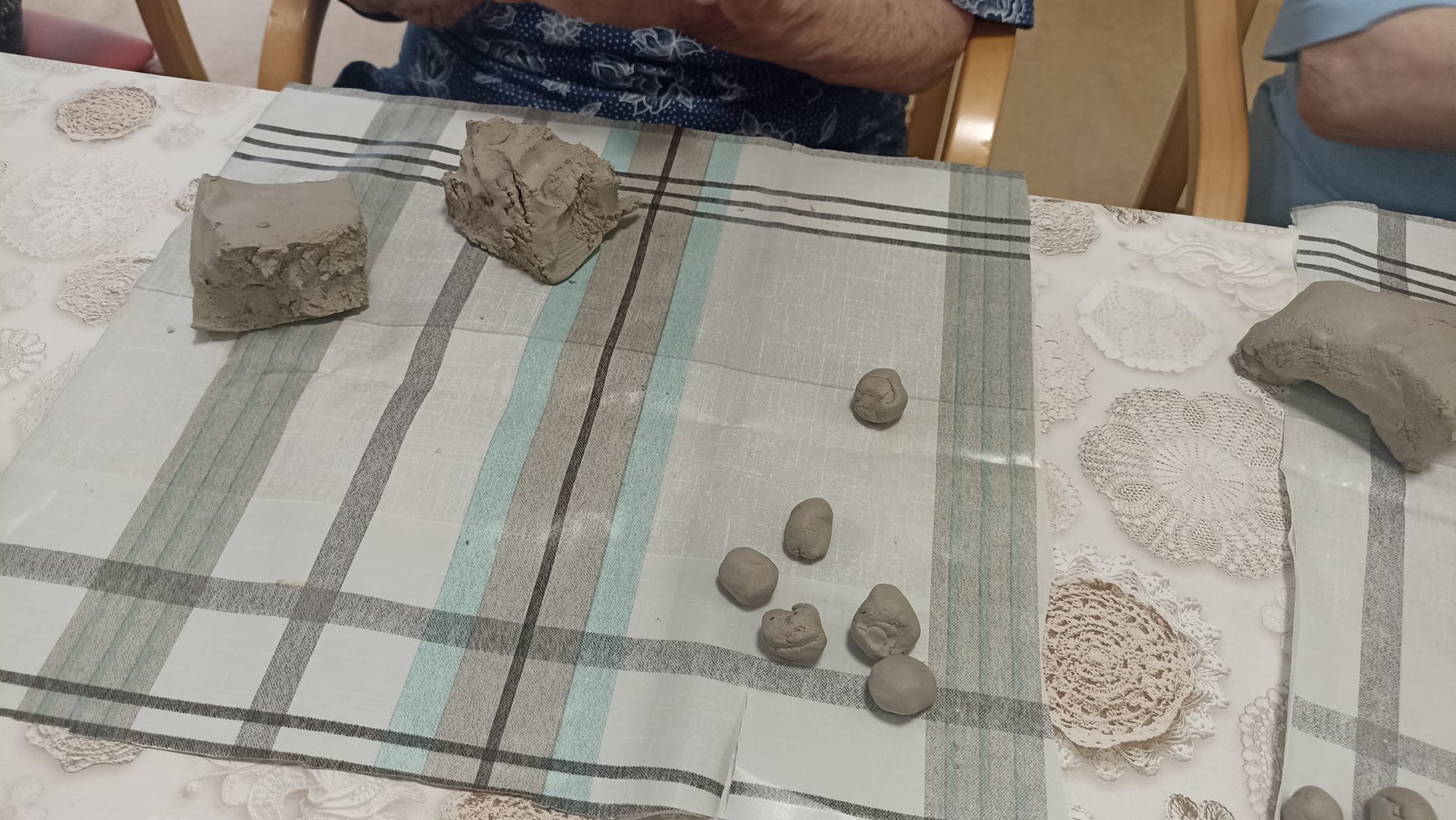 Na našem oddělení jsme si opět užili tvůrčí dopoledne v rámci keramické dílny. Práce s hlínou přináší našim uživatelům nejen radost, ale i možnost procvičit jemnou i hrubou motoriku. Tentokrát jsme se věnovali výrobě malých kuliček, které budou později využity při další keramické tvorbě. Manipulace s hlínou má blahodárný účinek – podporuje cit v prstech, uvolňuje napětí a rozvíjí kreativitu. Současně se při práci často rozproudí vzpomínky na dětství či mládí, kdy byla hlína běžnou součástí her nebo práce na zahradě. Tyto chvíle přirozeně navazují na reminiscenční terapii, která pomáhá posilovat paměť a dobrou náladu. Keramická dílna tak spojuje příjemné s užitečným – naši uživatelé odcházejí s pocitem spokojenosti, že vlastníma rukama vytvořili něco, co bude mít další využití a potěší i ostatní.